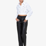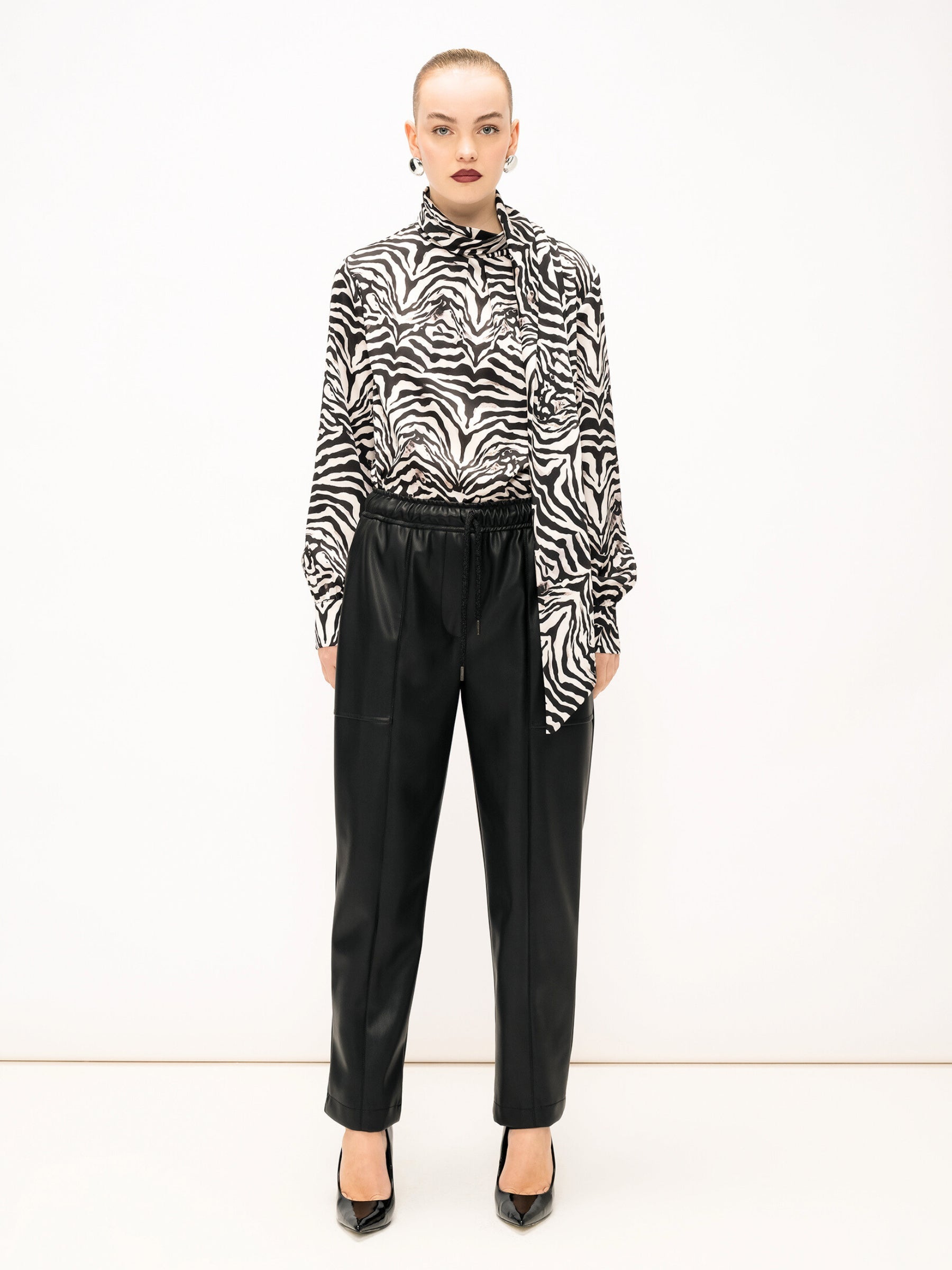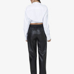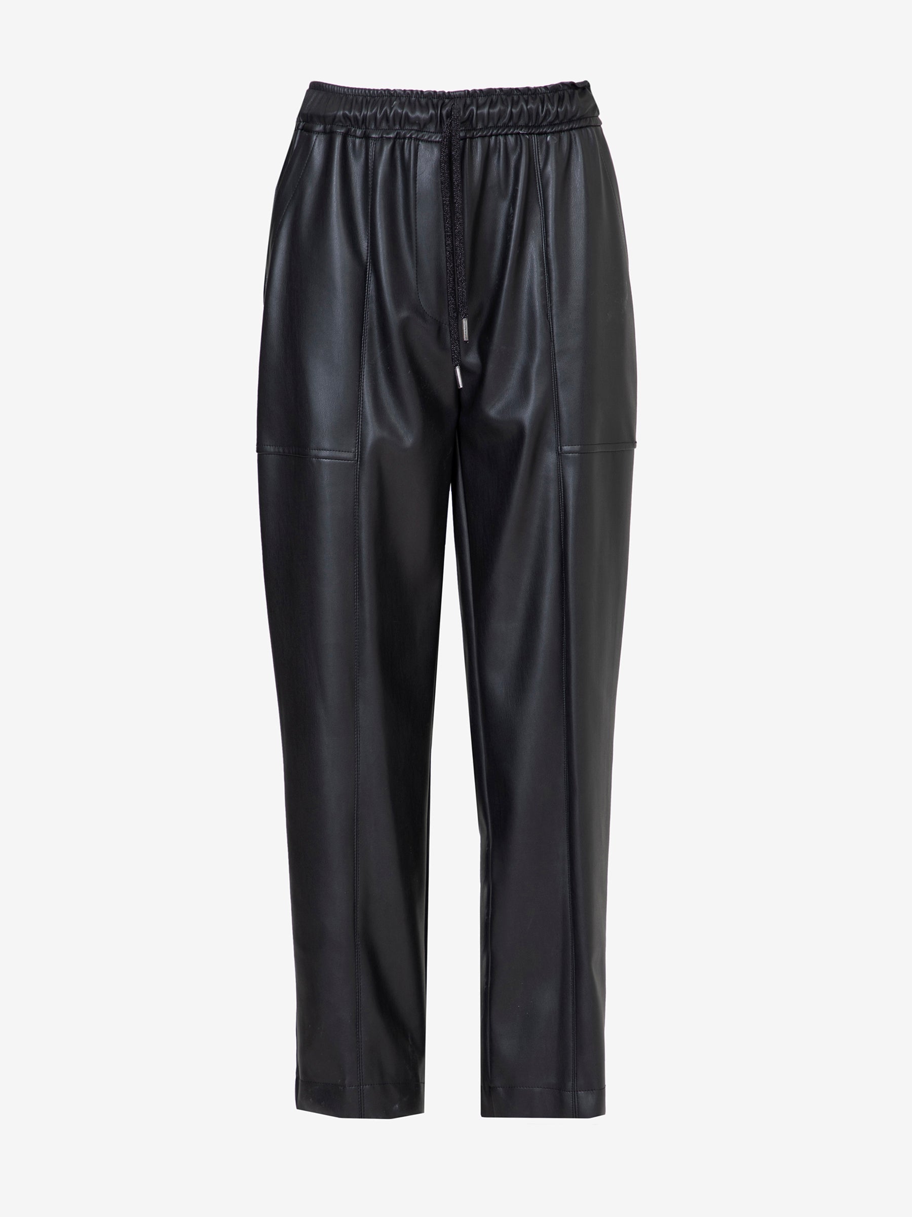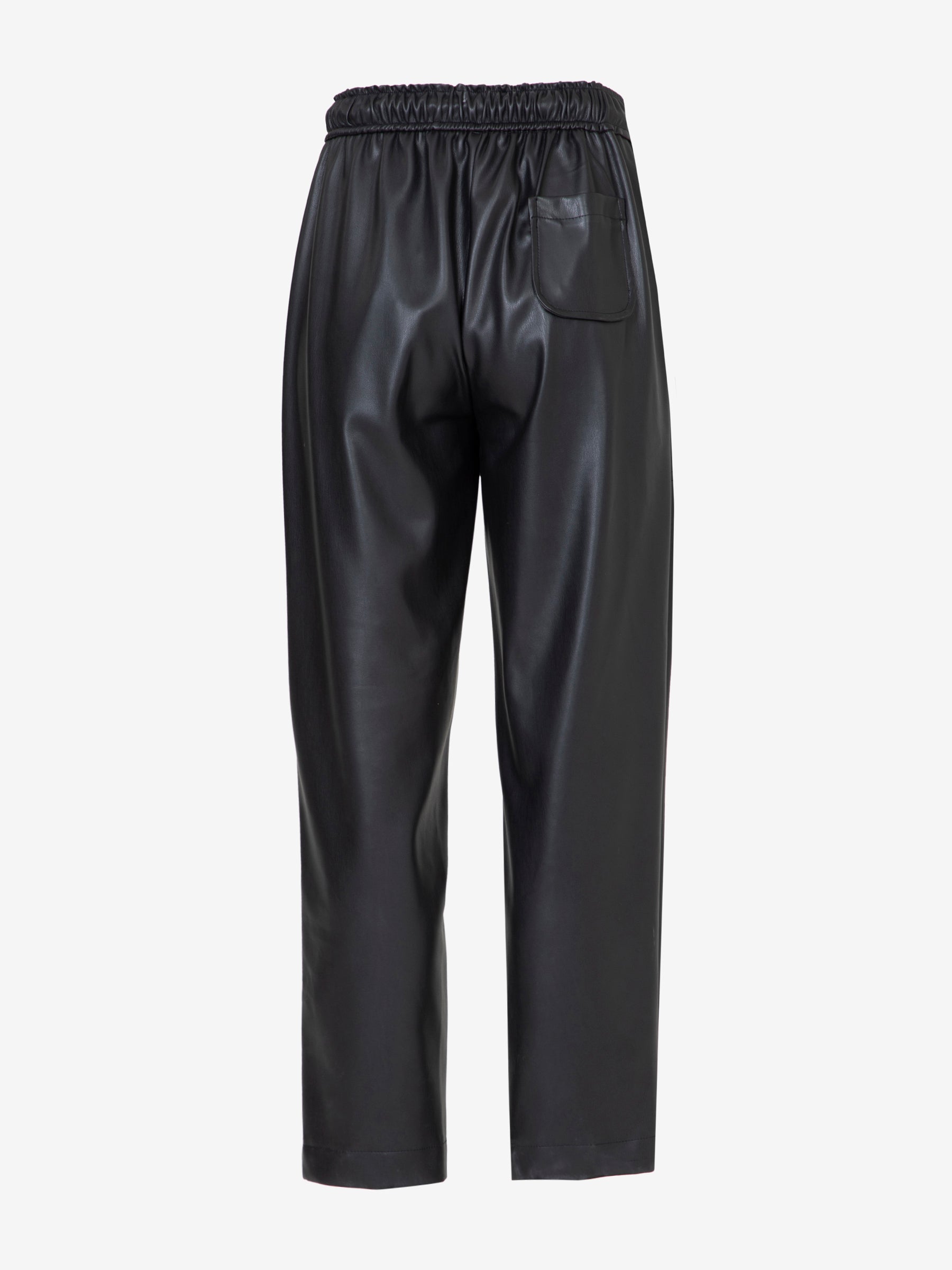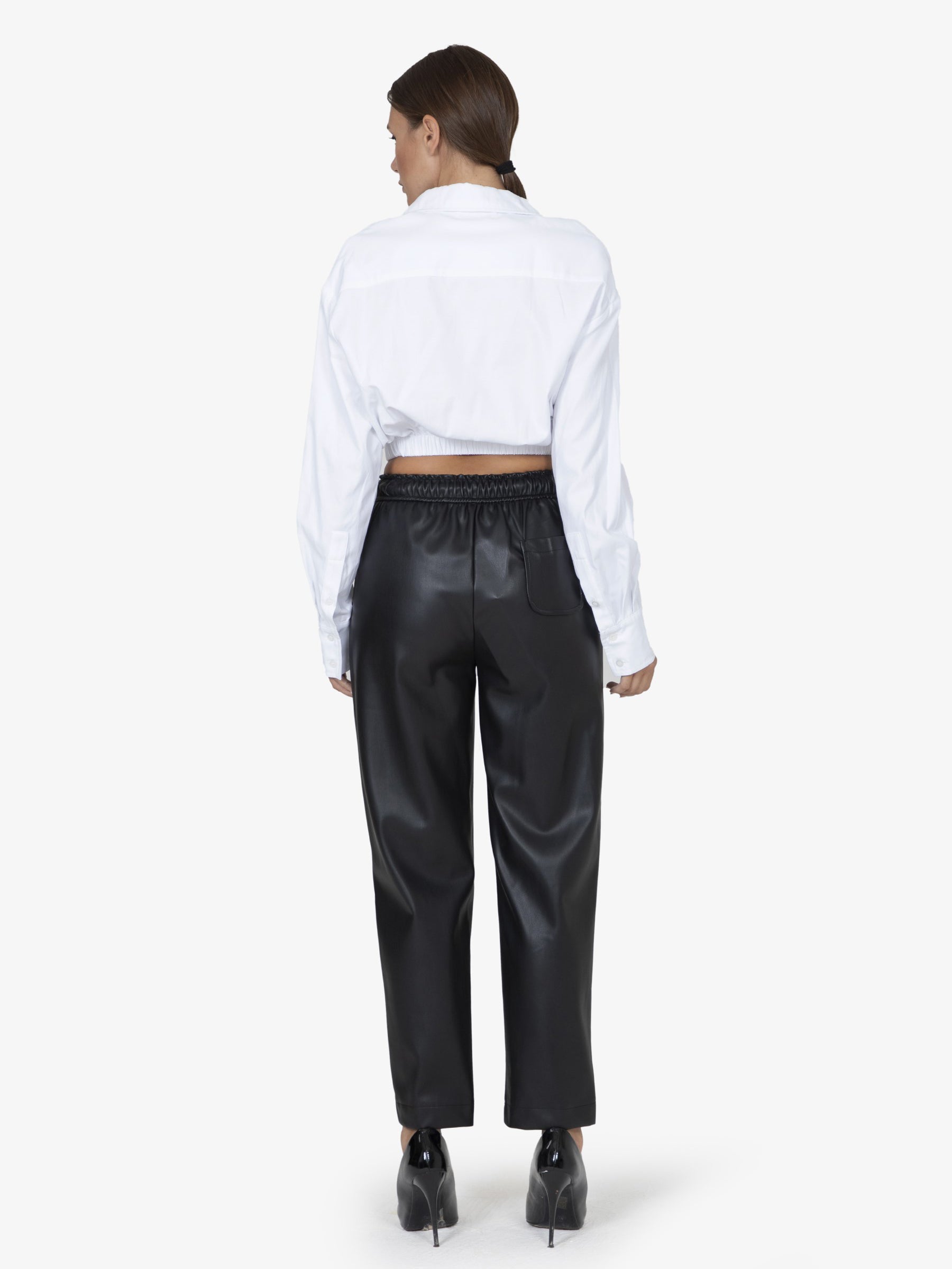 Eleganza audace e comfort inaspettato si fondono in questi pantaloni dal taglio impeccabile. Realizzati interamente in poliuretano di alta qualità, offrono una vestibilità avvolgente e una sensazione lussuosa al tatto. La fodera interna in poliestere garantisce comfort e una silhouette fluida.