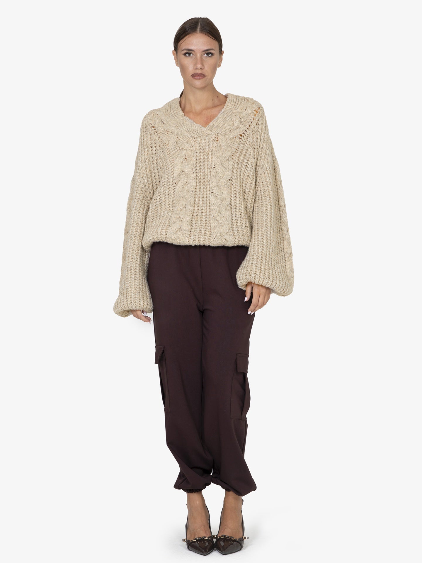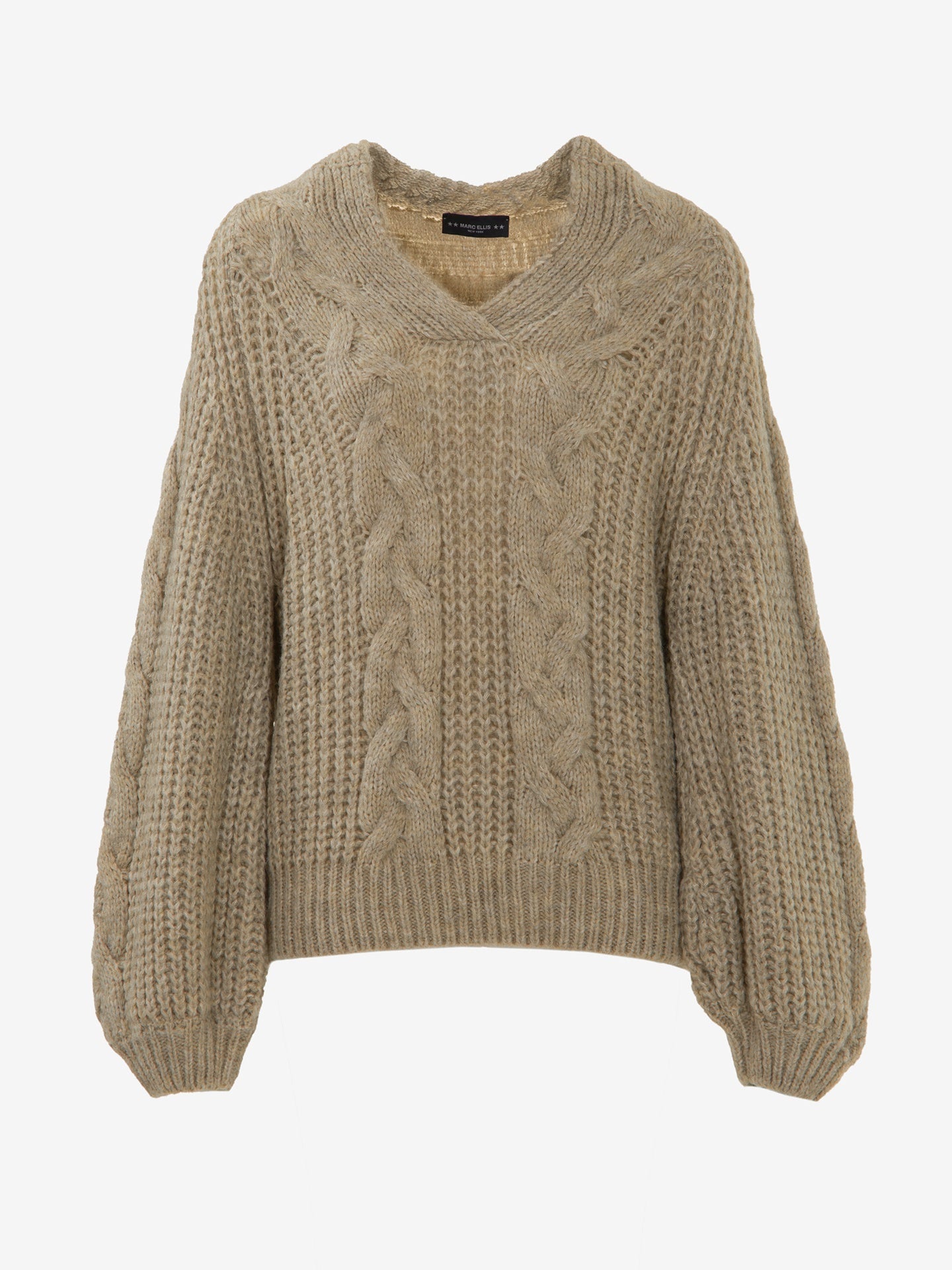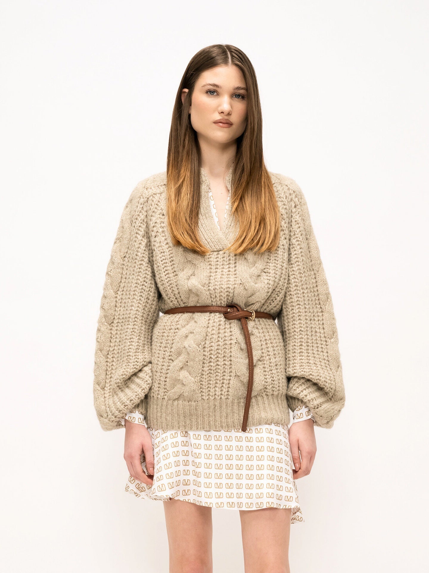 La lavorazione artigianale, un vero fiore all'occhiello del MADE IN ITALY, si traduce in un design unico, caratterizzato da una trama intricata e un taglio che valorizza la silhouette. Le maniche ampie e leggermente a sbuffo aggiungono un tocco di romanticismo e femminilità, rendendo questo maglione un elemento versatile per il tuo guardaroba.