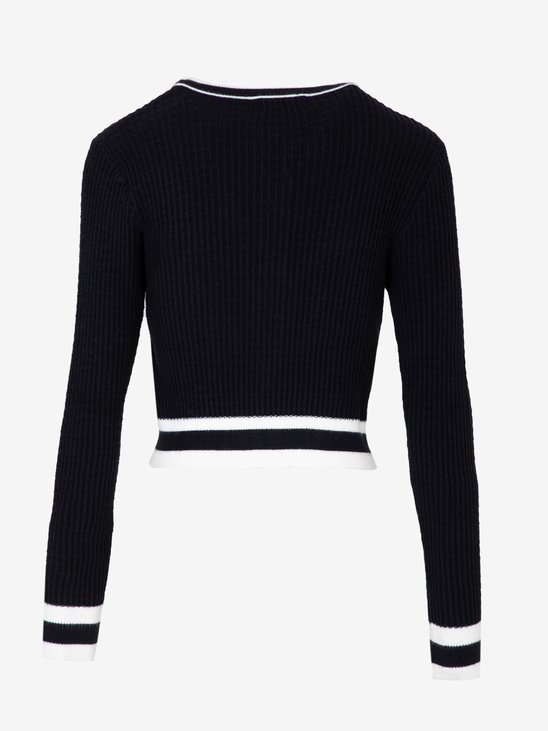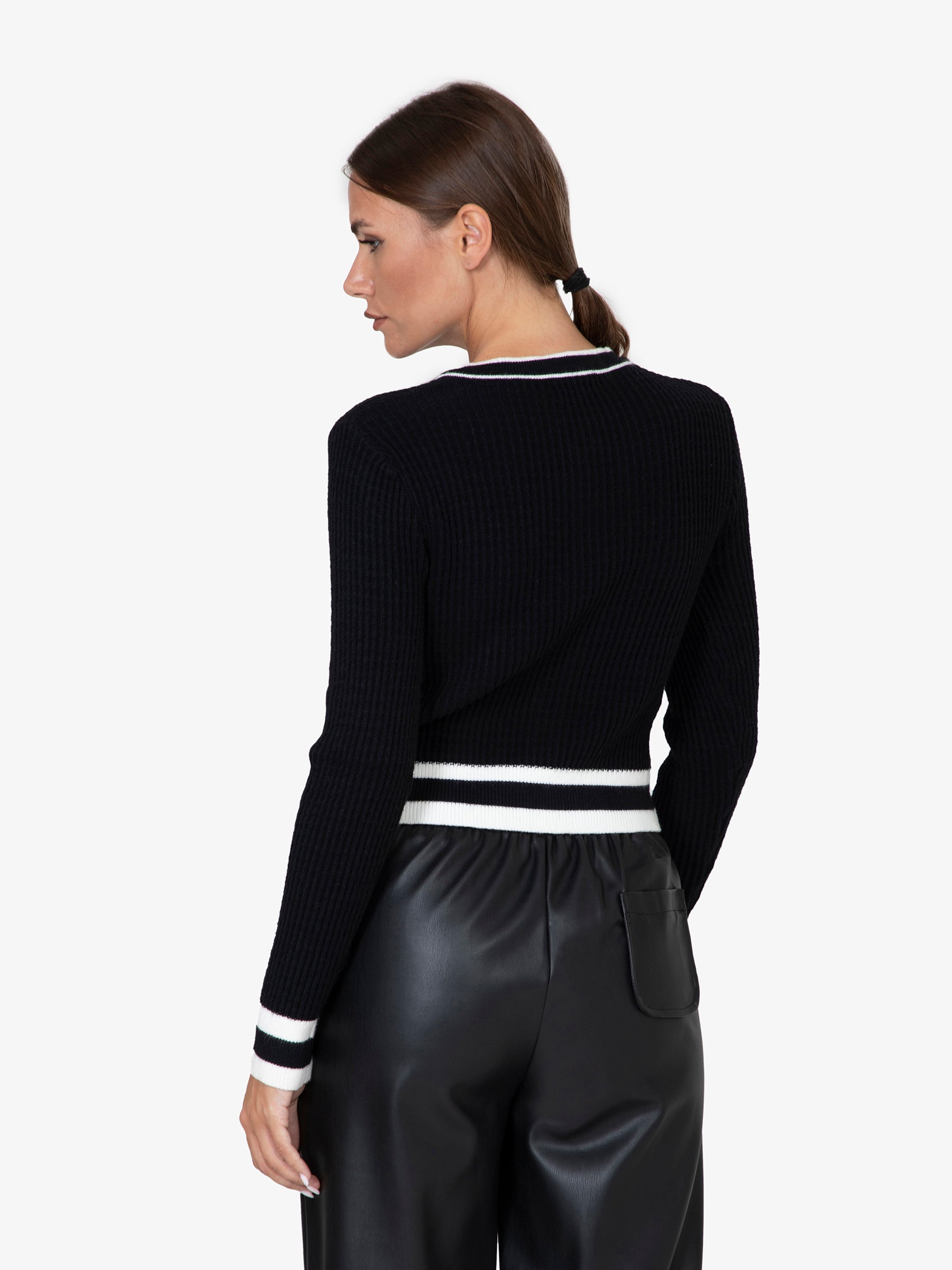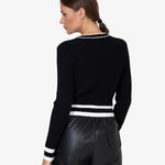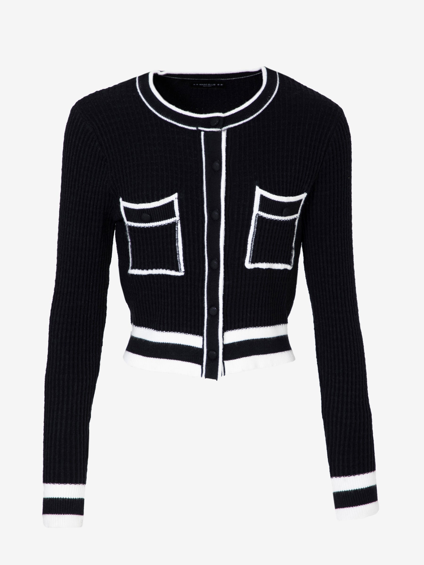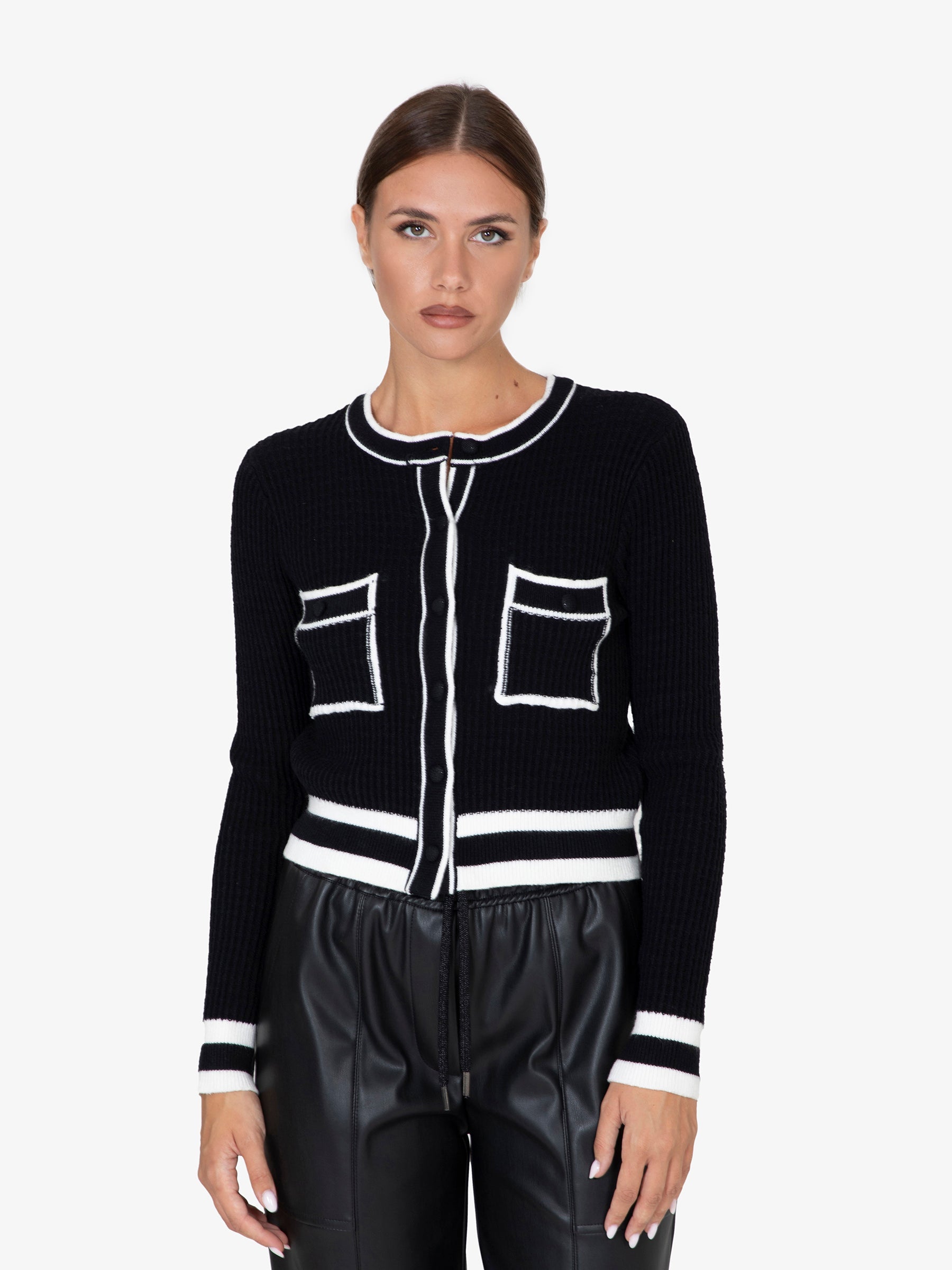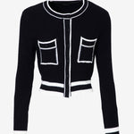Il taglio corto e la silhouette aderente valorizzano la figura, mentre i dettagli a contrasto sulle tasche e lungo la chiusura frontale aggiungono un tocco di stile distintivo e sofisticato. Questo cardigan non è solo un capo d'abbigliamento, ma una vera e propria dichiarazione di moda.