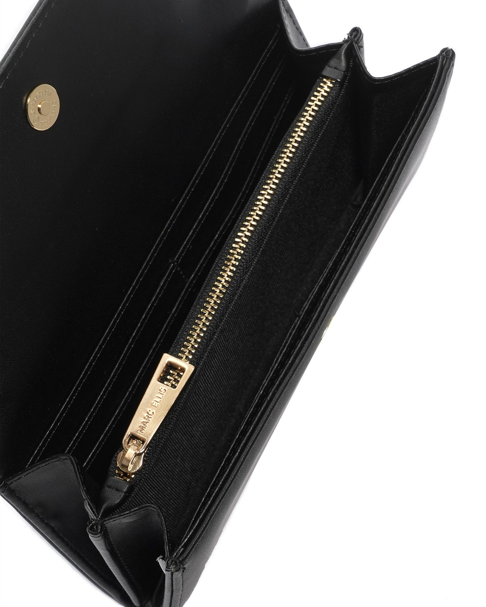 Portafoglio da donna. La chiusura è con bottone magnetico. Le tasche interne sono una zip e portacarte. Le tasche esterne sono assenti. La tracolla è assente. Il manico è assente. Gli scomparti interni sono due. Il materiale esterno è 100% Poliuretanica. Internamente è foderato in poliestere. Misure: 19x11x2,5 cm . Prodotto Fashion