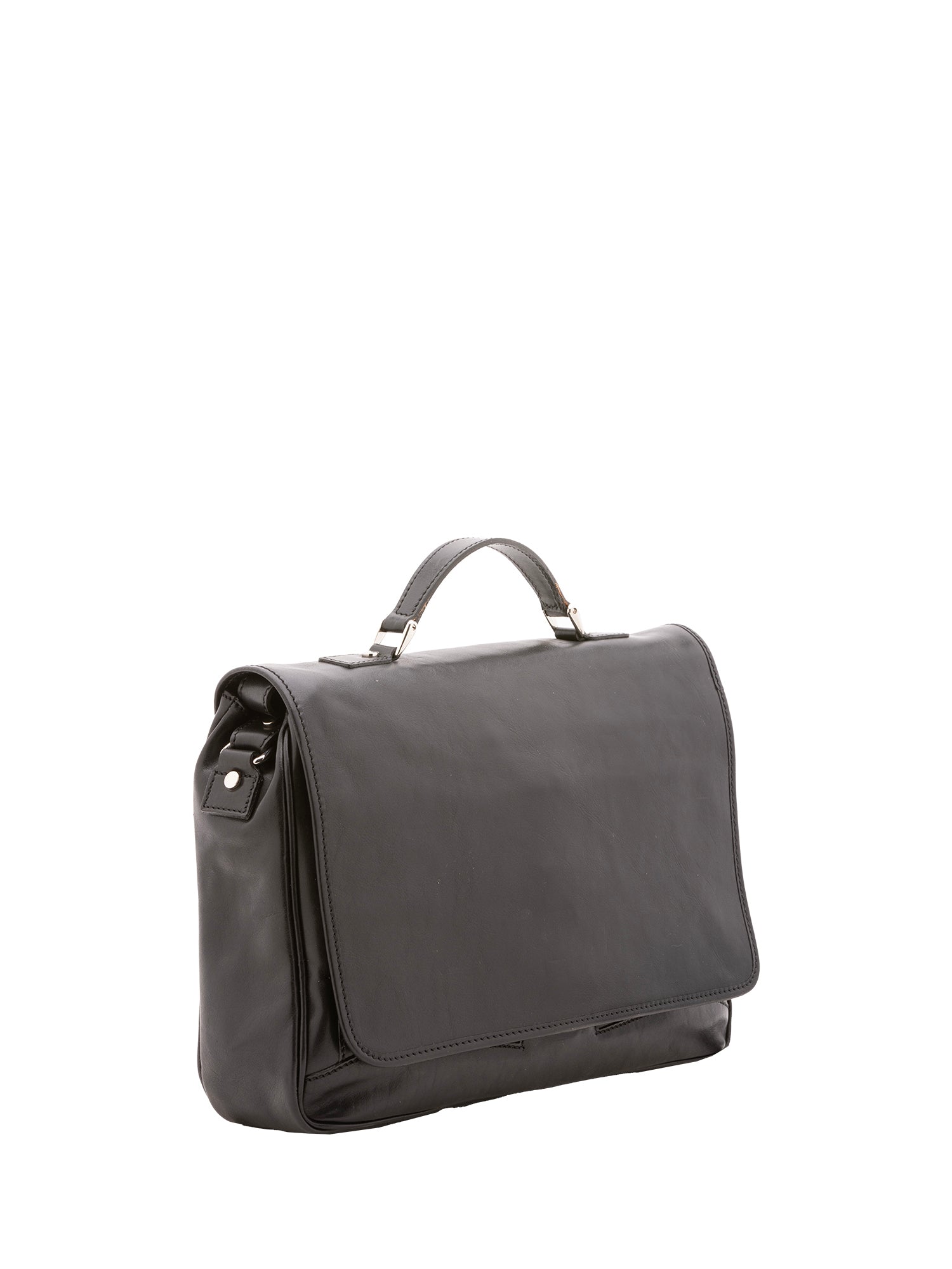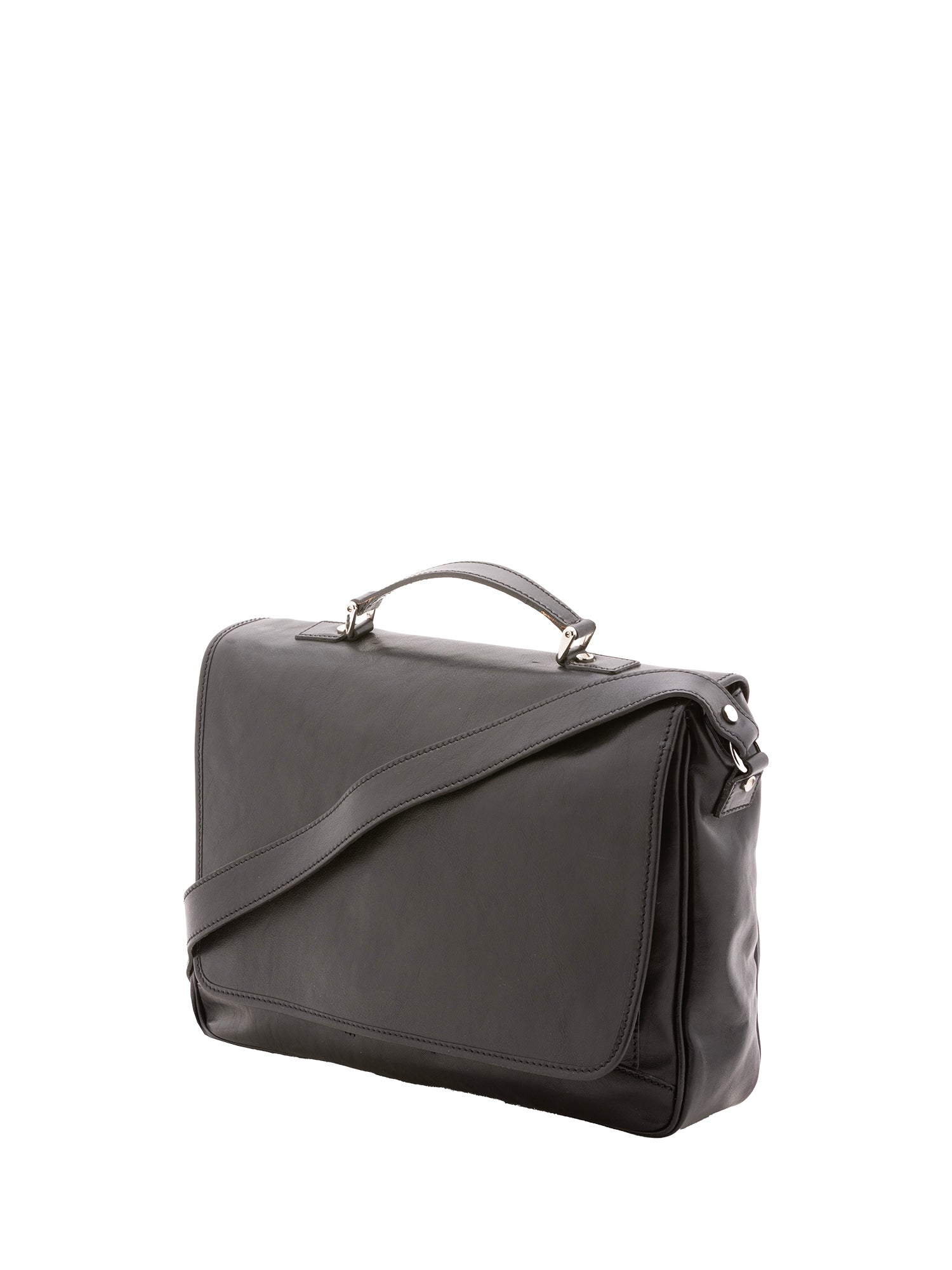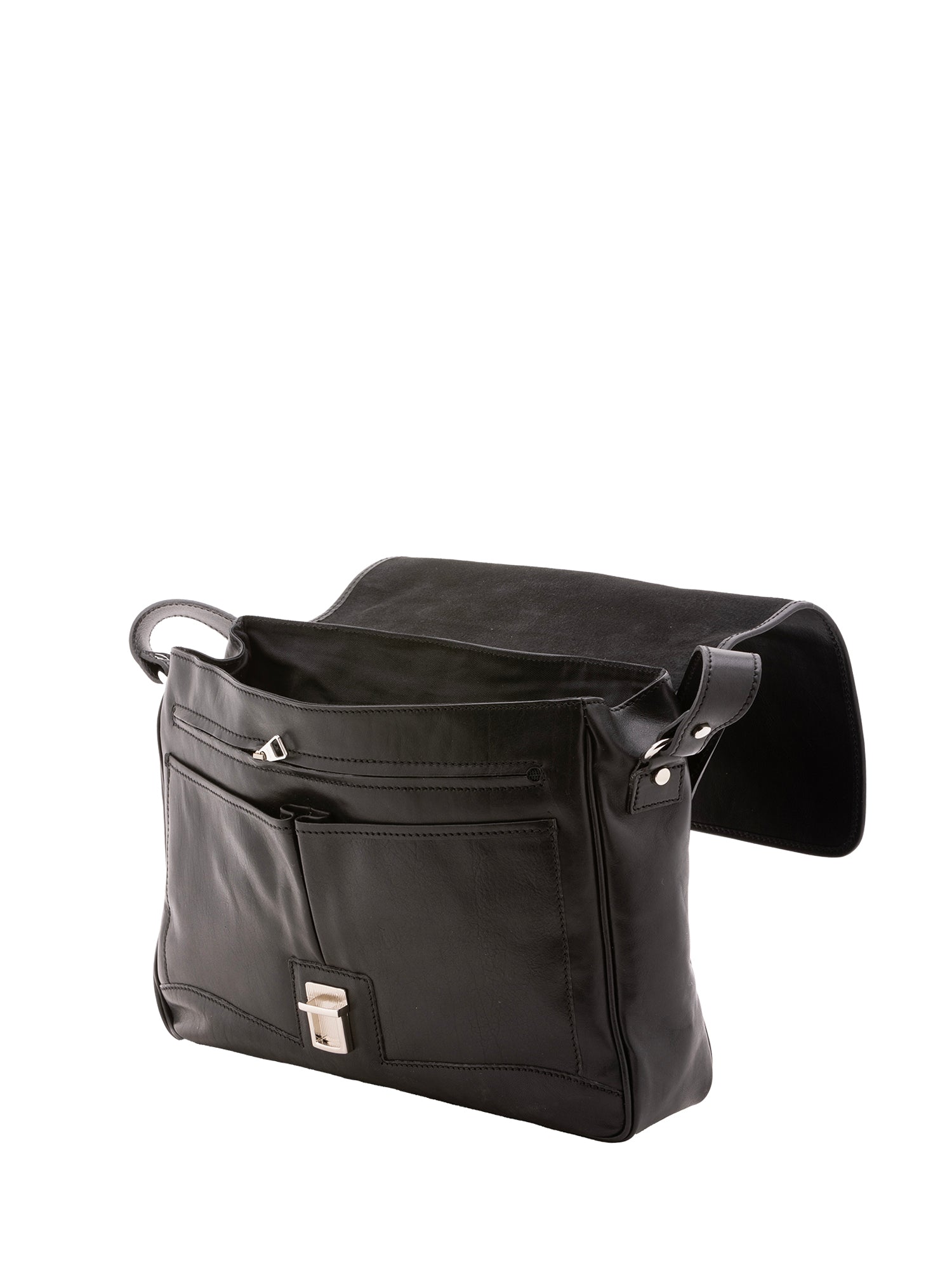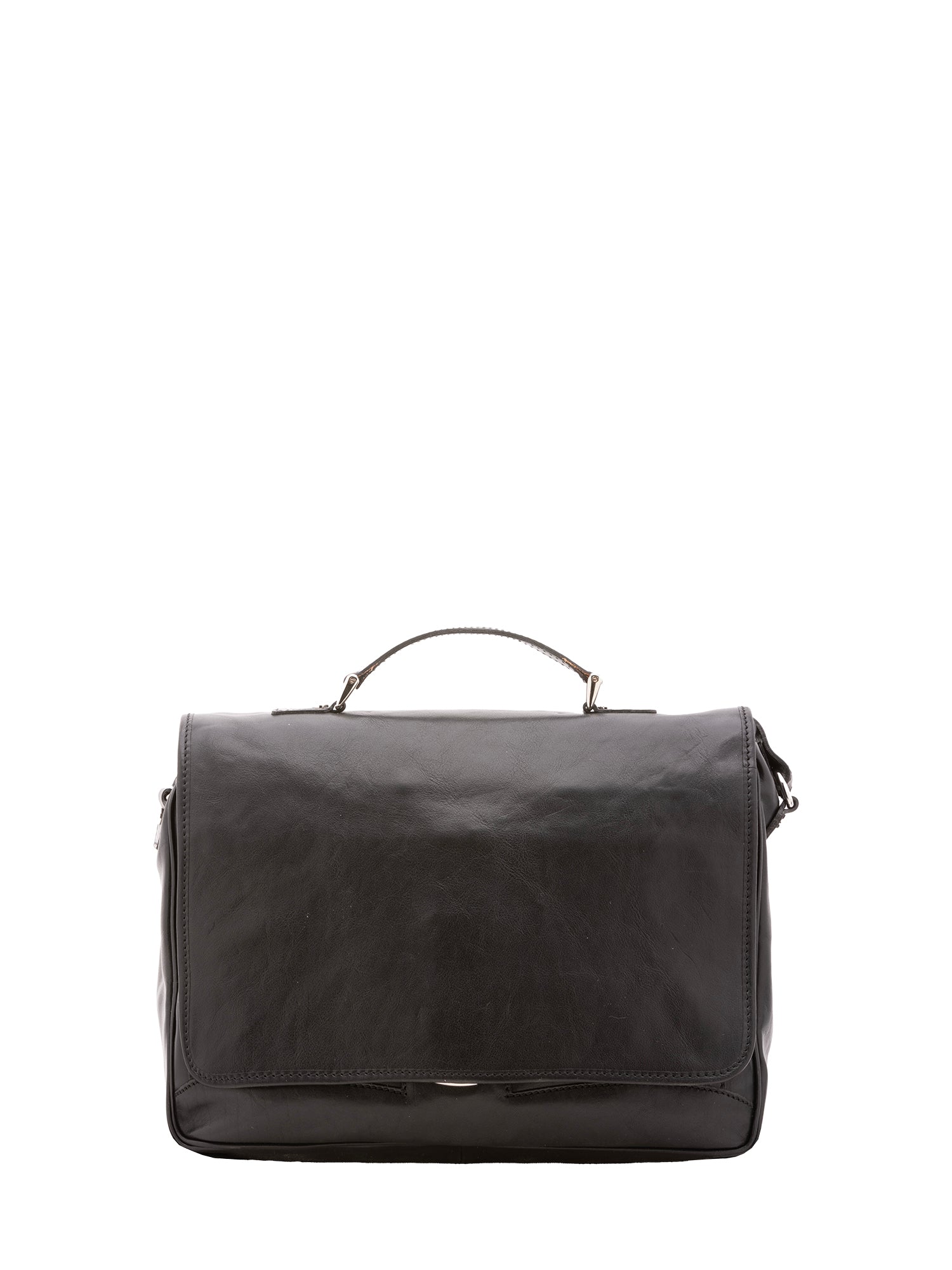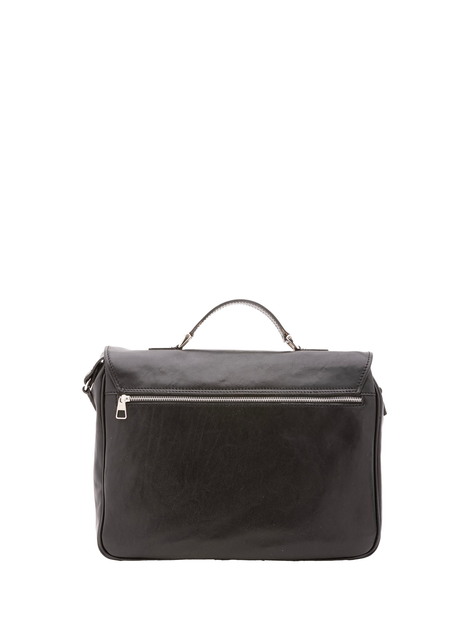 Borsa a mano unisex. La chiusura è con balza in pelle. Le tasche interne sono una con zip. Le tasche esterne sono due anteriori aperte, una anteriore con zi e una posteriore con zip. La tracolla è in pelle. Il manico è in pelle. Gli scomparti interni sono uno. Il materiale esterno è 100% Vera Pelle. Internamente è foderato in cotone. Misure: 40x30x9 cm . Made in Italy