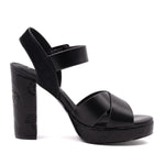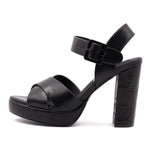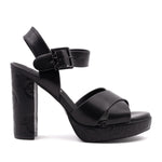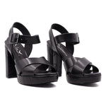 La silhouette è caratterizzata da un tacco robusto e una piattaforma che slanciano la figura senza sacrificare la stabilità. Le cinture, elegantemente intrecciate, avvolgono il piede in modo sicuro e confortevole, garantendo una calzata perfetta. La chiusura a cinturino permette di regolare l'aderenza, adattandosi a diverse forme del piede.