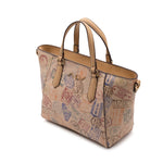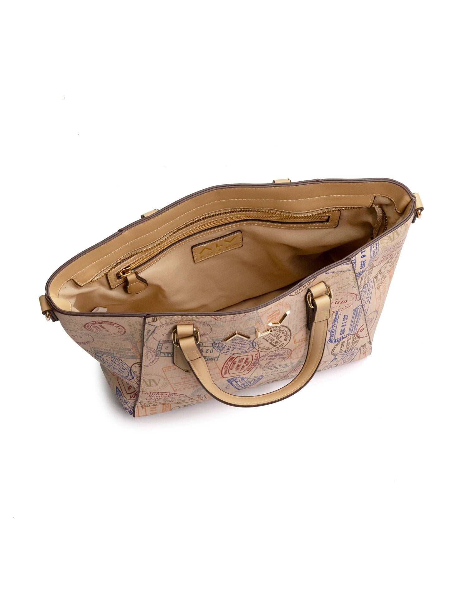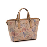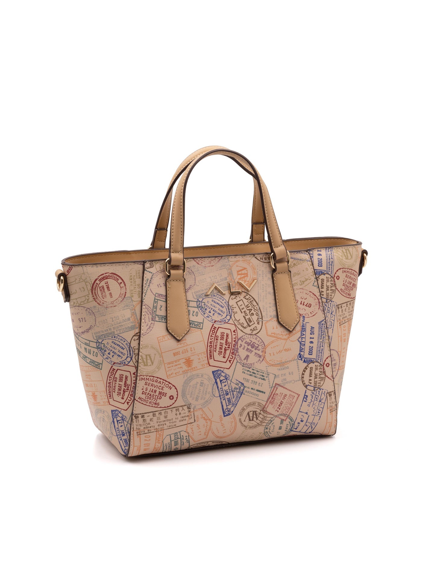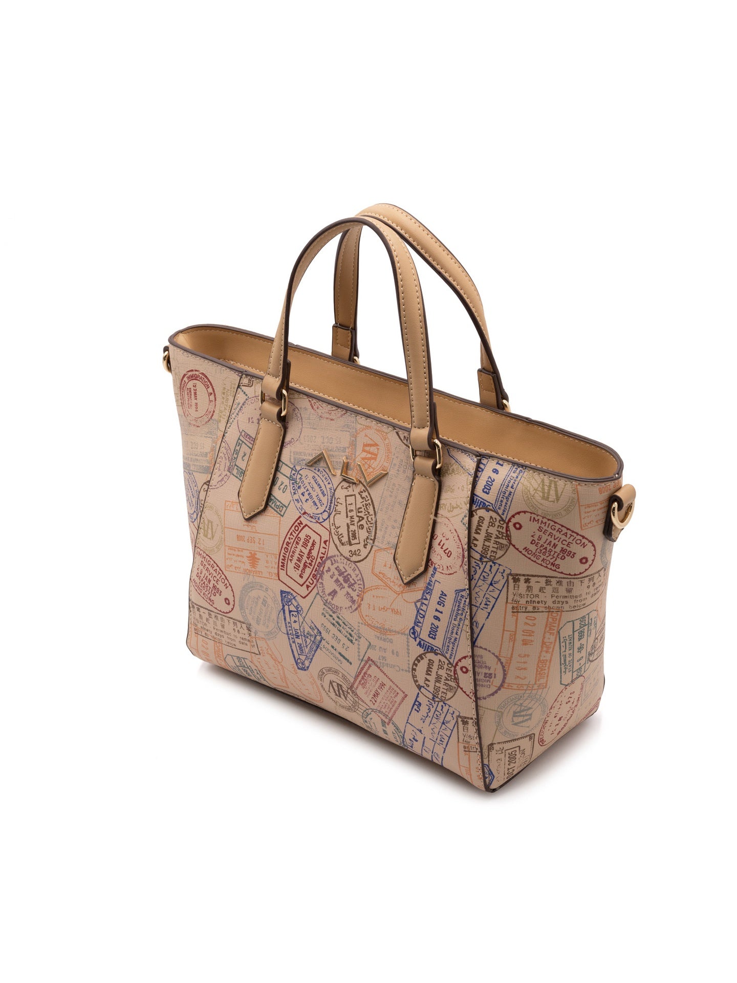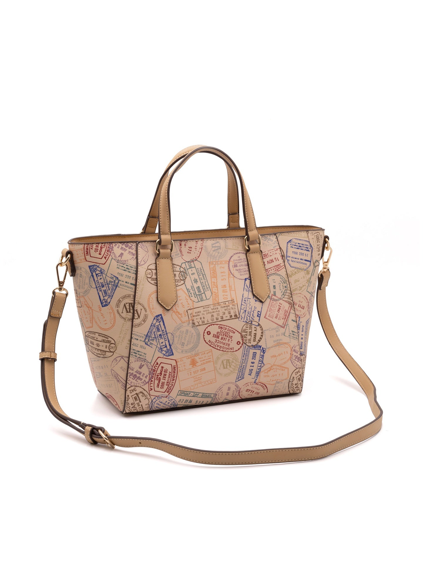 Un tocco di avventura e stile per il tuo quotidiano. Questa borsa a mano è l'accessorio perfetto per chi ama viaggiare con la mente e portare con sé un pizzico di originalità. Realizzata in 100% poliuretano di alta qualità, questa borsa unisce resistenza e un look distintivo, grazie alla stampa che ricorda i timbri da viaggio.