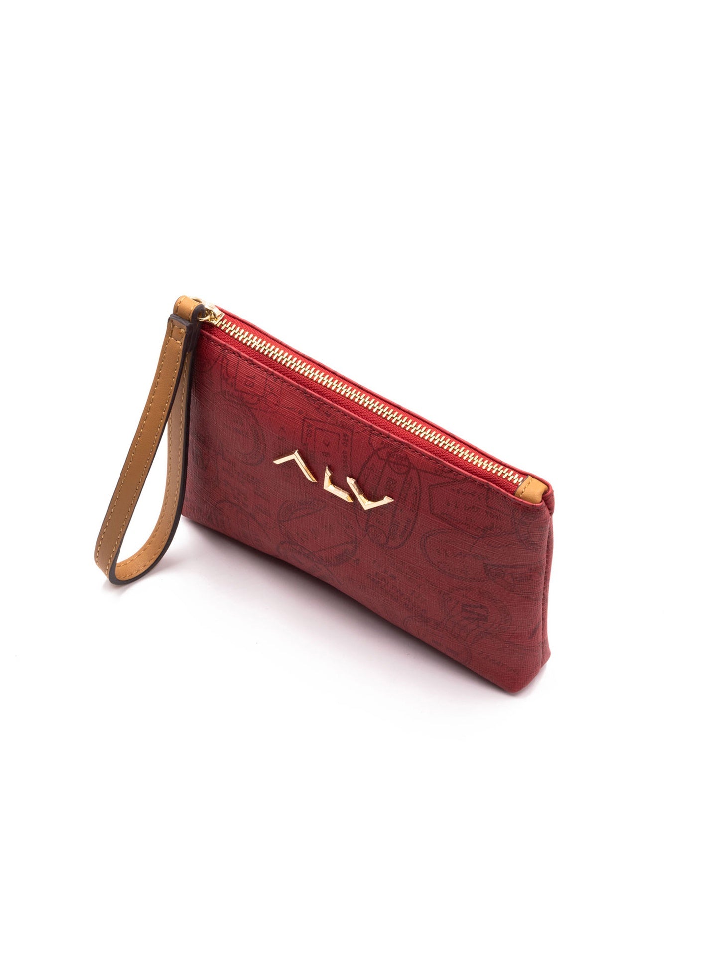Un tocco di avventura e stile per il tuo look quotidiano. Questa pochette è l'accessorio perfetto per chi ama distinguersi con un tocco originale e ricercato. Realizzata in 100% poliuretano di alta qualità, la sua superficie è decorata con un affascinante motivo che ricorda i timbri di viaggio, evocando atmosfere esotiche e ricordi di avventure lontane.