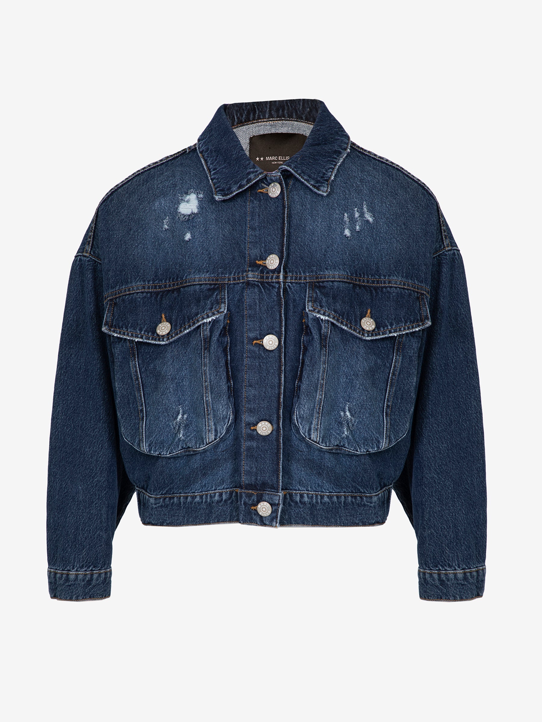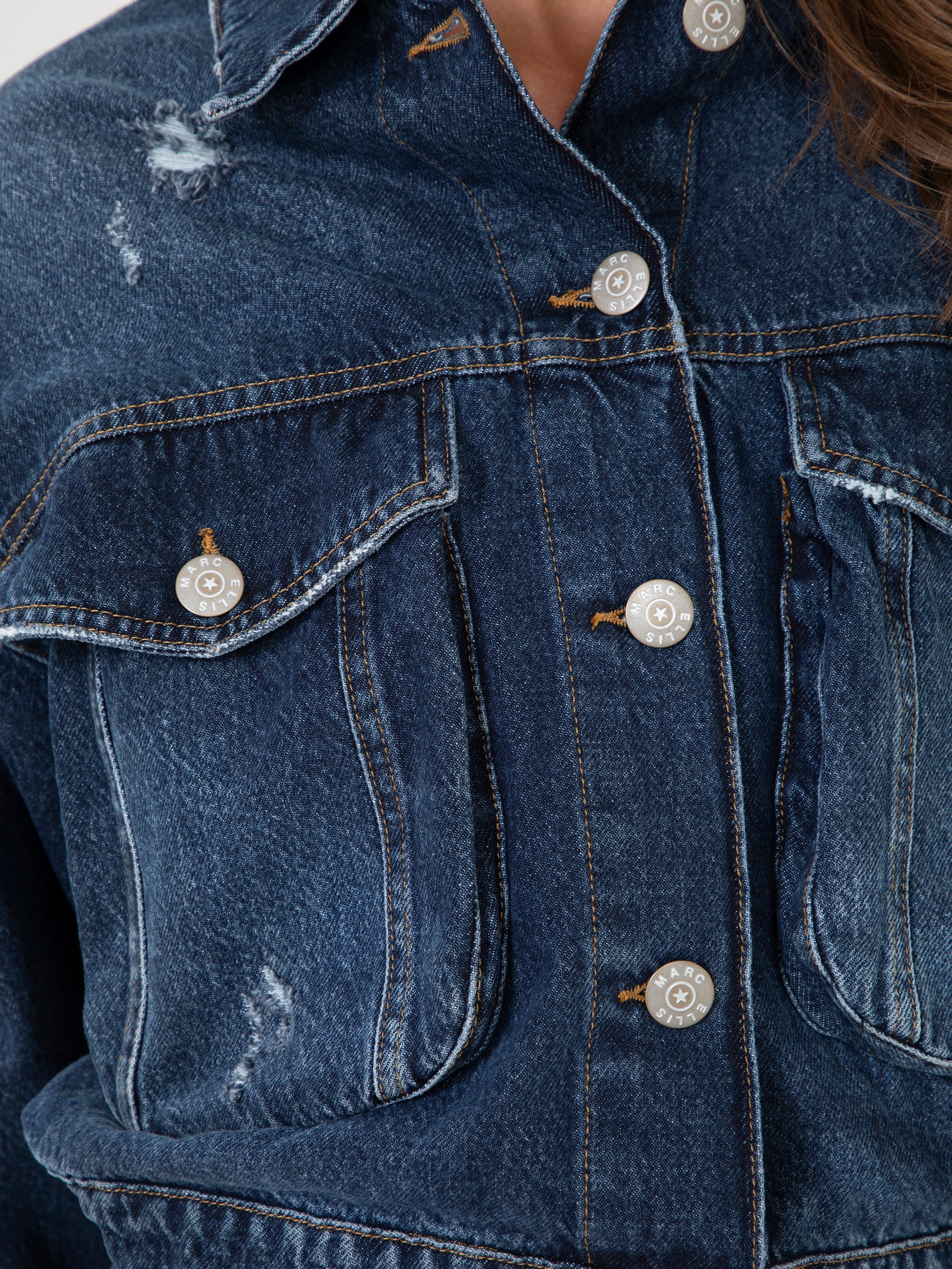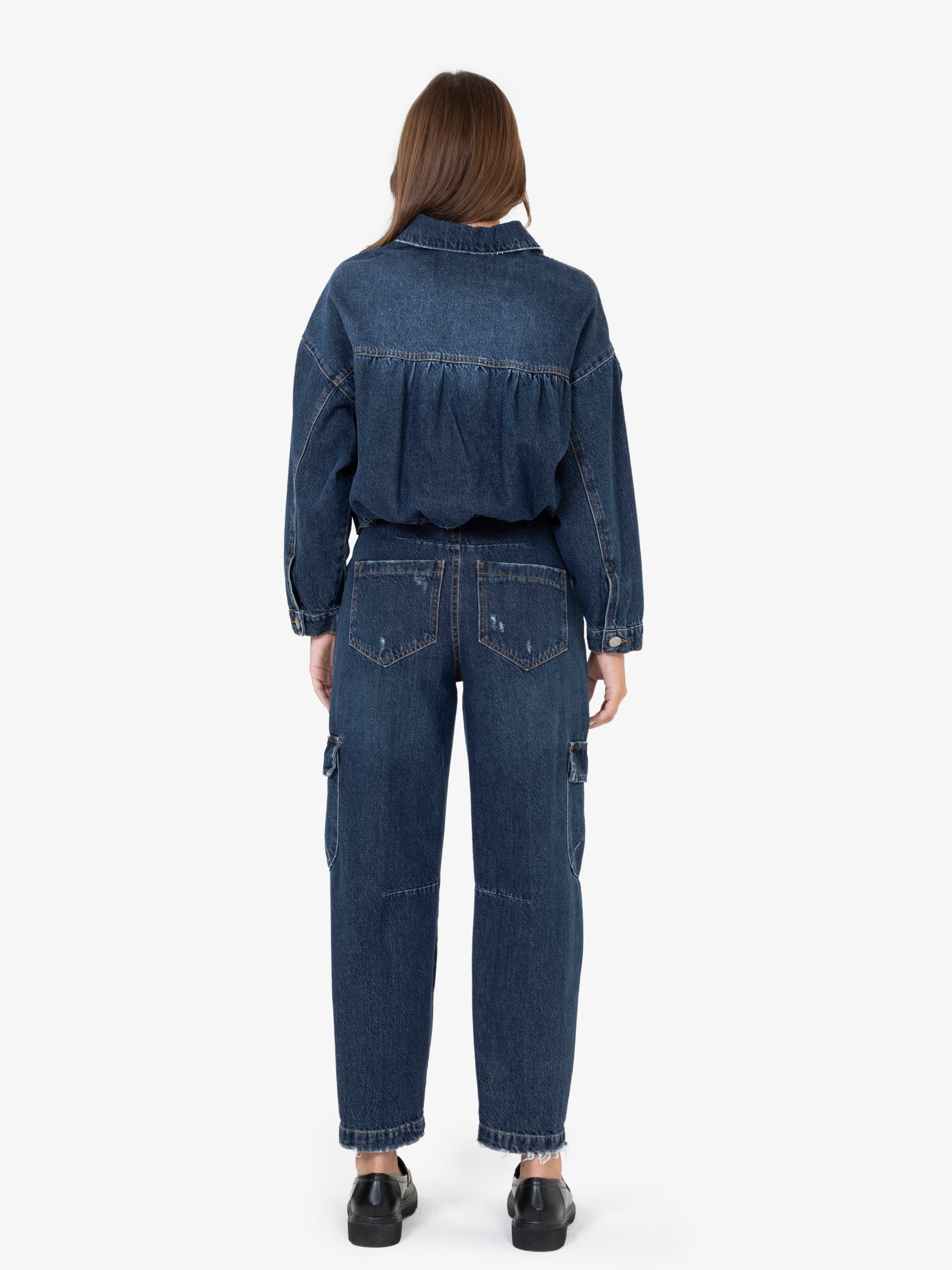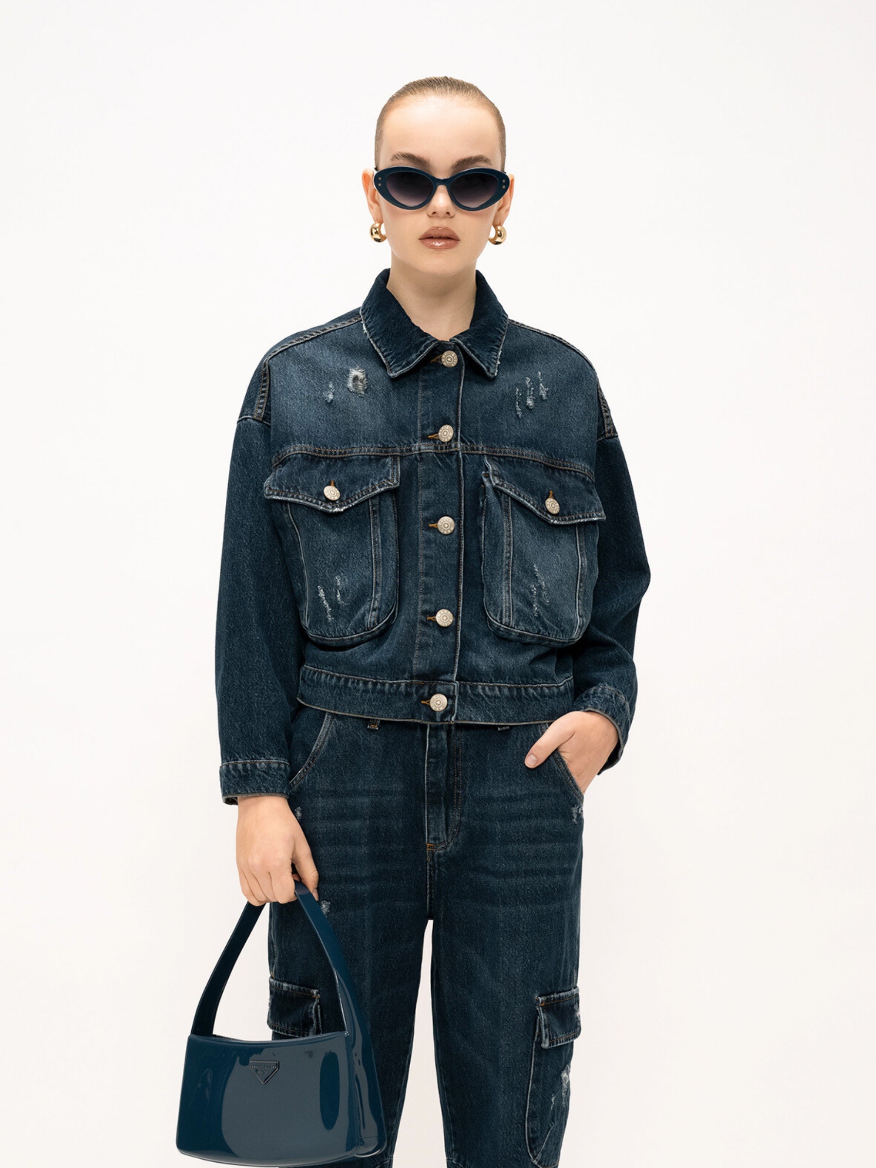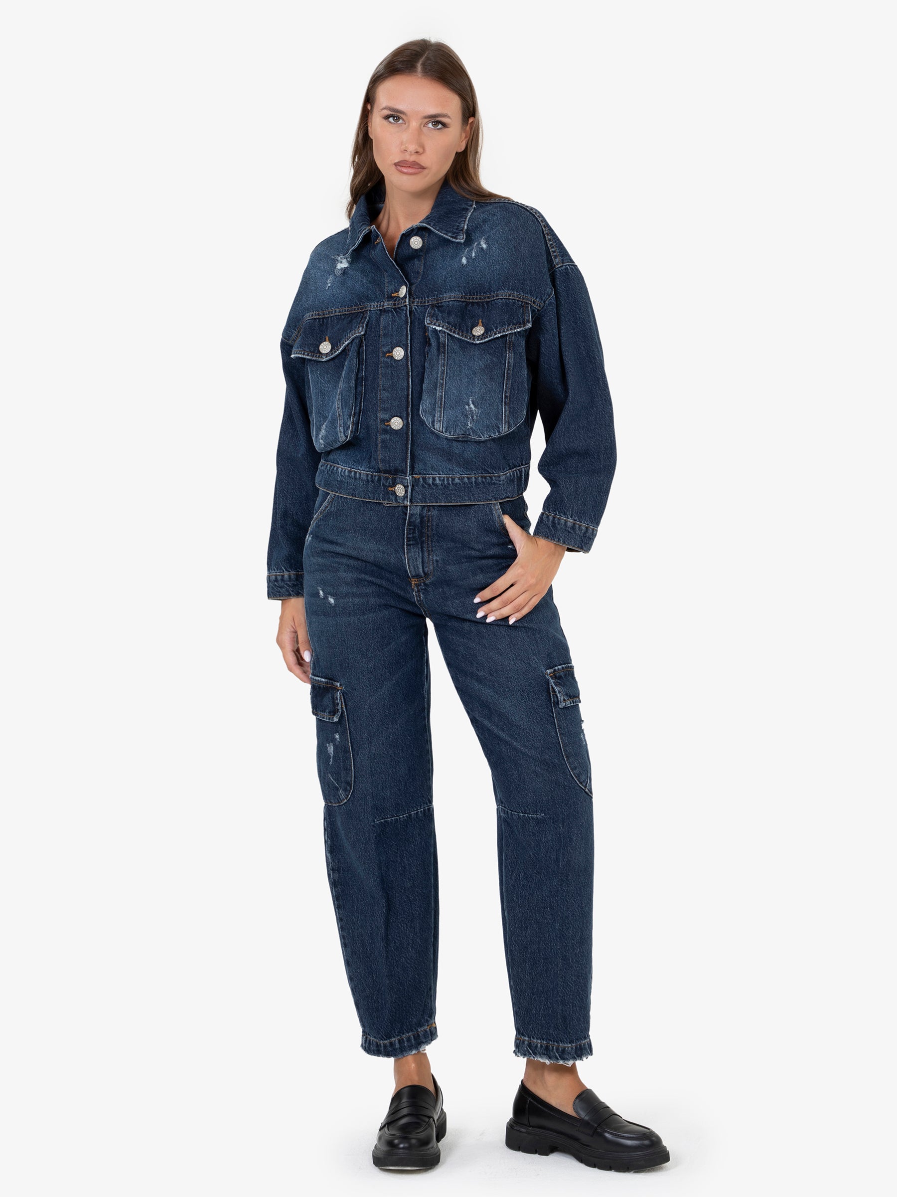 Il design presenta un taglio sartoriale, leggermente corto, che si adatta perfettamente a diverse silhouette. L'aspetto vissuto, con dettagli leggermente sfilacciati, conferisce un tocco di carattere e autenticità. Le tasche applicate aggiungono un tocco funzionale e un'estetica casual-chic.