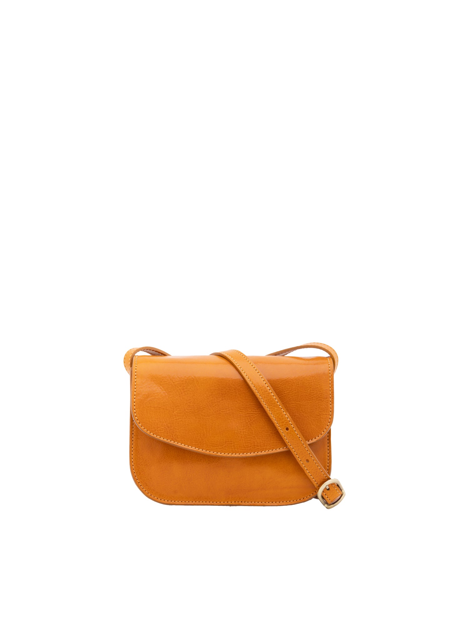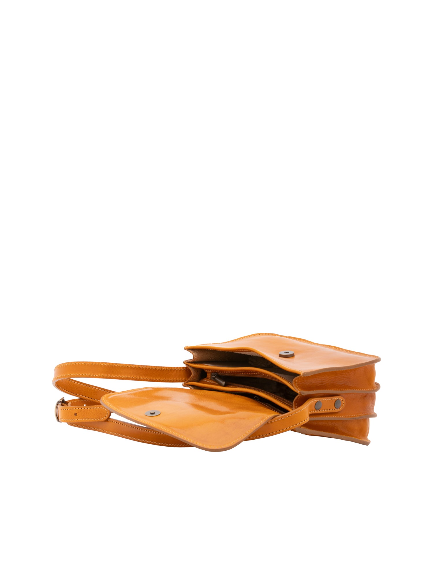 Borsa a tracolla da donna. La chiusura è con calamita. Le tasche interne sono una con zip. Le tasche esterne sono una posteriore con zip. La tracolla è regolabile in pelle. Il manico è assente. Gli scomparti interni sono tre. Il materiale esterno è vera pelle vacchetta. Internamente è foderato in cotone. Misure: 22x16x9,5 cm . Made in Italy