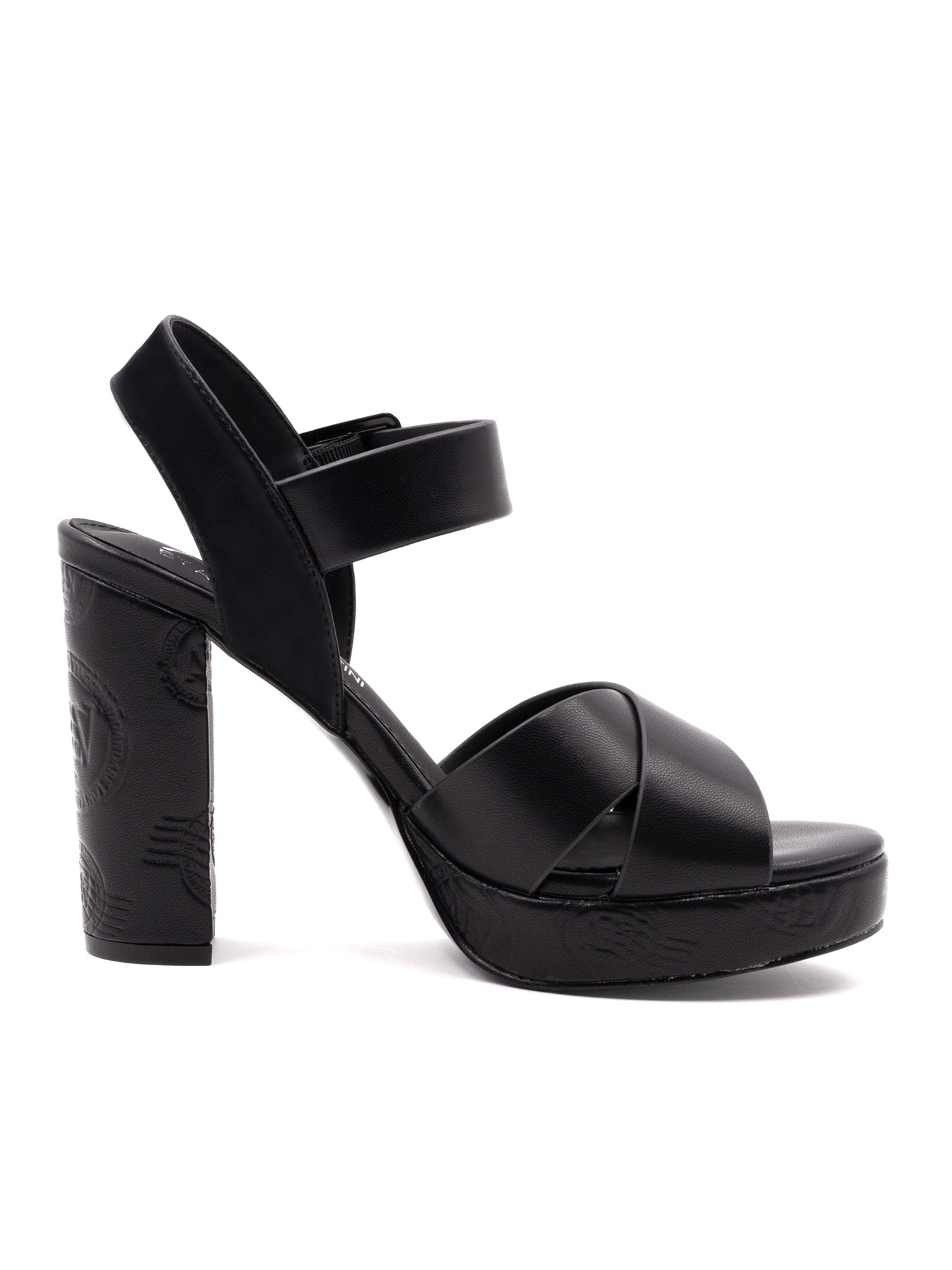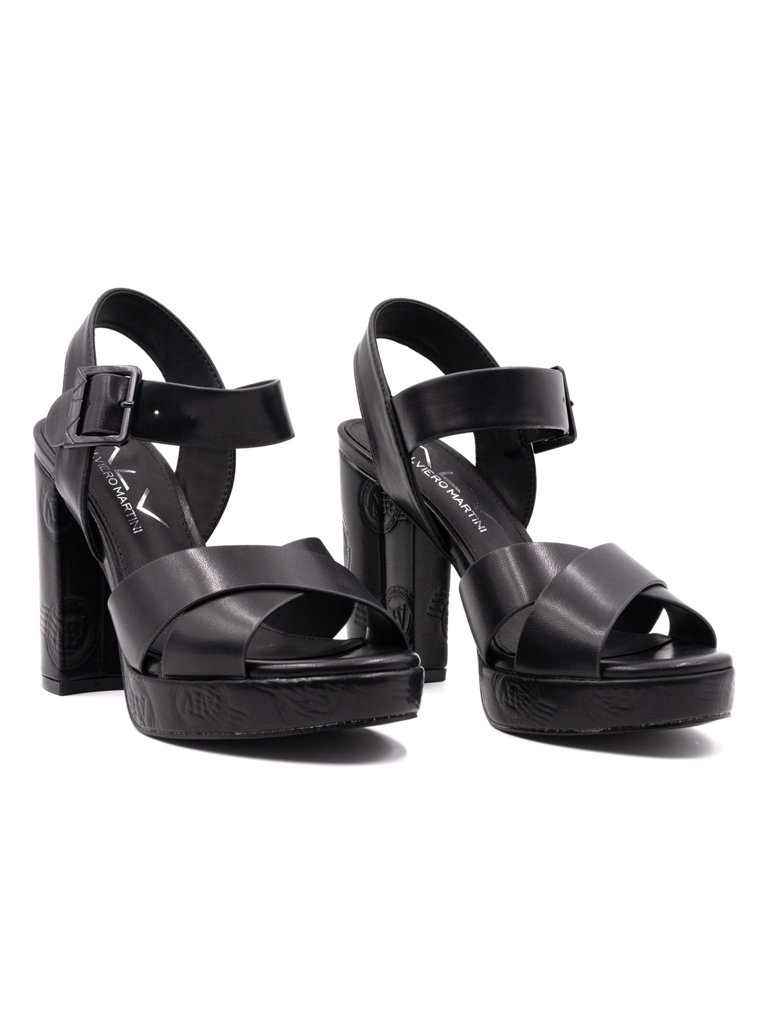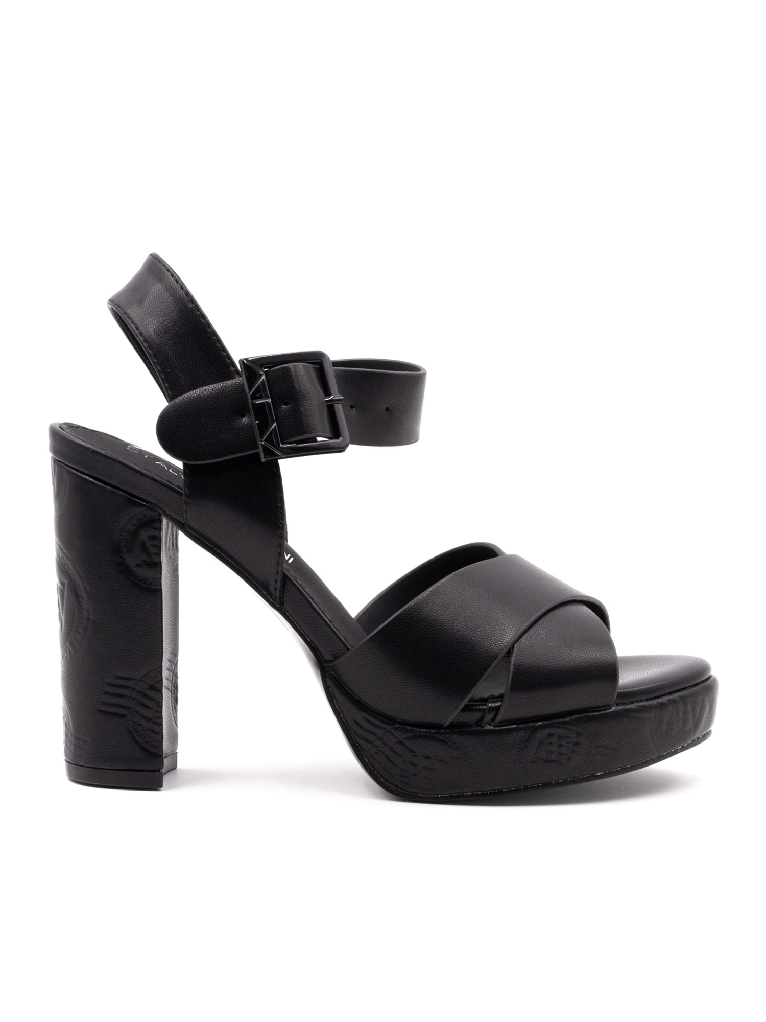 La silhouette è caratterizzata da un tacco robusto e una piattaforma che slanciano la figura senza sacrificare la stabilità. Le cinture, elegantemente intrecciate, avvolgono il piede in modo sicuro e confortevole, garantendo una calzata perfetta. La chiusura a cinturino permette di regolare l'aderenza, adattandosi a diverse forme del piede.