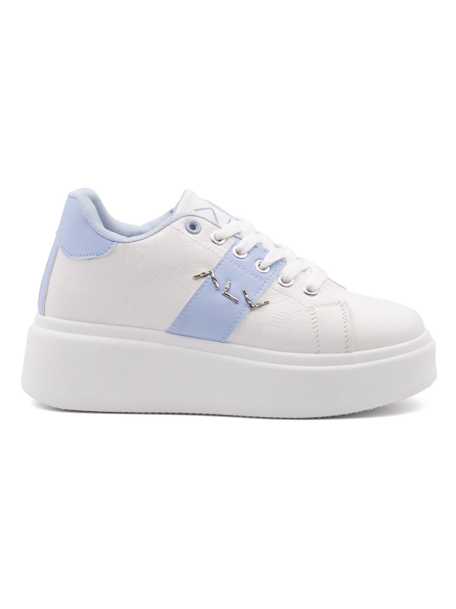 Il contrasto cromatico tra il bianco luminoso e gli accenti azzurri dona un tocco di originalità, rendendo queste scarpe un vero e proprio accessorio fashion. La chiusura con lacci assicura una calzata personalizzata e confortevole, mentre la suola platform aggiunge un tocco moderno e slanciato.