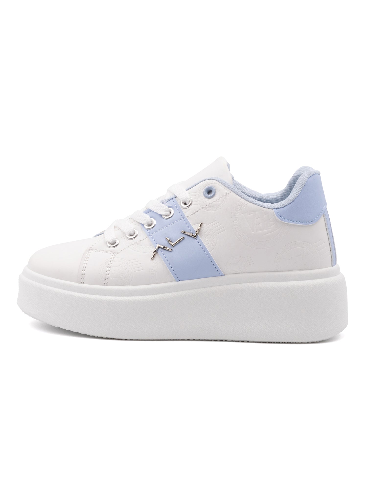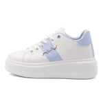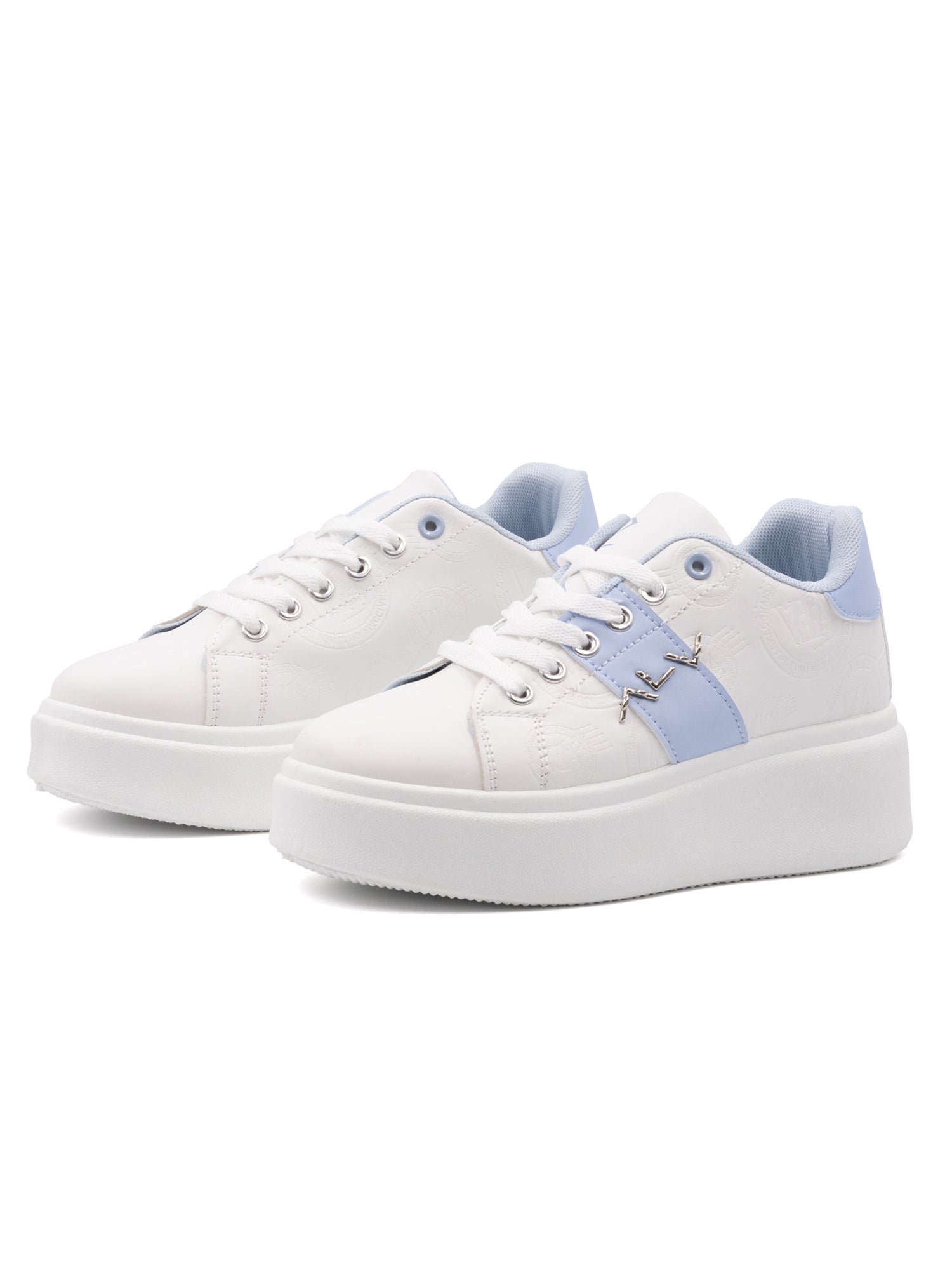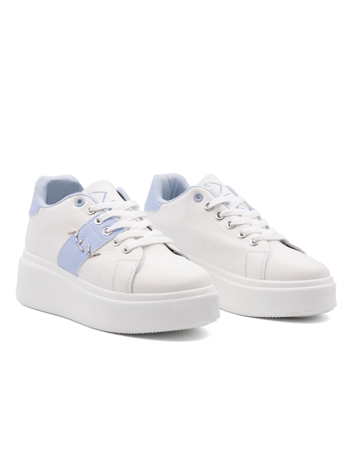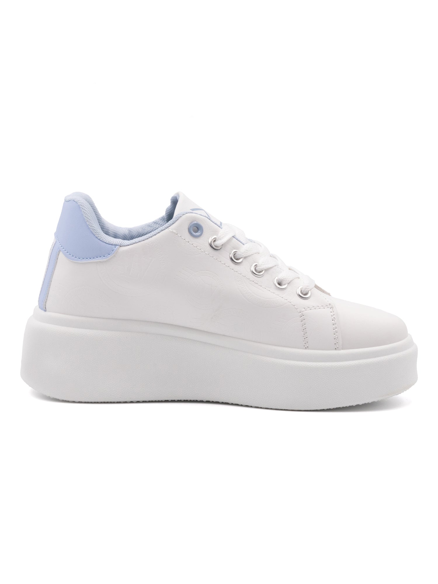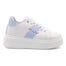 Il contrasto cromatico tra il bianco luminoso e gli accenti azzurri dona un tocco di originalità, rendendo queste scarpe un vero e proprio accessorio fashion. La chiusura con lacci assicura una calzata personalizzata e confortevole, mentre la suola platform aggiunge un tocco moderno e slanciato.