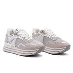 Queste sneakers si distinguono per la suola platform, che aggiunge un tocco moderno e audace al look, garantendo al contempo un comfort ottimale durante tutto il giorno. La chiusura con lacci assicura una calzata personalizzata e sicura.
