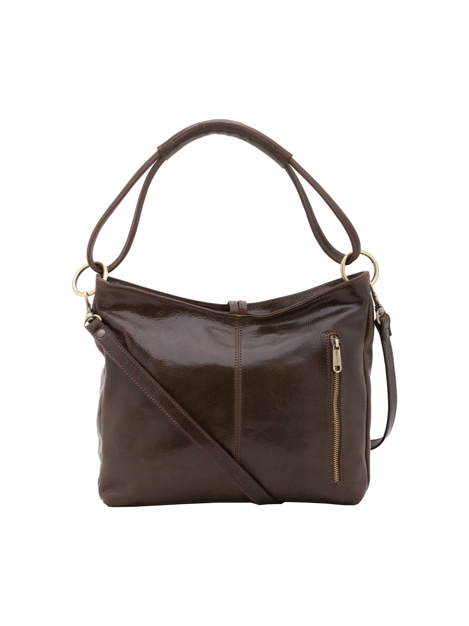 Damen-Umhängetasche. Reißverschluss. Zwei Innentaschen mit Reißverschluss. Eine Außentasche mit Reißverschluss auf der Rückseite. Abnehmbarer Schultergurt aus Leder. Ledergriff. Zwei Innenfächer. Außenmaterial: echtes Rindsleder. Innenfutter: Baumwolle. Maße: 29 x 32 x 11 cm. Hergestellt in Italien.