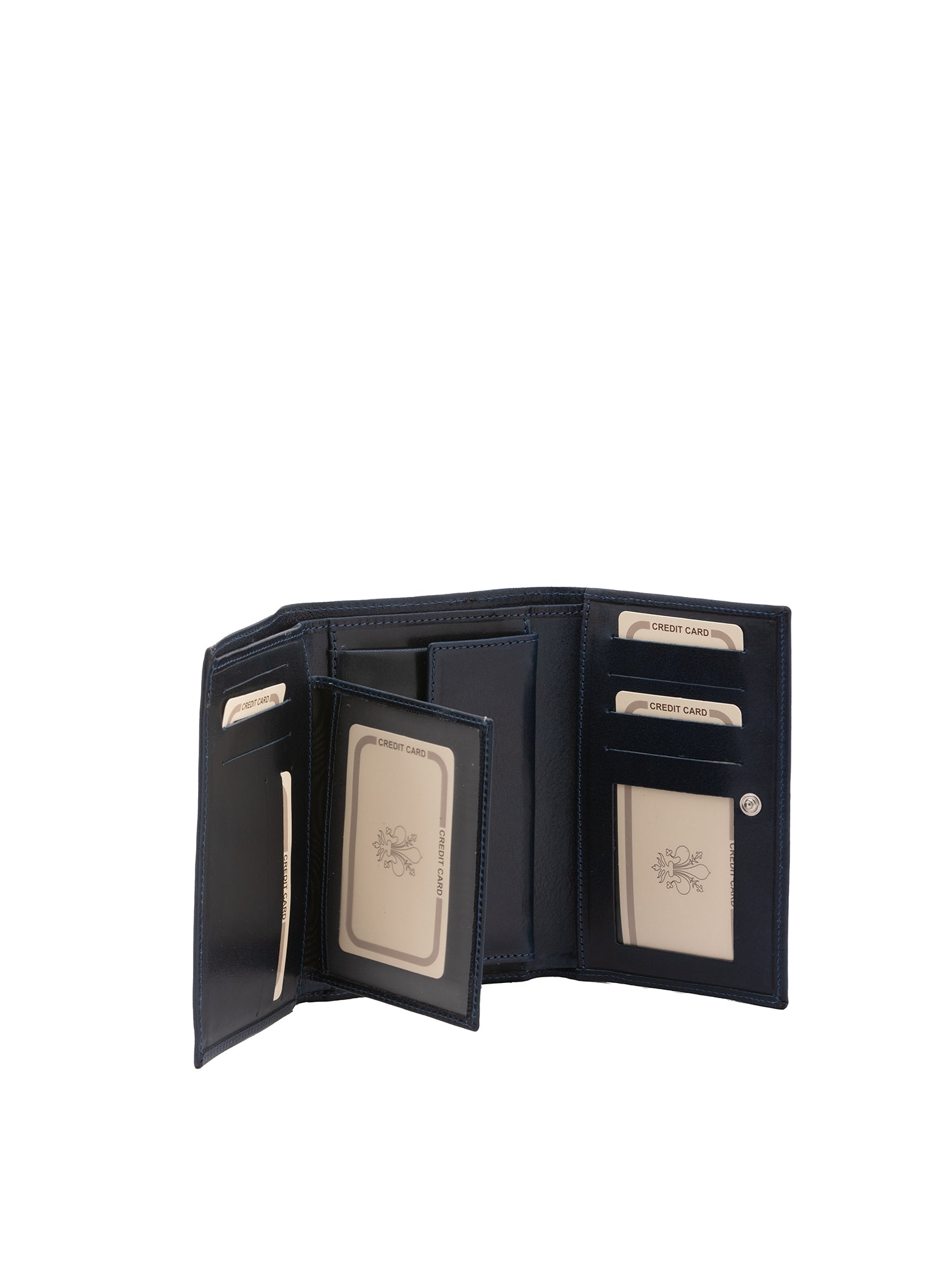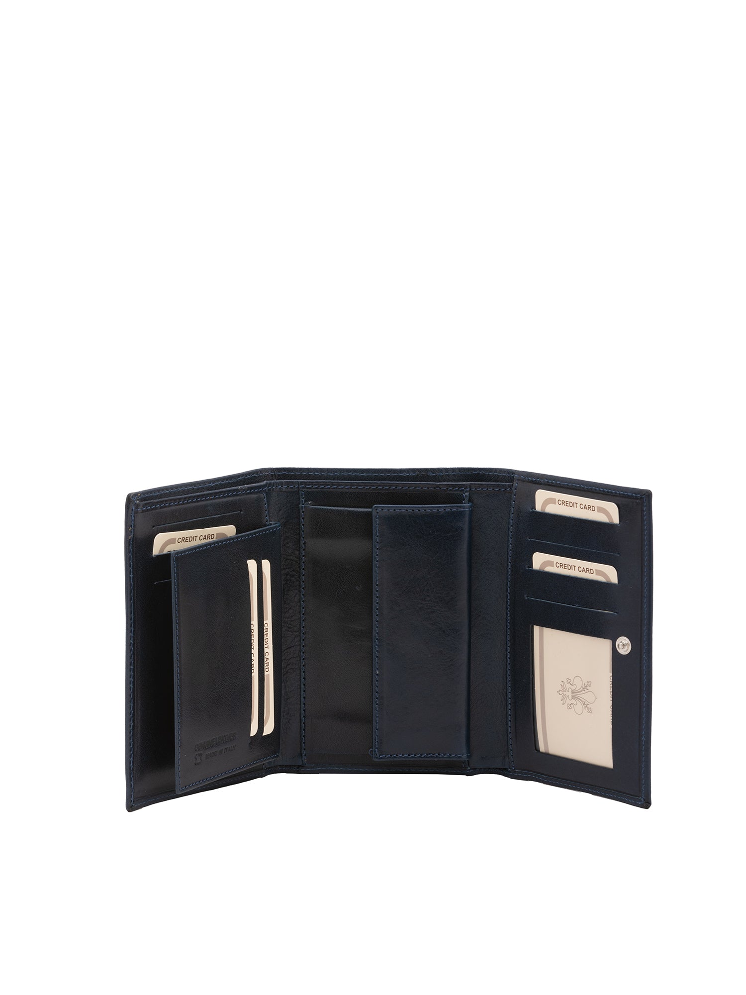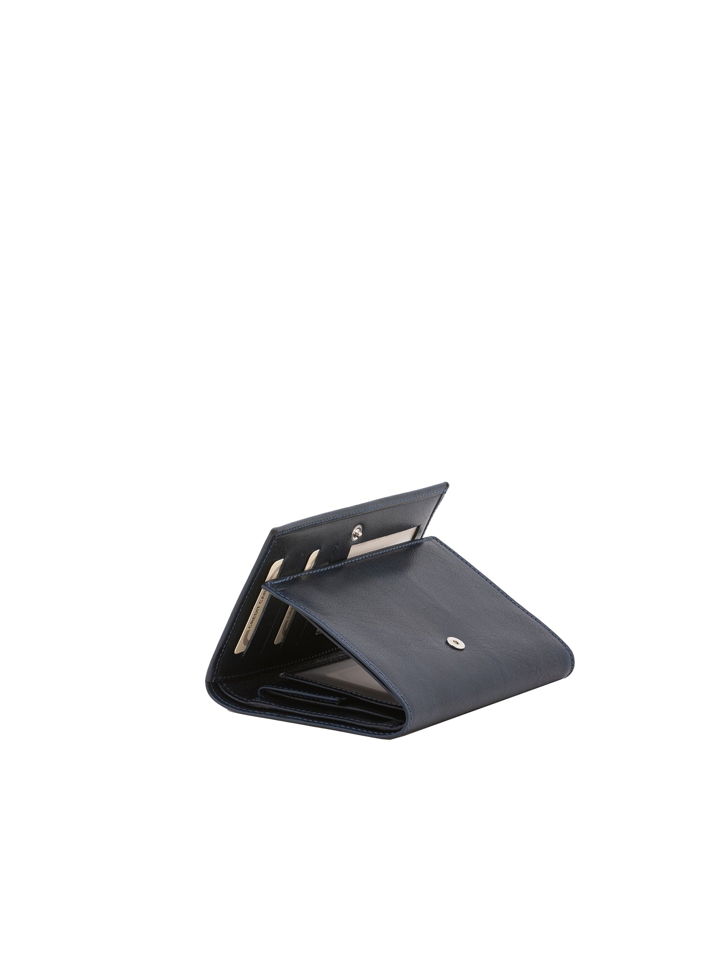 Damen-Geldbörse. Mit Knopfverschluss. Innen befinden sich Kartenfächer. Es gibt keine Außentaschen. Kein Schultergurt. Kein Tragegriff. Ein Innenfach. Die Außenseite besteht aus echtem Rindsleder. Die Innenseite ist ungefüttert. Maße: 15 x 10 x 3 cm. Hergestellt in Italien.