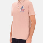 Polo a manica corta in tessuto piquet con collo a vela. Lavaggio marmorizzato con effetto invecchiato su ricami "hand made" e stampa "barca". Chiusura polo con asole e bottoni in diversi materiali.