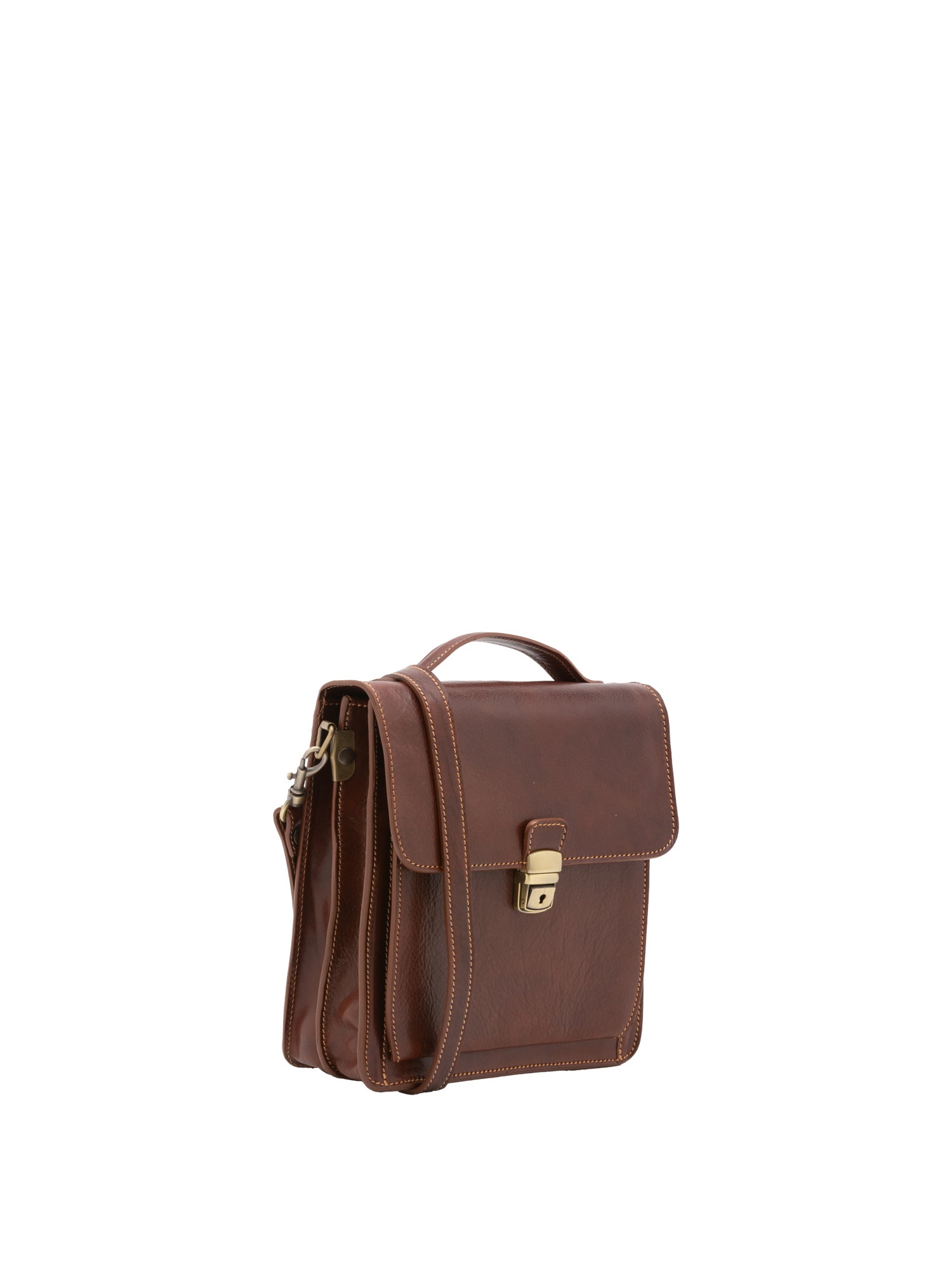 Herren-Umhängetasche. Druckknopfverschluss. Zwei Innentaschen mit Reißverschluss und eine offene Tasche. Eine Außentasche mit Reißverschluss auf der Rückseite. Abnehmbarer Leder-Schultergurt. Ledergriff. Zwei Innenfächer. Außenmaterial: echtes Rindsleder. Innenfutter: Baumwolle. Maße: 26 x 23,5 x 9 cm. Hergestellt in Italien.