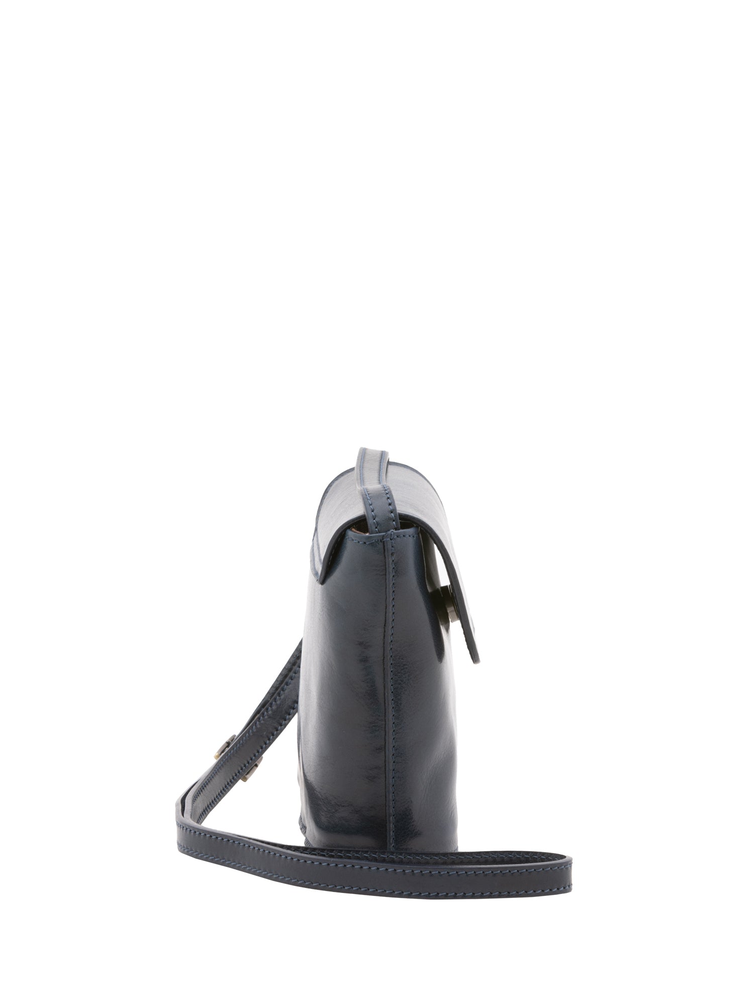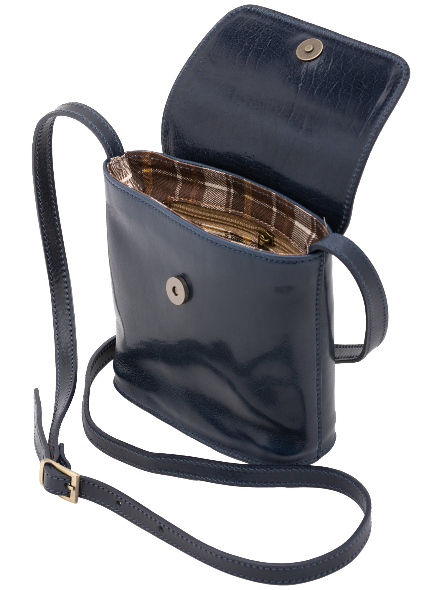Herren-Umhängetasche. Magnetverschluss. Eine Innentasche mit Reißverschluss. Es gibt keine Außentaschen. Der Schultergurt ist verstellbar und aus Leder. Es gibt keinen Tragegriff. Es gibt ein Innenfach. Das Außenmaterial ist echtes Rindsleder. Innen ist es mit Baumwolle gefüttert. Maße: 16 x 17,5 x 7 cm. Hergestellt in Italien.