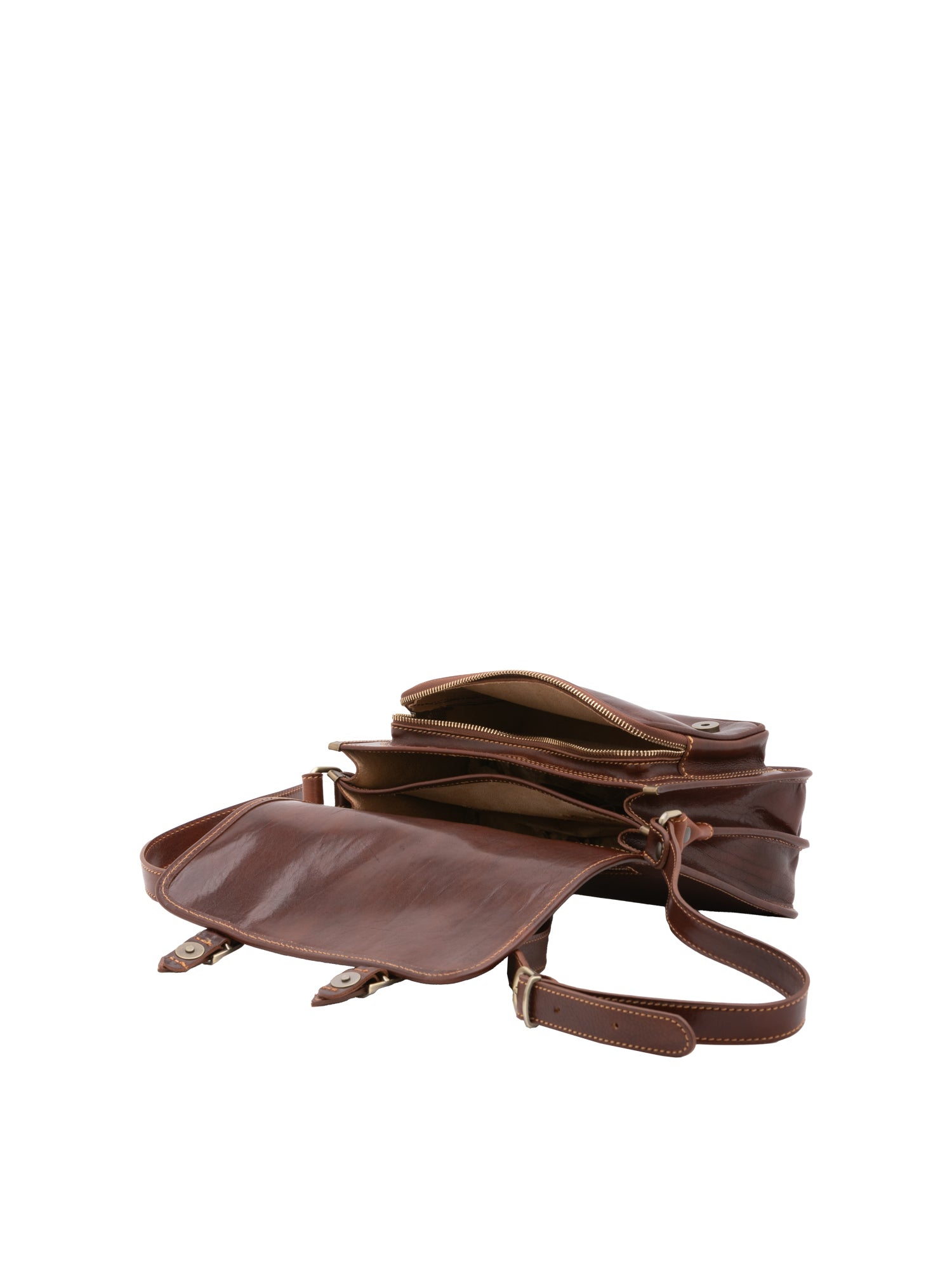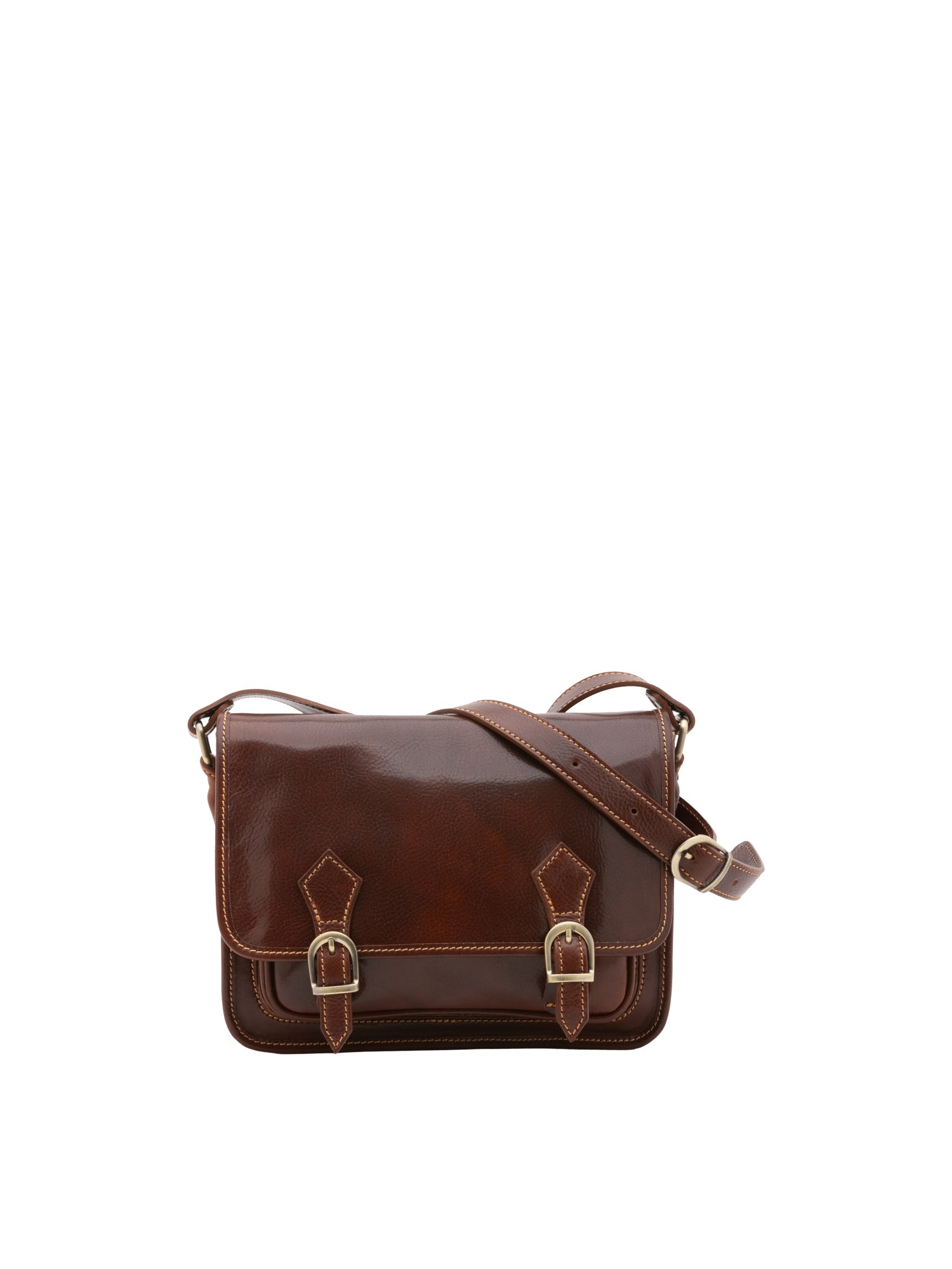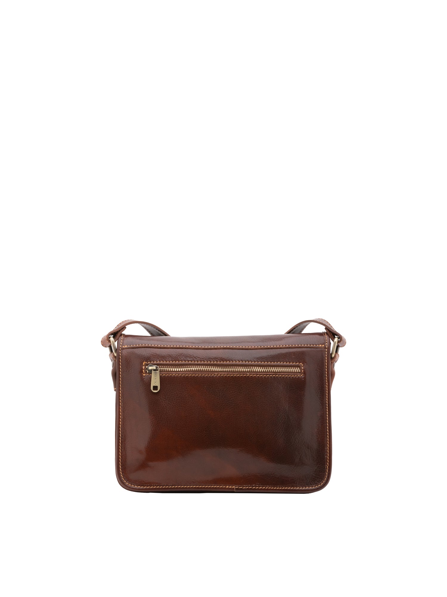 Damen-Umhängetasche mit Magnetverschluss. Innen befinden sich ein Reißverschlussfach und ein offenes Fach. Außen befinden sich jeweils ein Reißverschlussfach vorne und hinten. Der verstellbare Schultergurt aus Leder ist grifflos. Innen gibt es zwei Fächer. Die Außenseite besteht aus echtem Rindsleder. Innen ist sie mit Baumwolle gefüttert. Maße: 27,5 x 22 x 12 cm. Hergestellt in Italien.