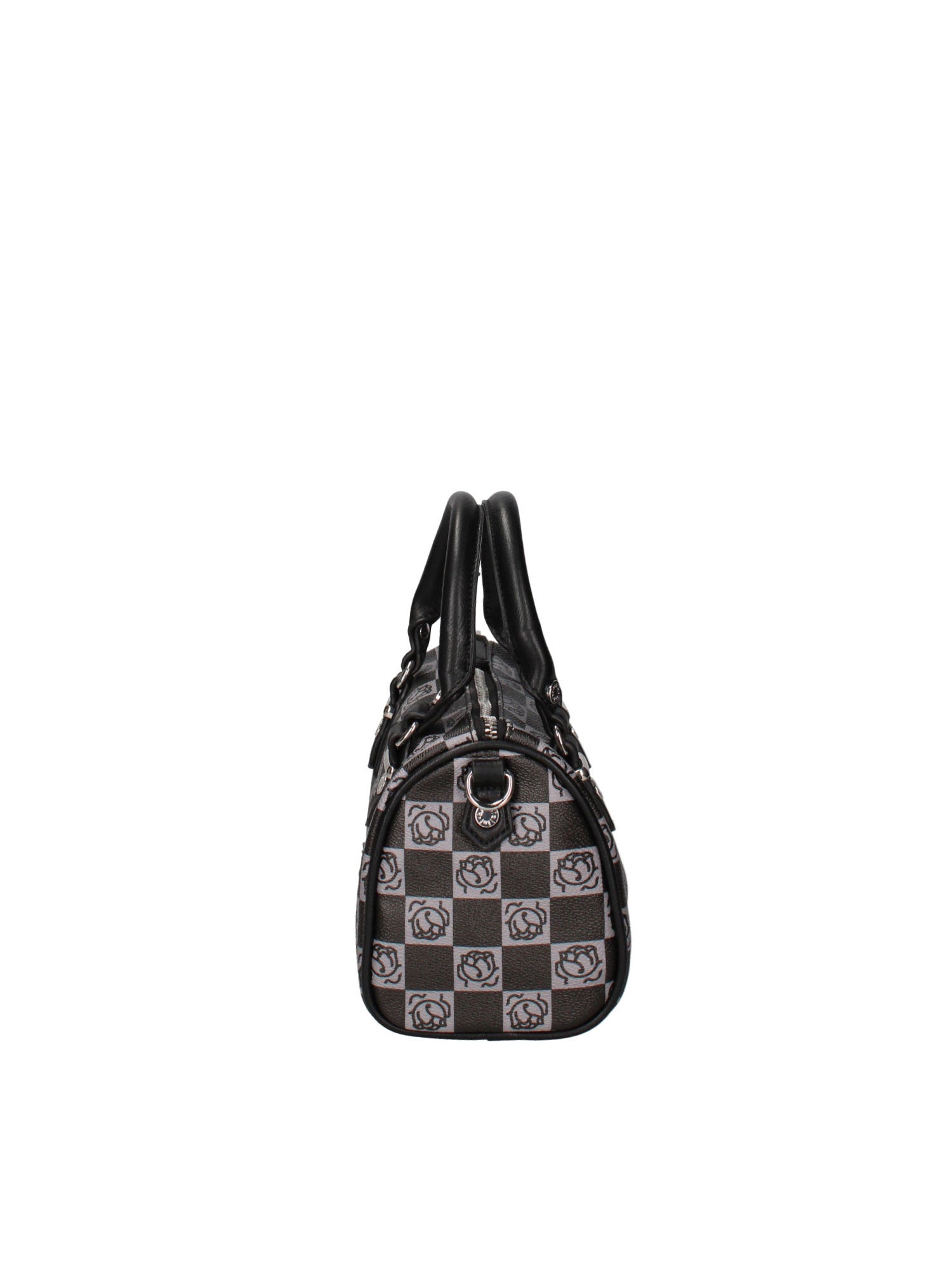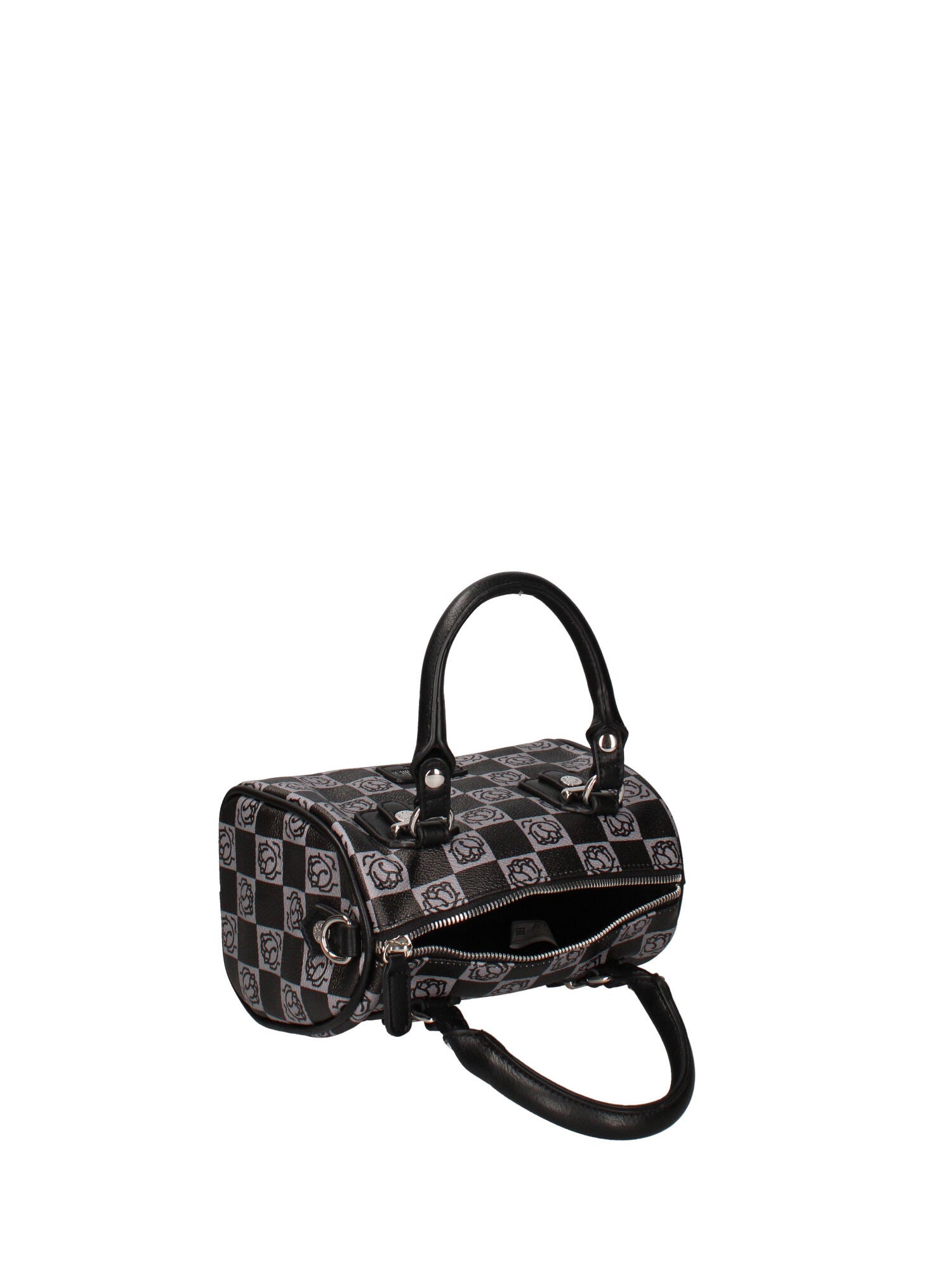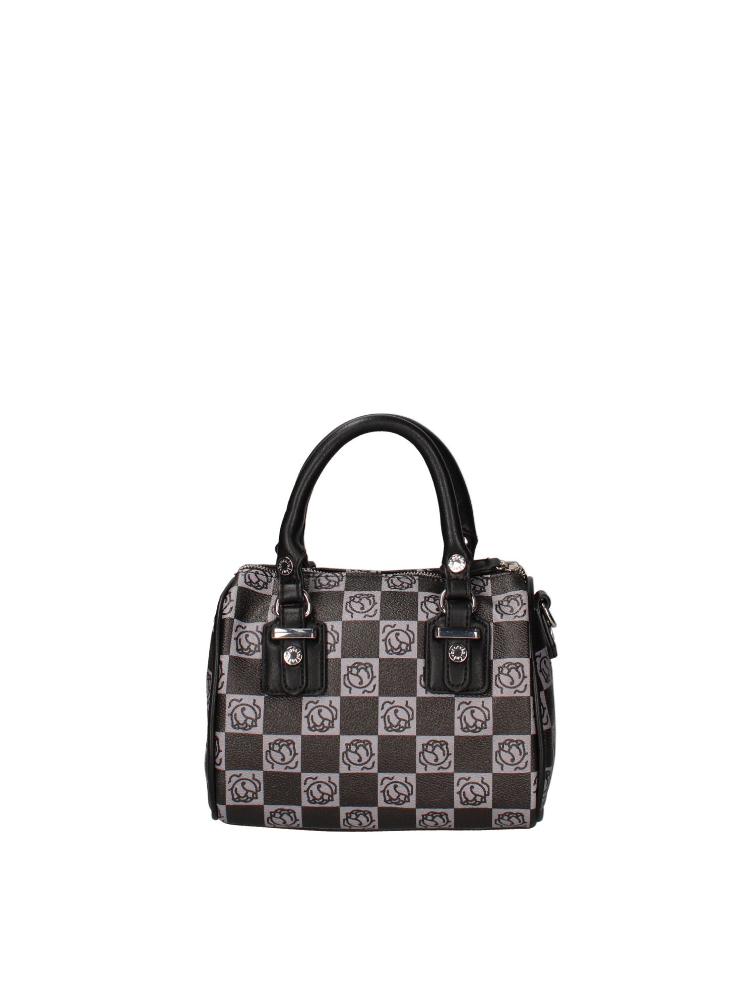 Handbag with double handle and zip closure. Metal details and rivets highlight the handle attachments. Front patch with lettering. Orange peel monogram print with a tone-on-tone synthetic finish. Adjustable and removable shoulder strap.