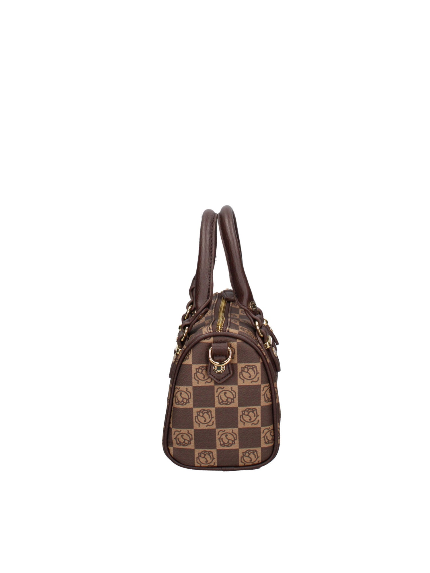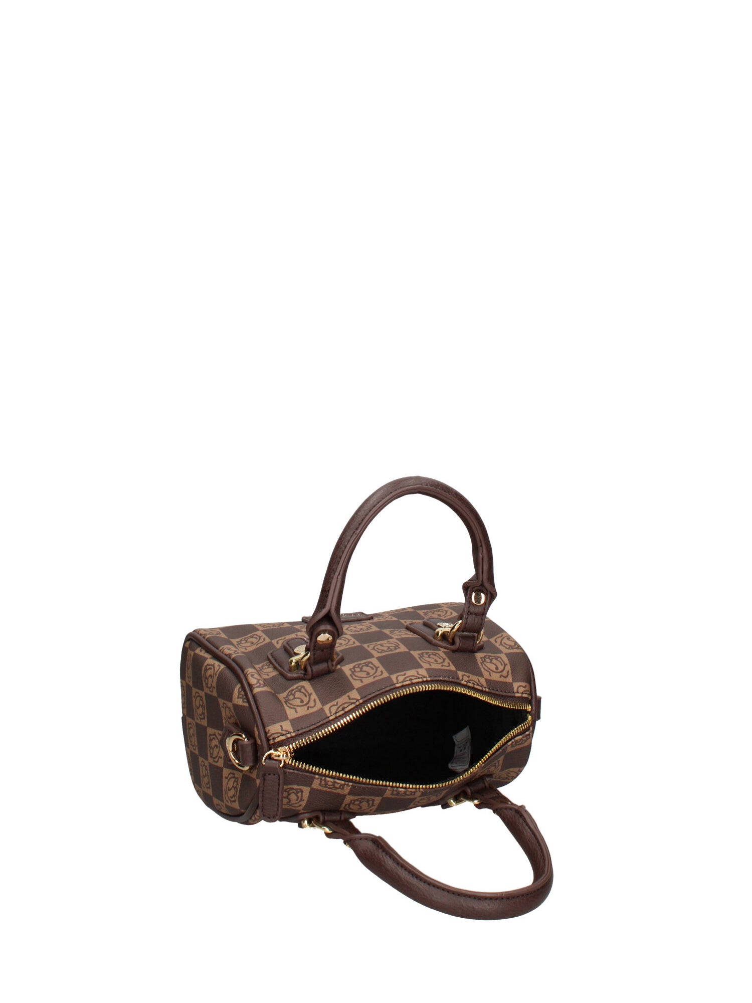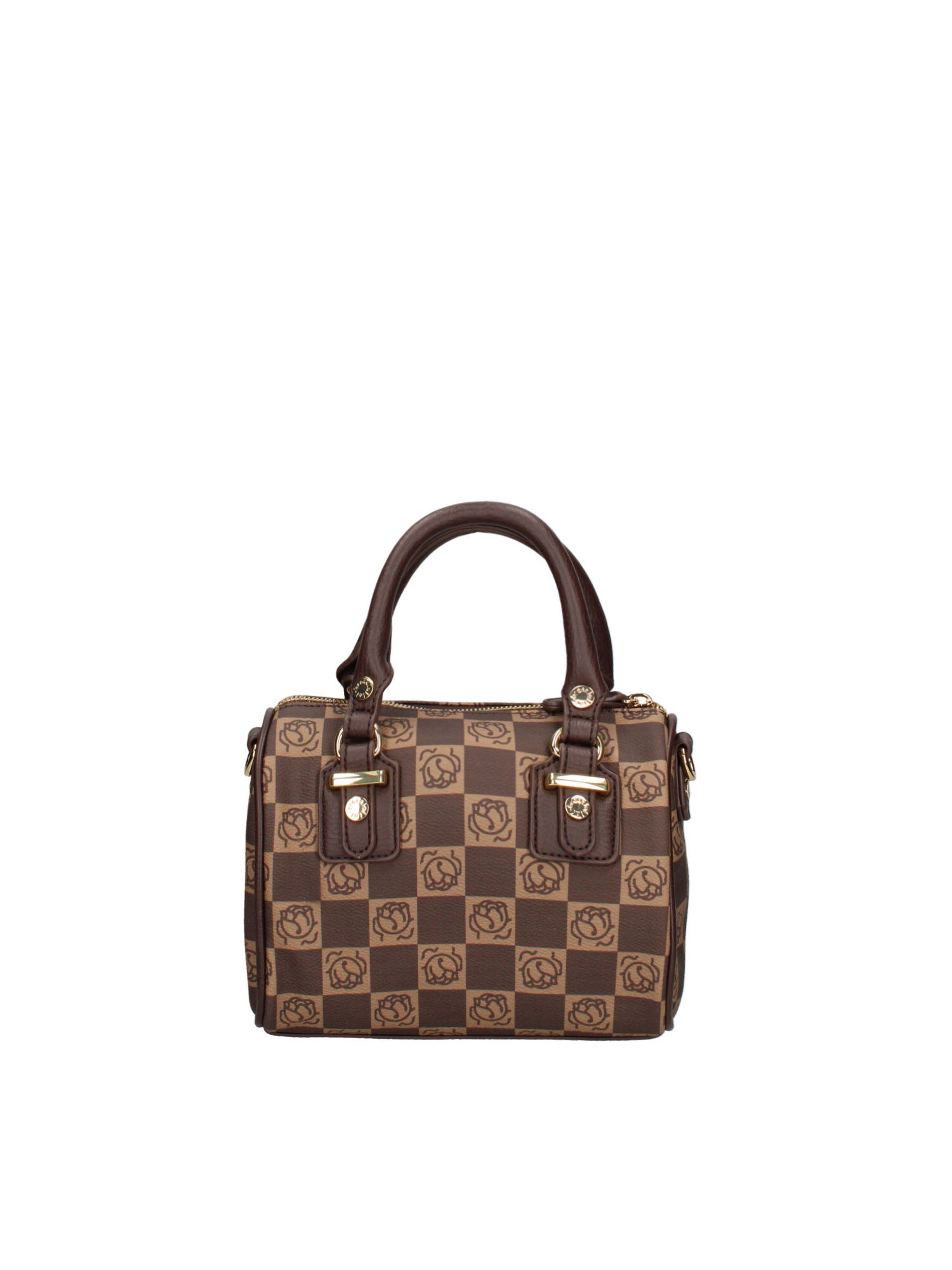 Handbag with double handle and zip closure. Metal details and rivets highlight the handle attachments. Front patch with lettering. Orange peel monogram print with a tone-on-tone synthetic finish. Adjustable and removable shoulder strap.