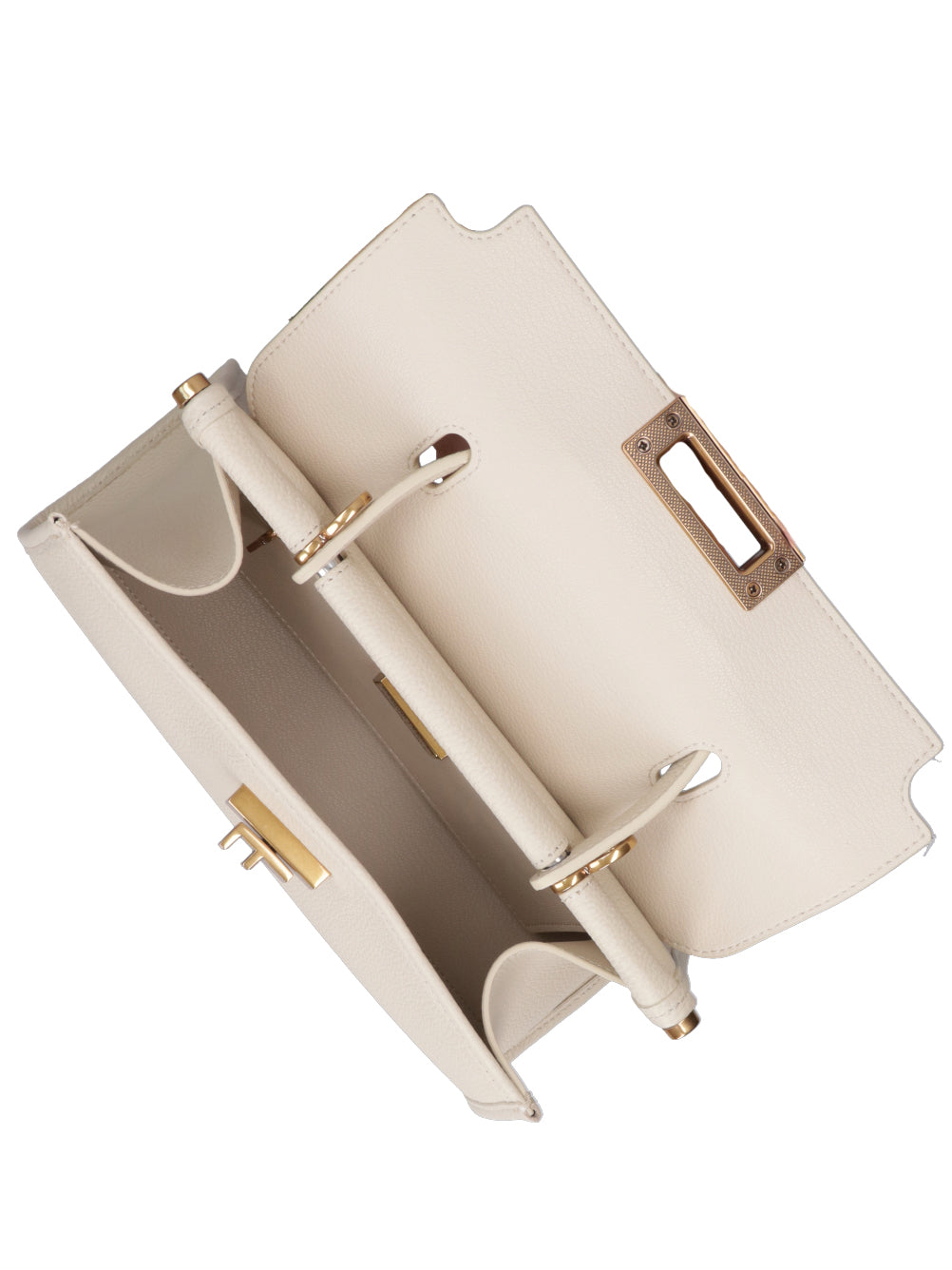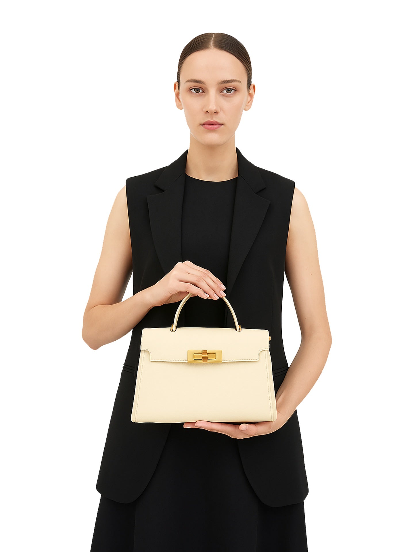 Its classic, clean silhouette is enhanced by a gold-tone twist lock, a detail that lends a touch of timeless sophistication. The unlined interior enhances the natural beauty of the leather, offering a unique tactile experience.