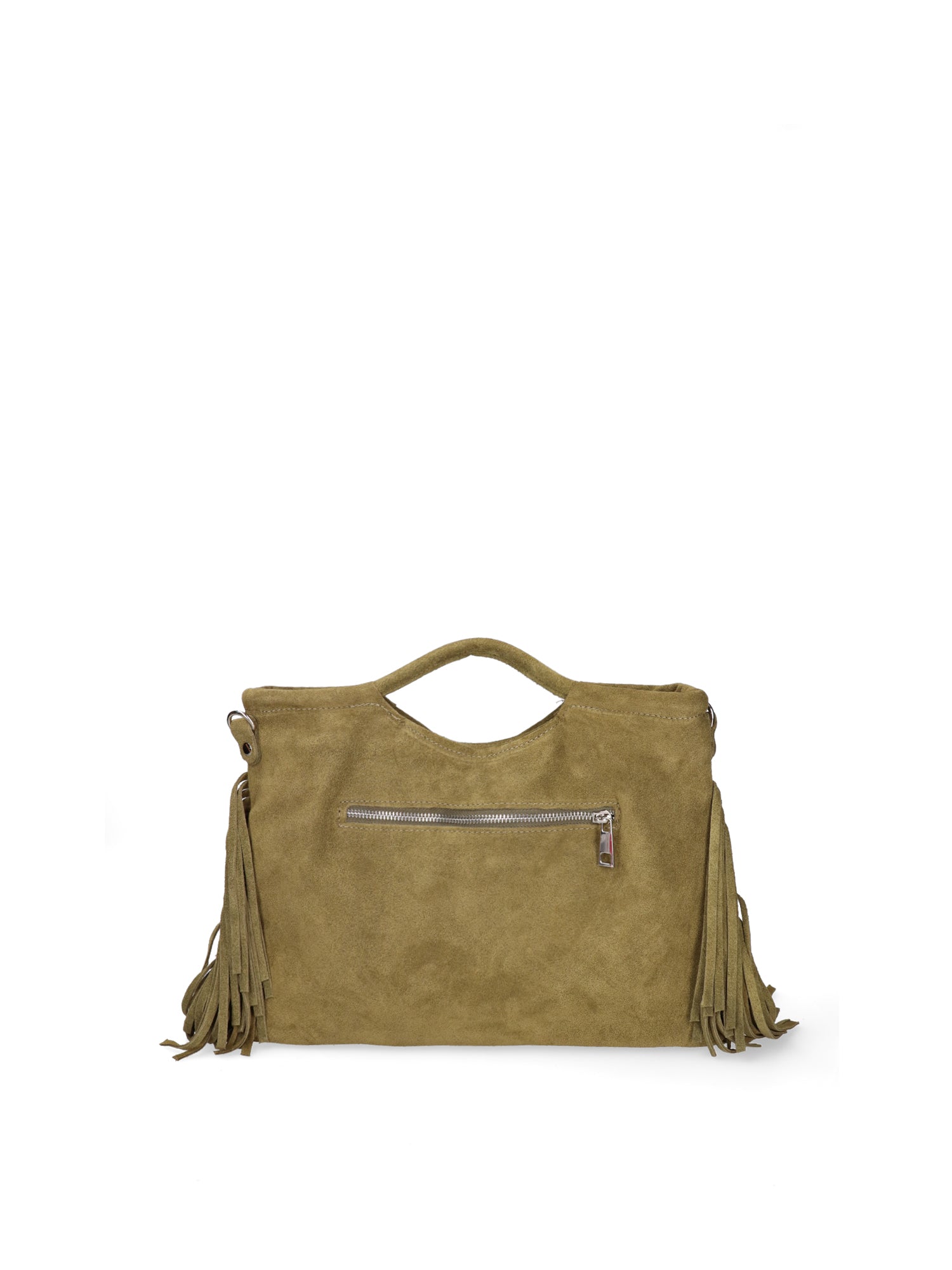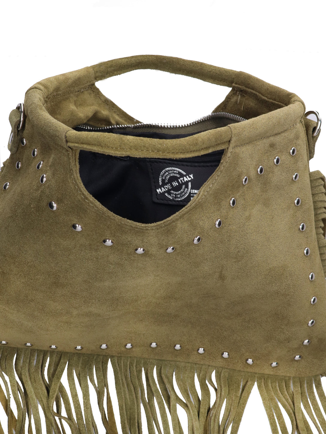 Timeless elegance blends with Italian craftsmanship in this stunning handbag. Crafted from premium suede, this bag is a testament to quality and sophisticated design. The soft, enveloping texture of the suede is enhanced by unique details, such as fringe, which lends movement and a bohemian touch to the look. The interior, lined with a combination of cotton and synthetic materials, offers well-organized and comfortable storage for all your belongings. The zip closure ensures security and practicality. This bag is a true stylish accessory, perfect for completing casual outfits but also adding a touch of sophistication to more sophisticated looks. Made entirely in Italy, it is a symbol of artisanal excellence and a passion for detail. The adjustable 55 cm shoulder strap allows you to wear it comfortably over the shoulder or across the body. To preserve its beauty over time, we recommend cleaning with specific leather products. A lasting investment that will accompany you in style on every occasion.