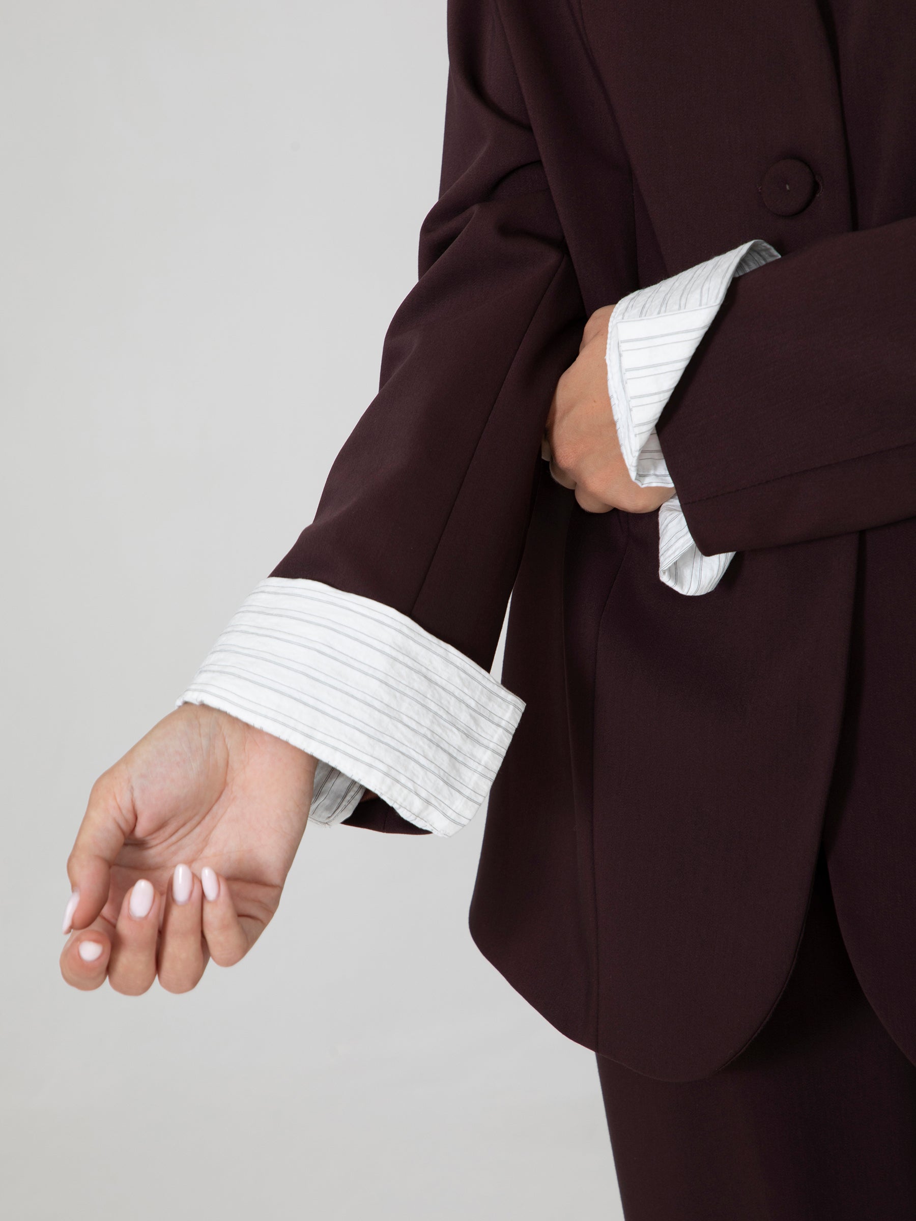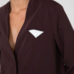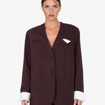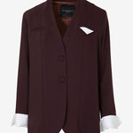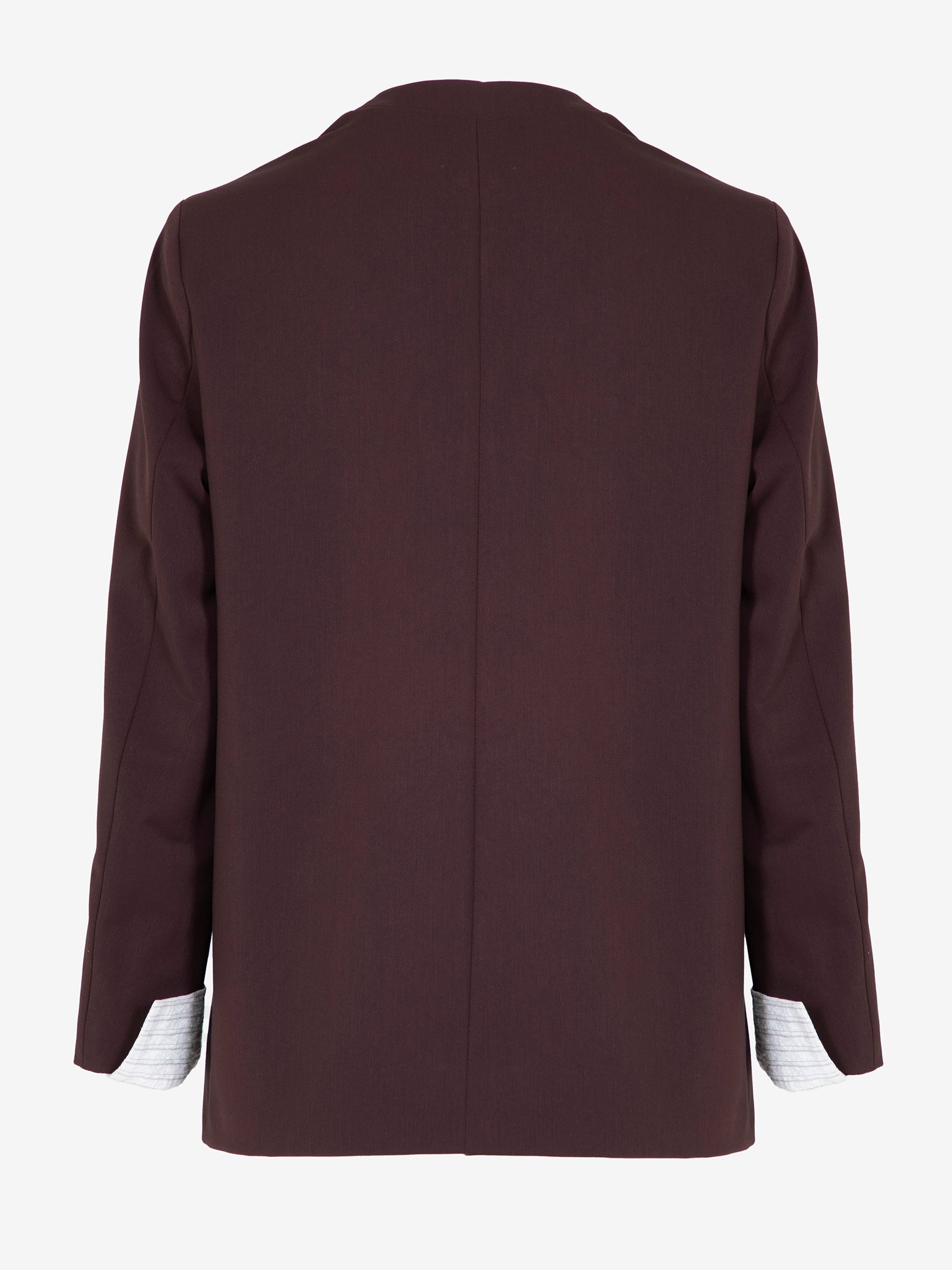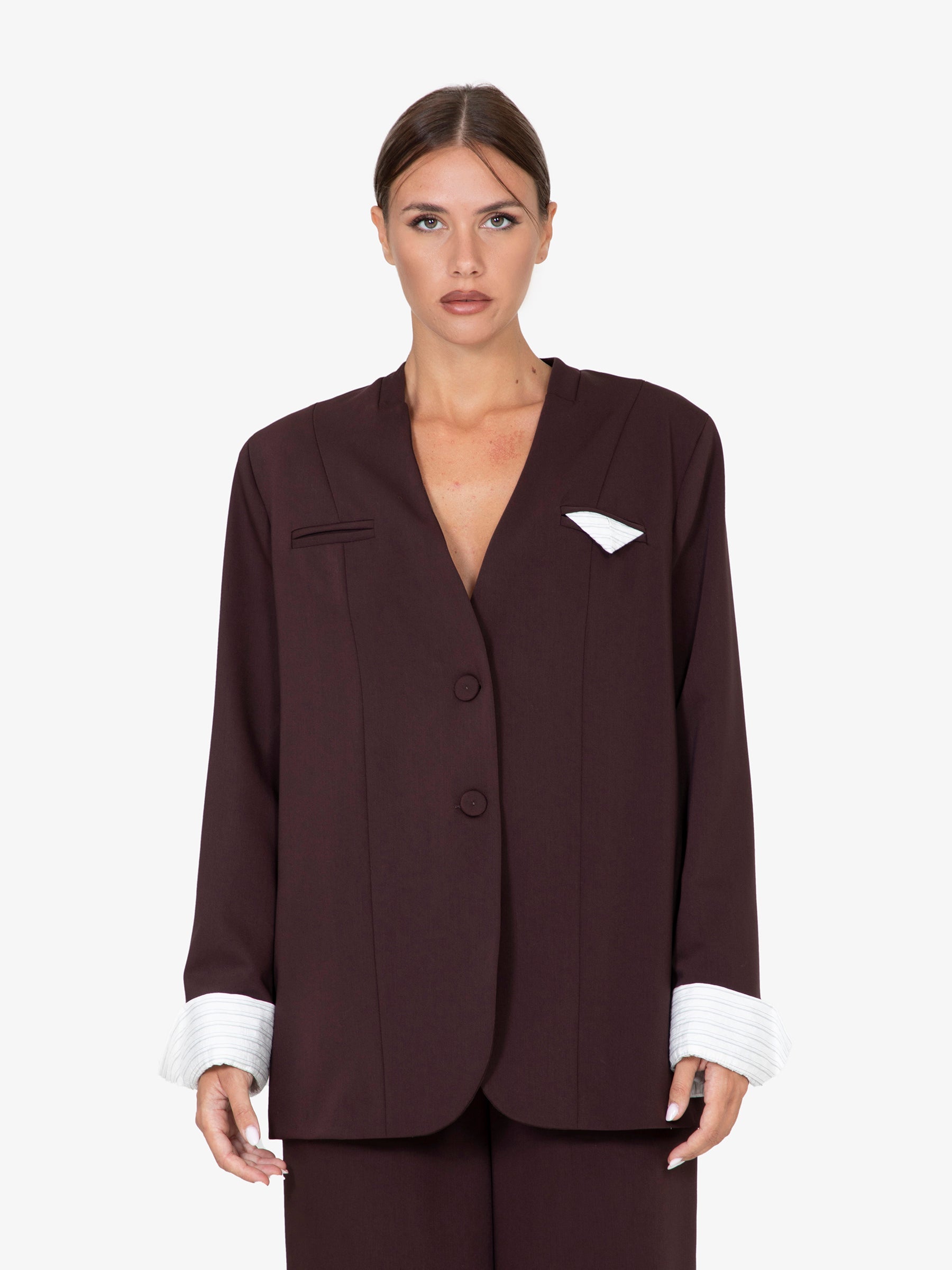 L'interno completamente foderato in poliestere assicura una sensazione di lusso e comfort, mentre il taglio sartoriale e la chiusura assente ne sottolineano la linea pulita e minimalista. I contrasti cromatici sui polsini aggiungono un tocco di originalità e raffinatezza.
