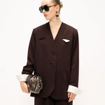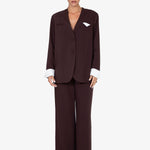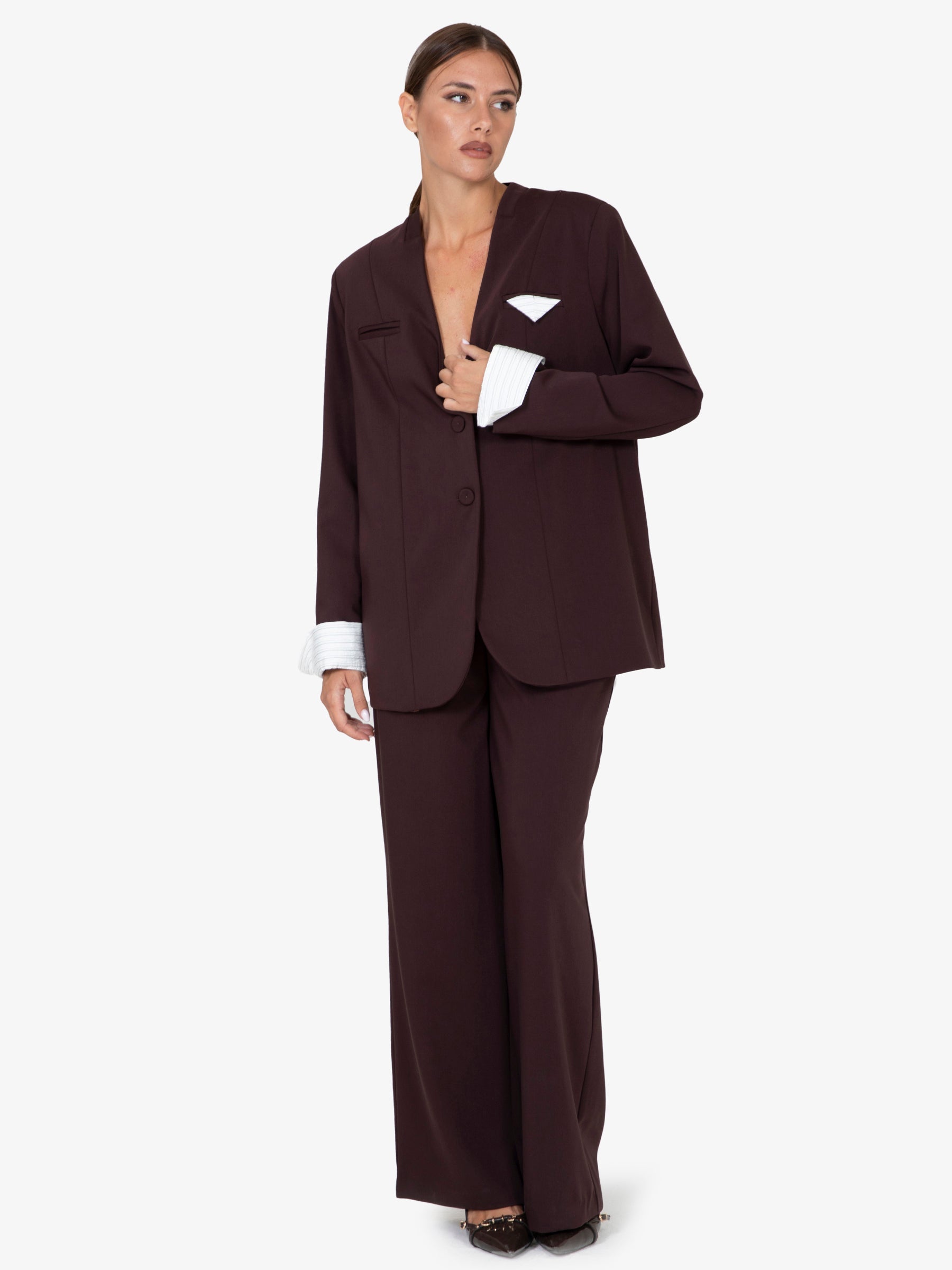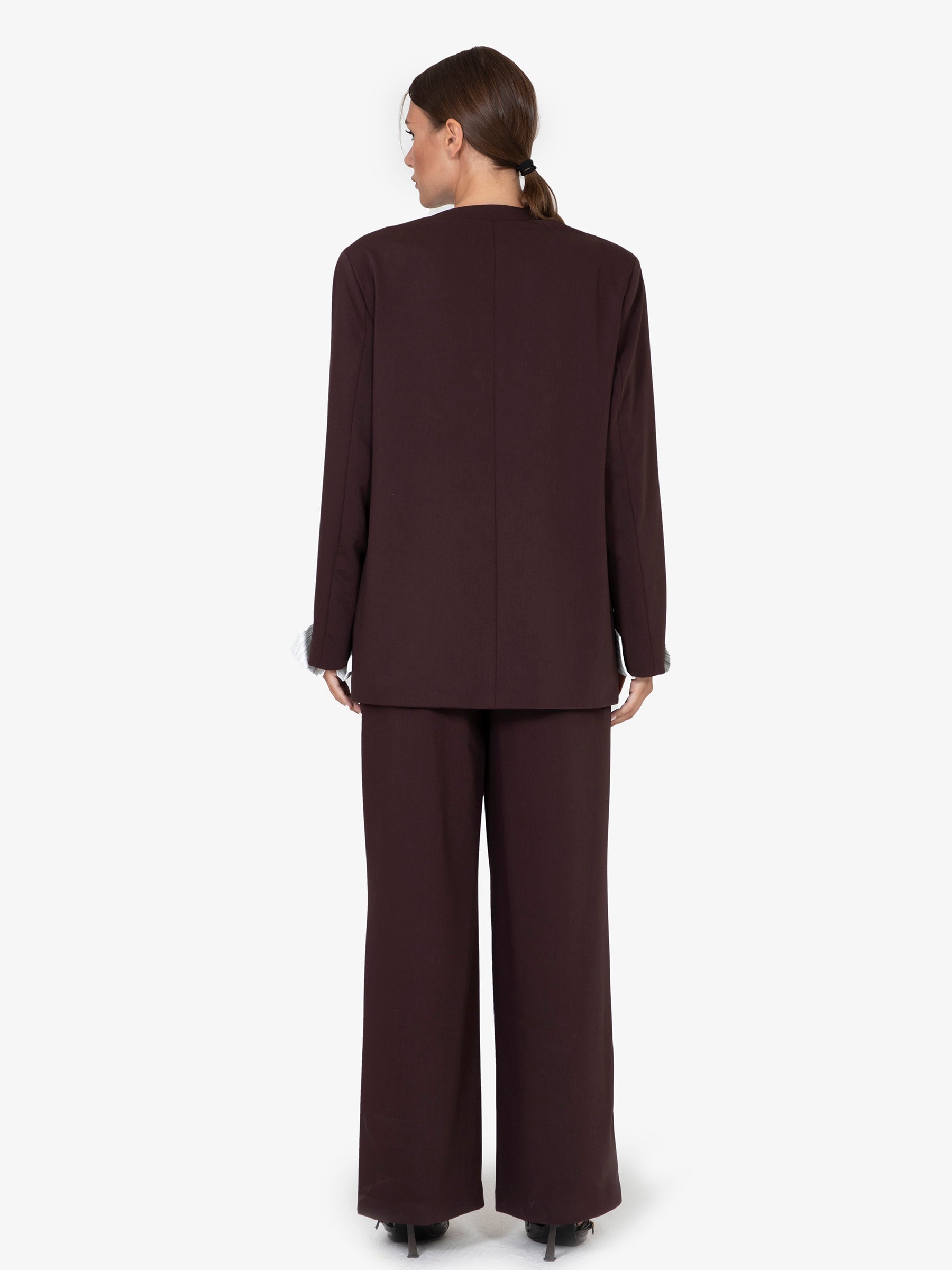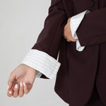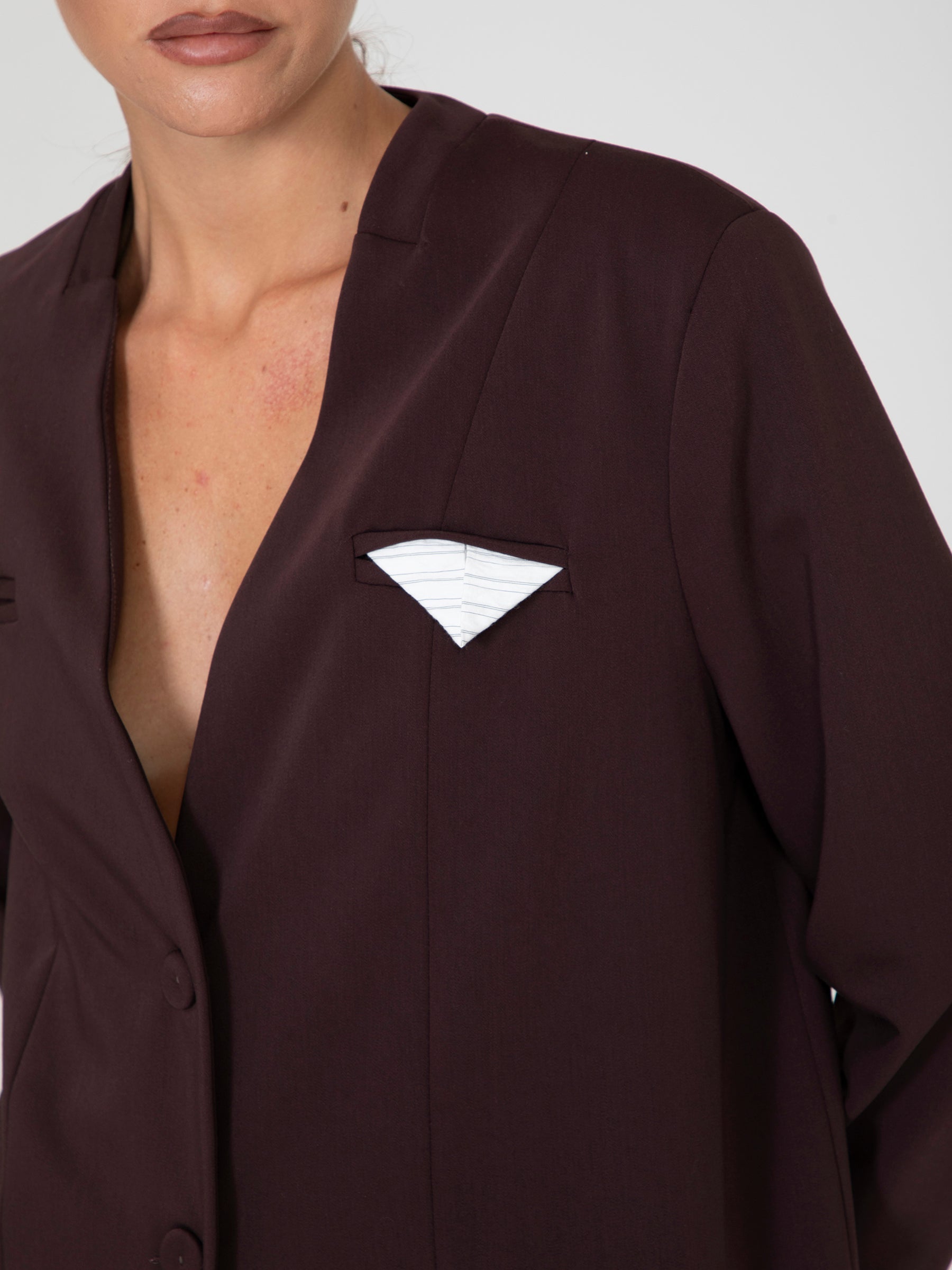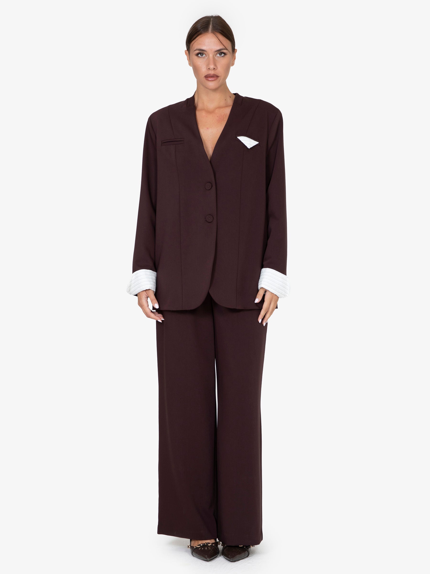 L'interno completamente foderato in poliestere assicura una sensazione di lusso e comfort, mentre il taglio sartoriale e la chiusura assente ne sottolineano la linea pulita e minimalista. I contrasti cromatici sui polsini aggiungono un tocco di originalità e raffinatezza.
