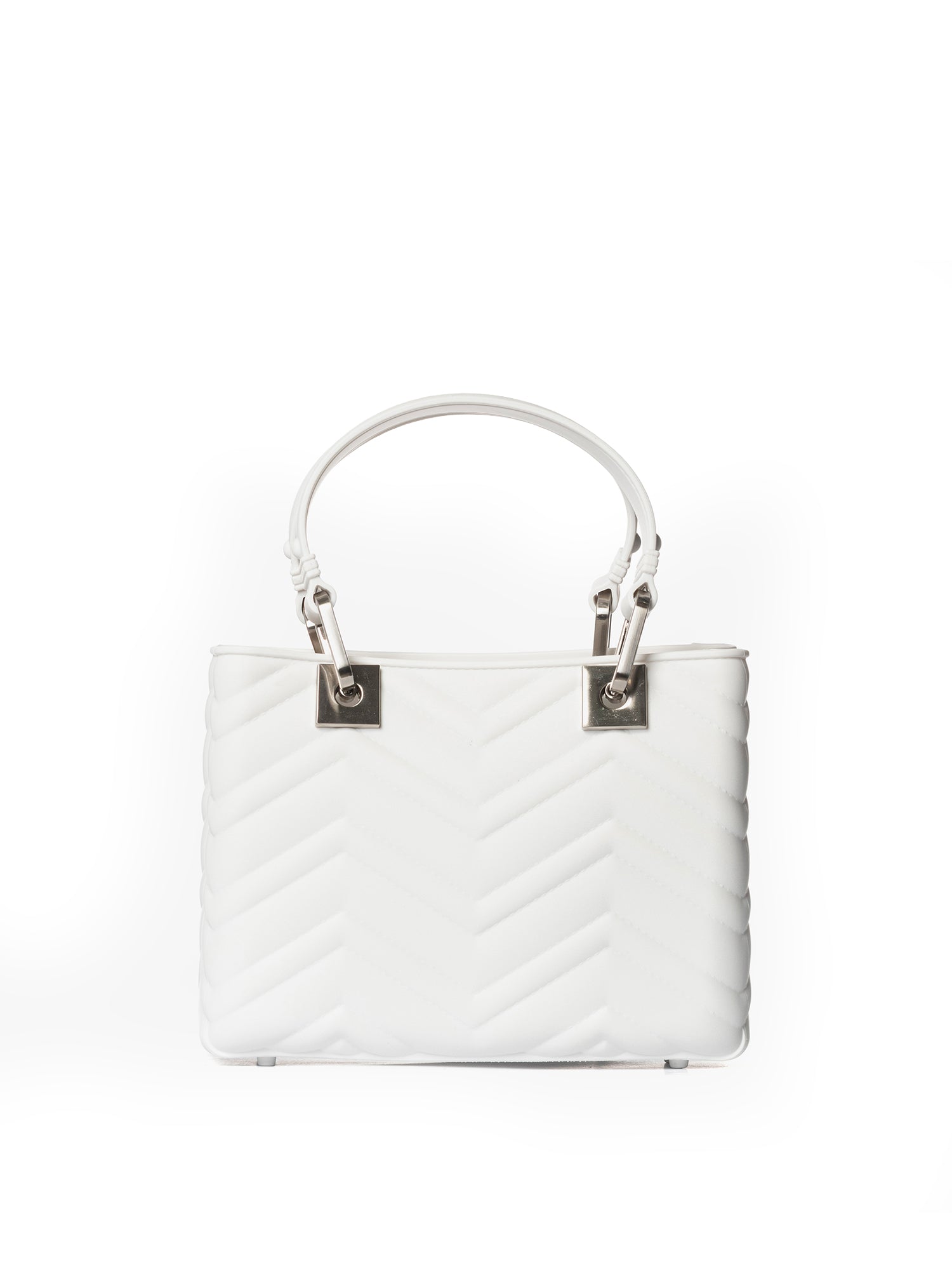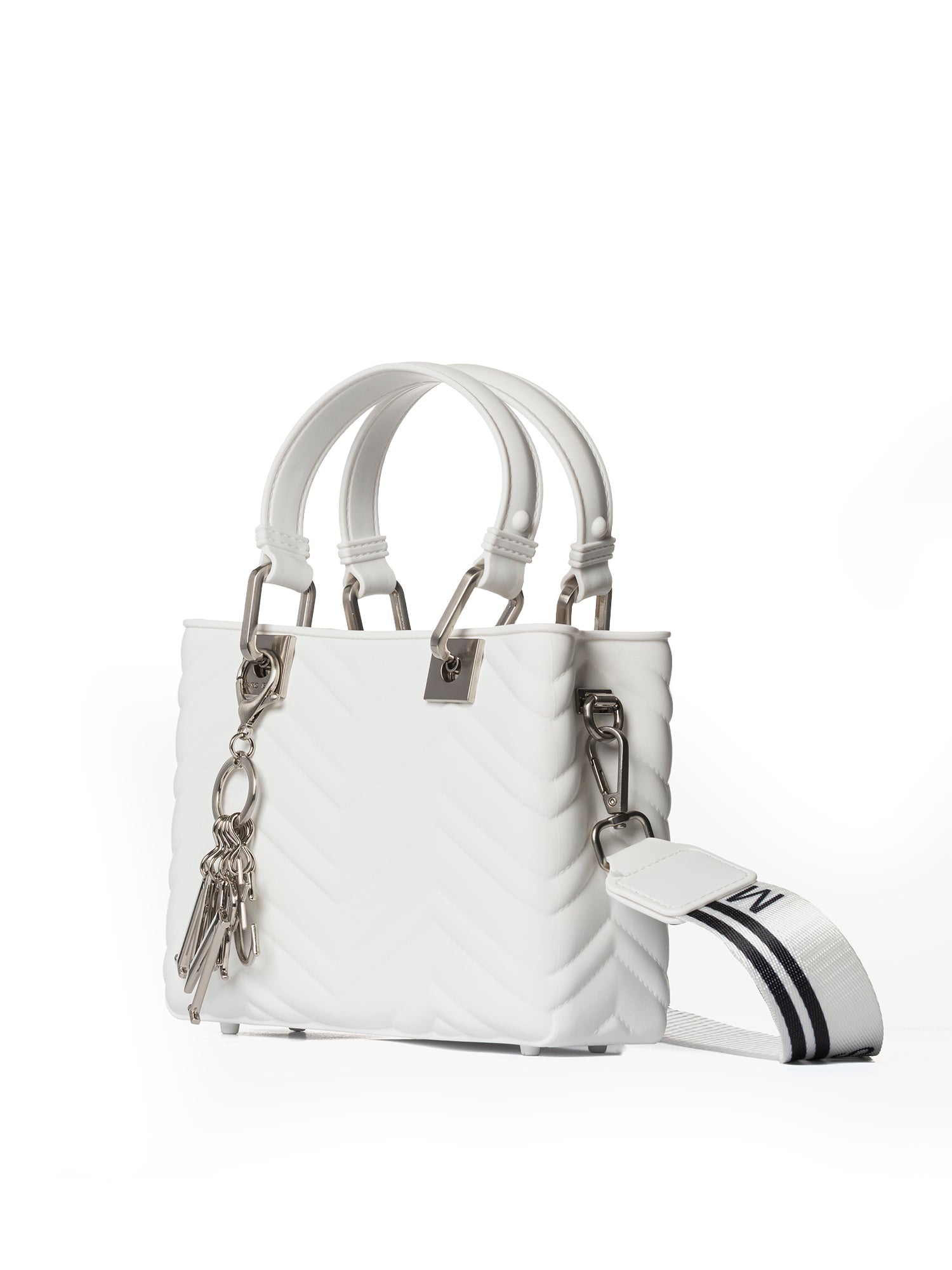 Made entirely of high- quality rubber, both inside and out, this bag offers a unique texture and a modern touch. The sophisticated design is enriched by a quilted workmanship that gives depth and character, while the careful details, such as the practical and secure magnetic closure, enhance its functionality.