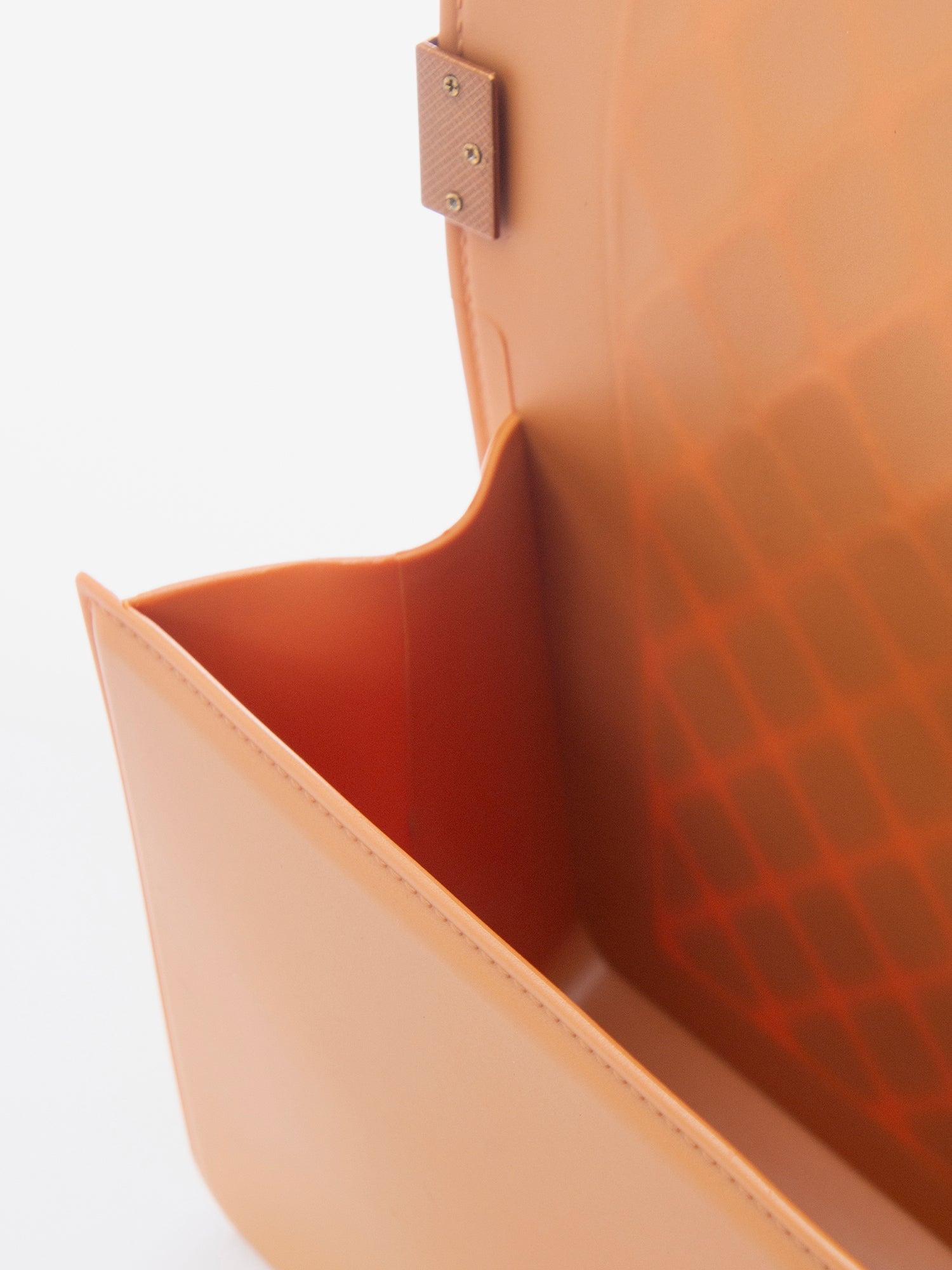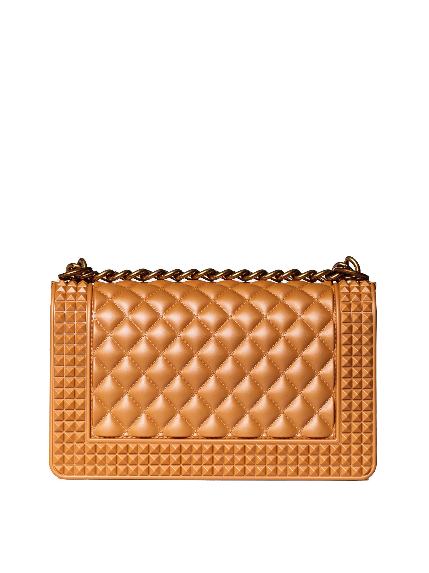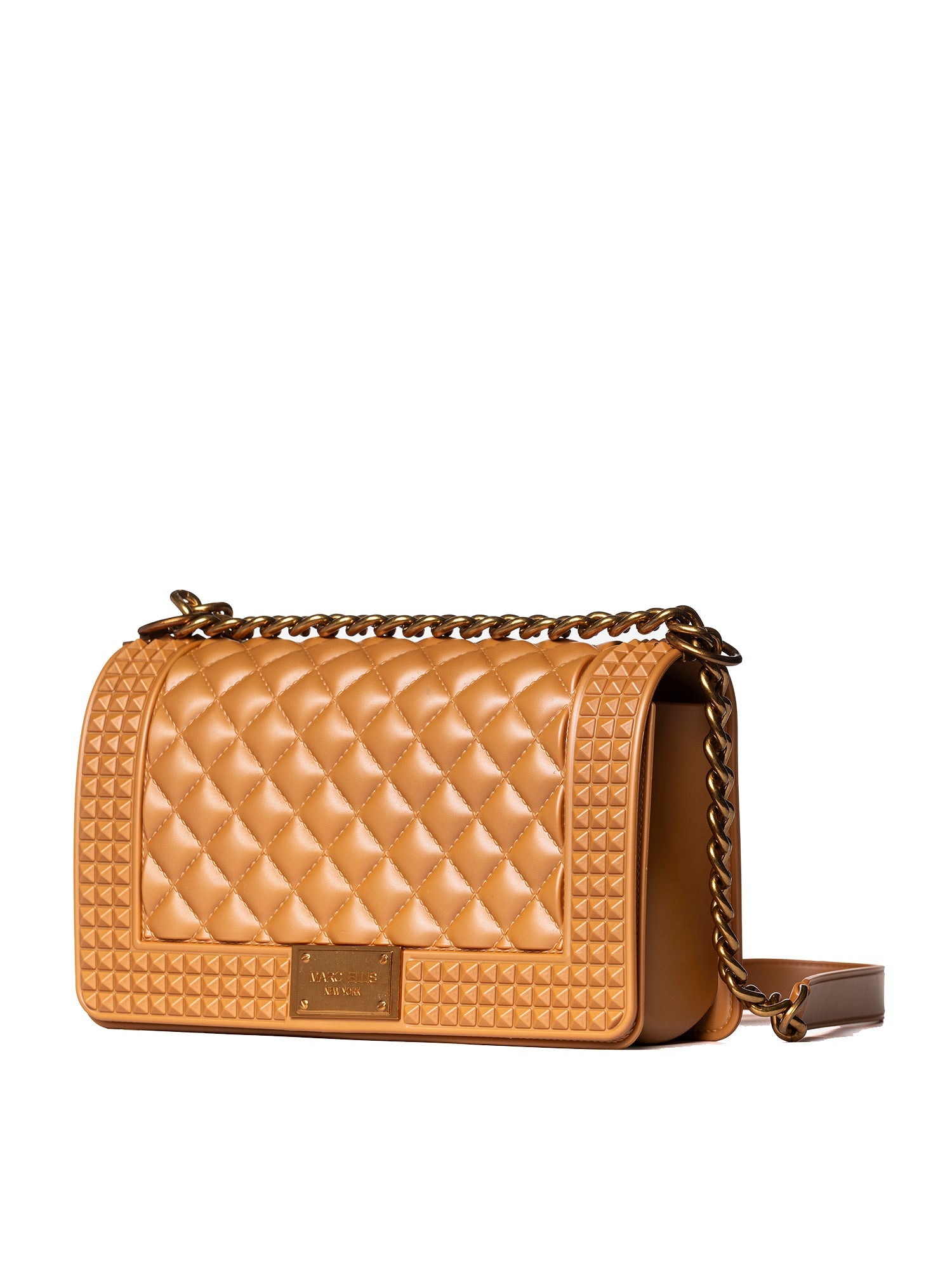 Made entirely of high- quality rubber, this bag stands out for its matelassé texture, an iconic detail that adds a touch of luxury to any outfit. Its compact and structured shape is enhanced by a refined chain shoulder strap, which allows it to be carried comfortably on the shoulder or transformed into an elegant clutch bag.