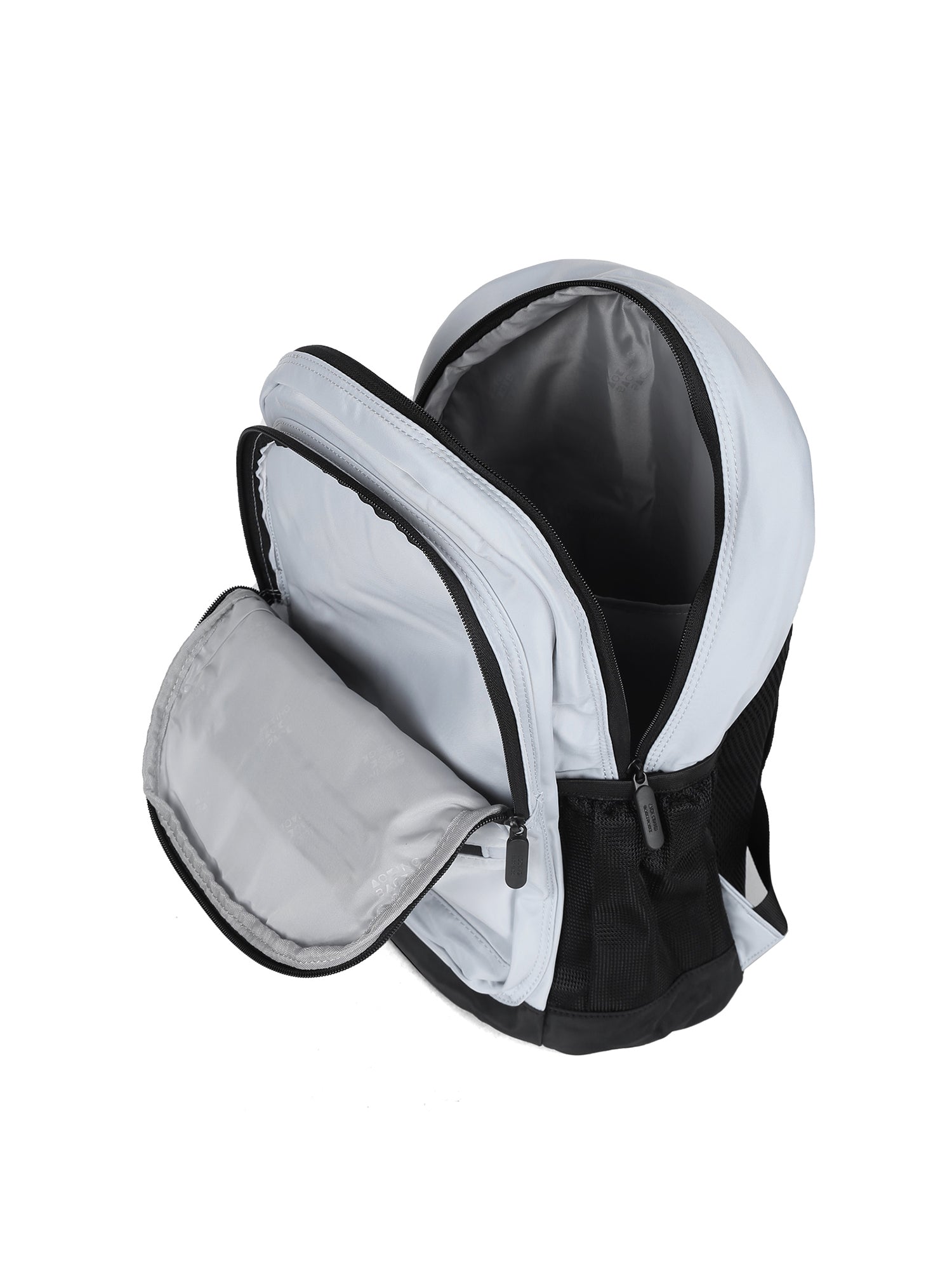 Unisex backpack. Zip closure. One internal pocket is open. Three external pockets are zipped, and two are open on the sides. The shoulder strap is missing. The handle is made of fabric. There is one internal compartment. The outer material is polyester. The interior is lined with polyester. Dimensions: 30x16.5x40 cm. Fashion product