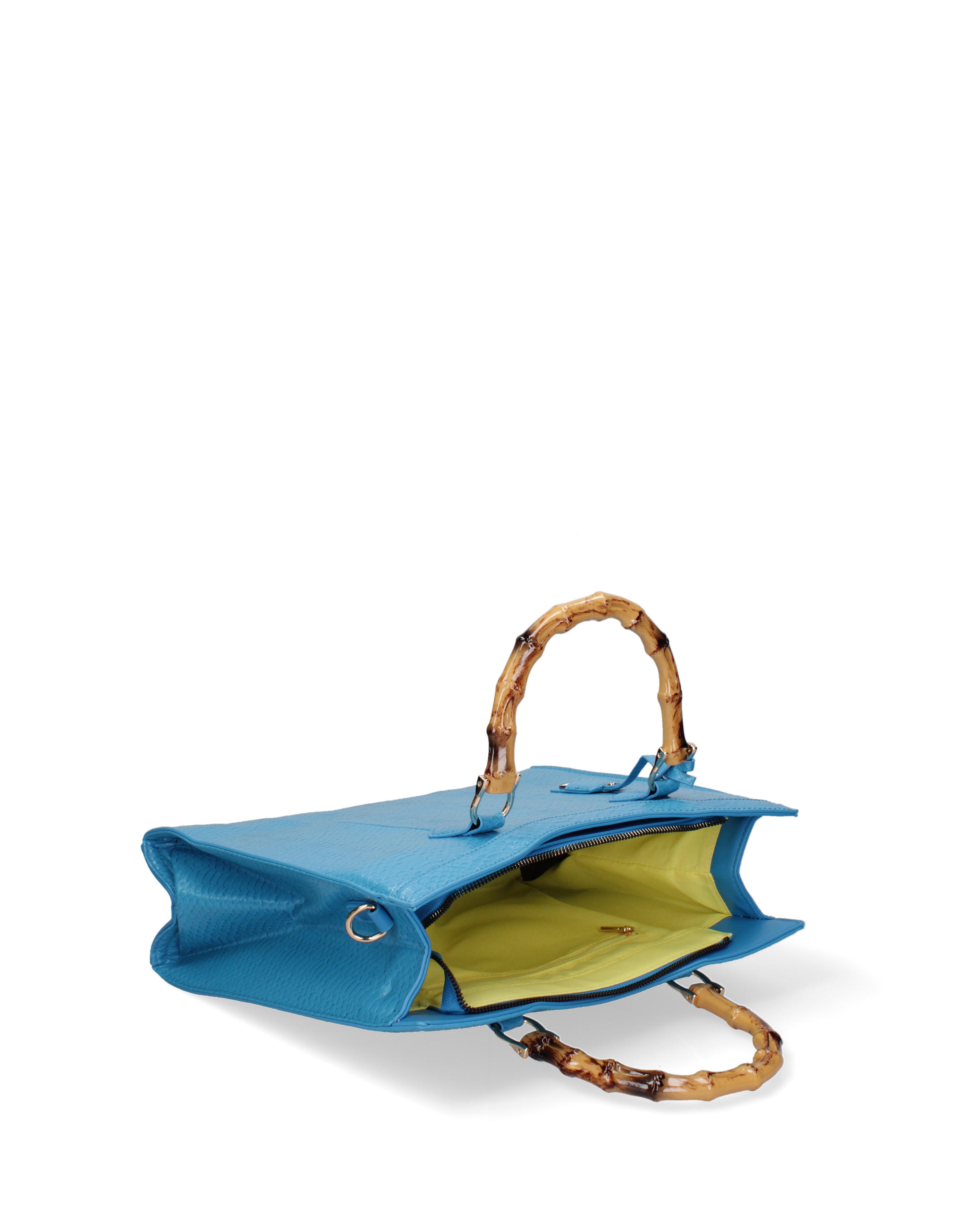 Women's shoulder bag. Zip closure. One interior pocket with a zip and two open pockets. There are no exterior pockets. The shoulder strap is adjustable and removable. The handle is made of bamboo. There are one interior compartment. The exterior material is faux leather. The interior is lined with polyester. Dimensions: 34x28x14.5 cm. Fashion product