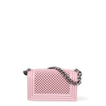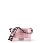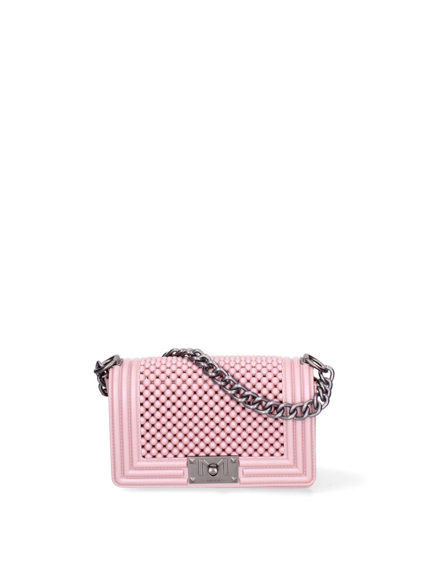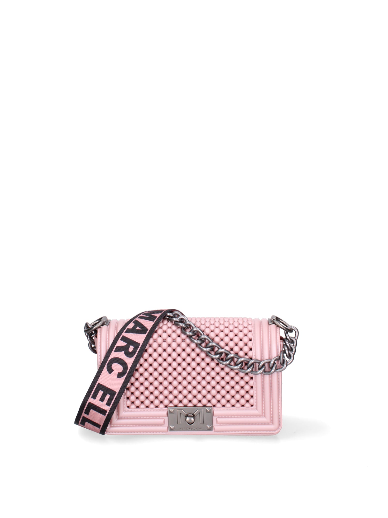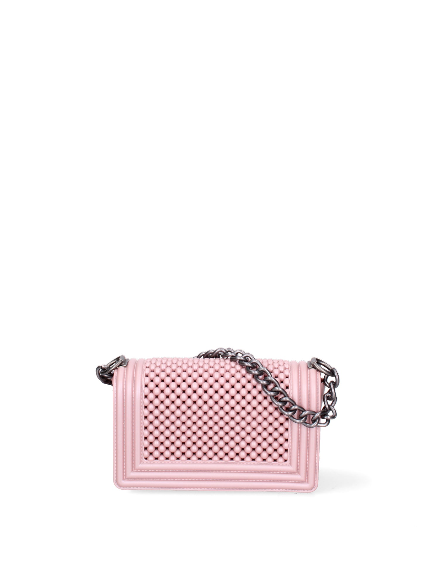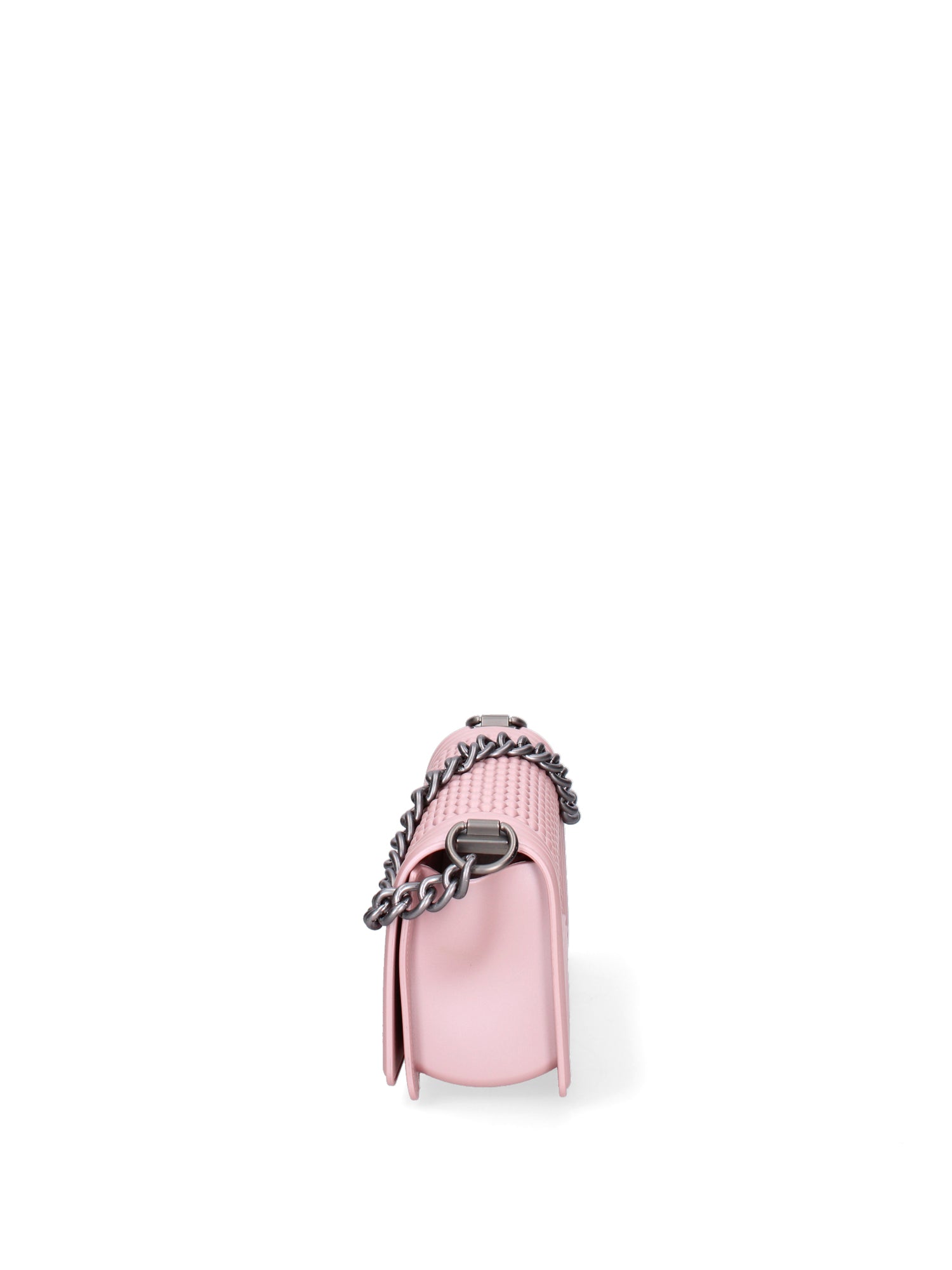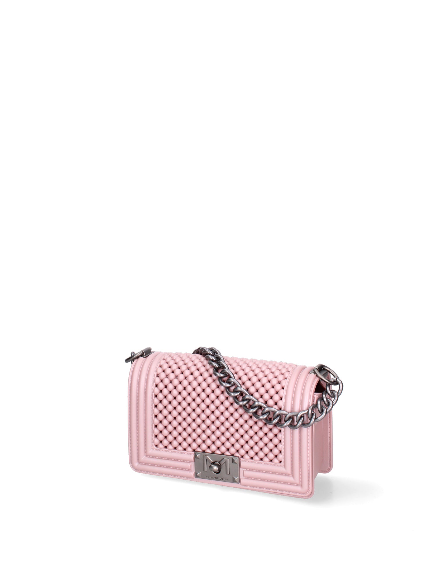 Women's handbag. It has a twist lock closure. There are no internal pockets. There are no external pockets. The shoulder strap is adjustable and removable in fabric. The handle is chain. There are one internal compartment. The exterior material is PVC. The interior is PVC. Dimensions: 11x19x6.5 cm. Fashion product
