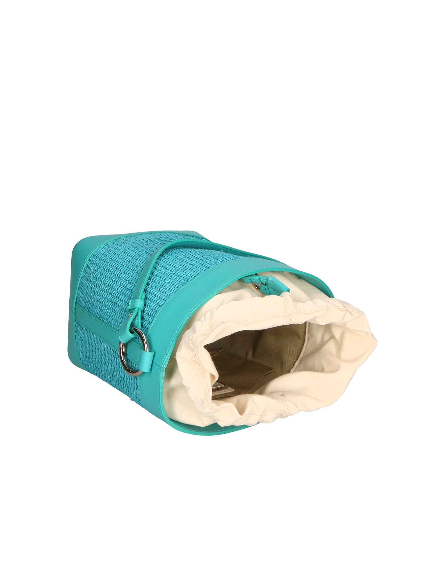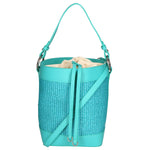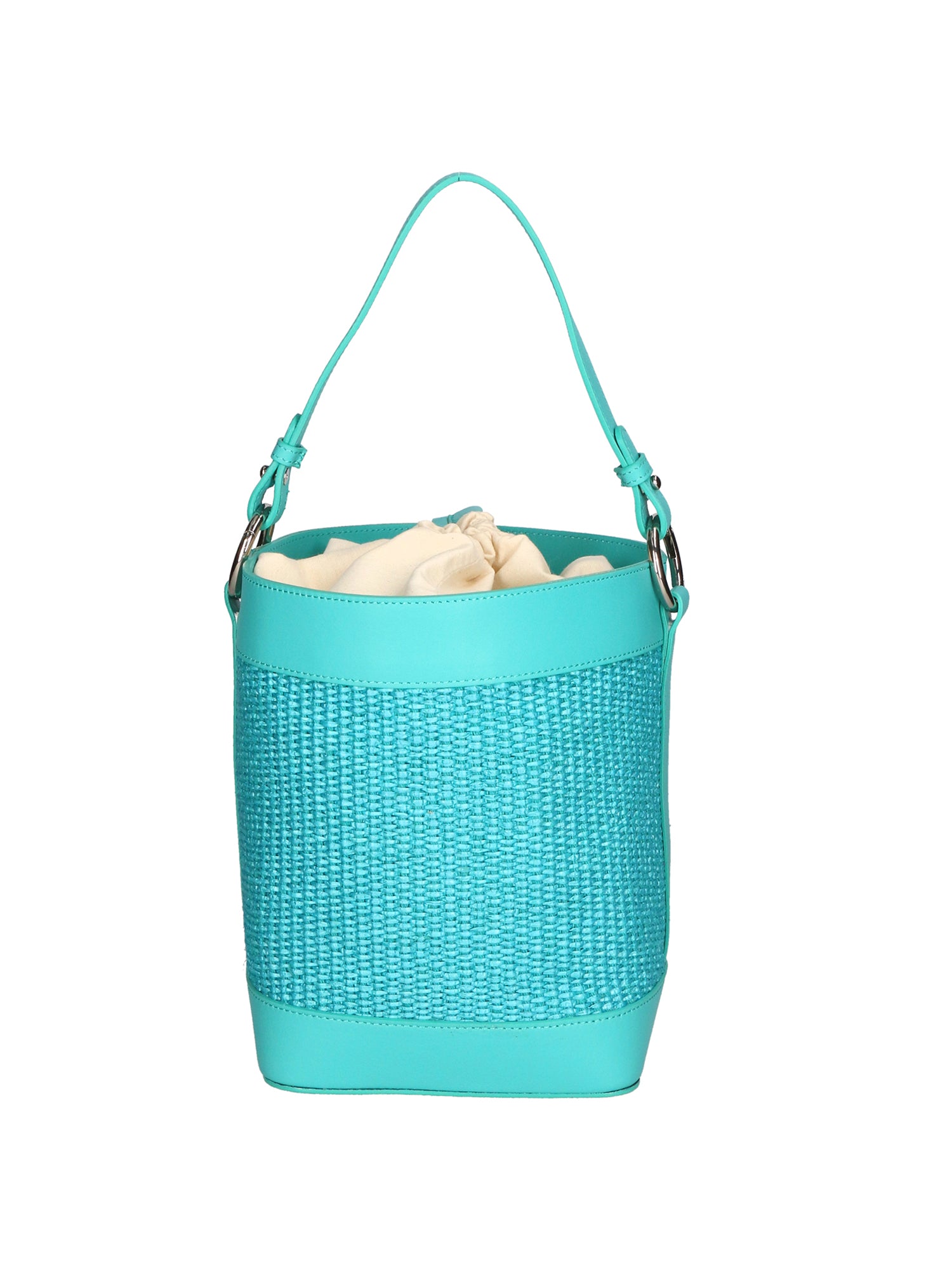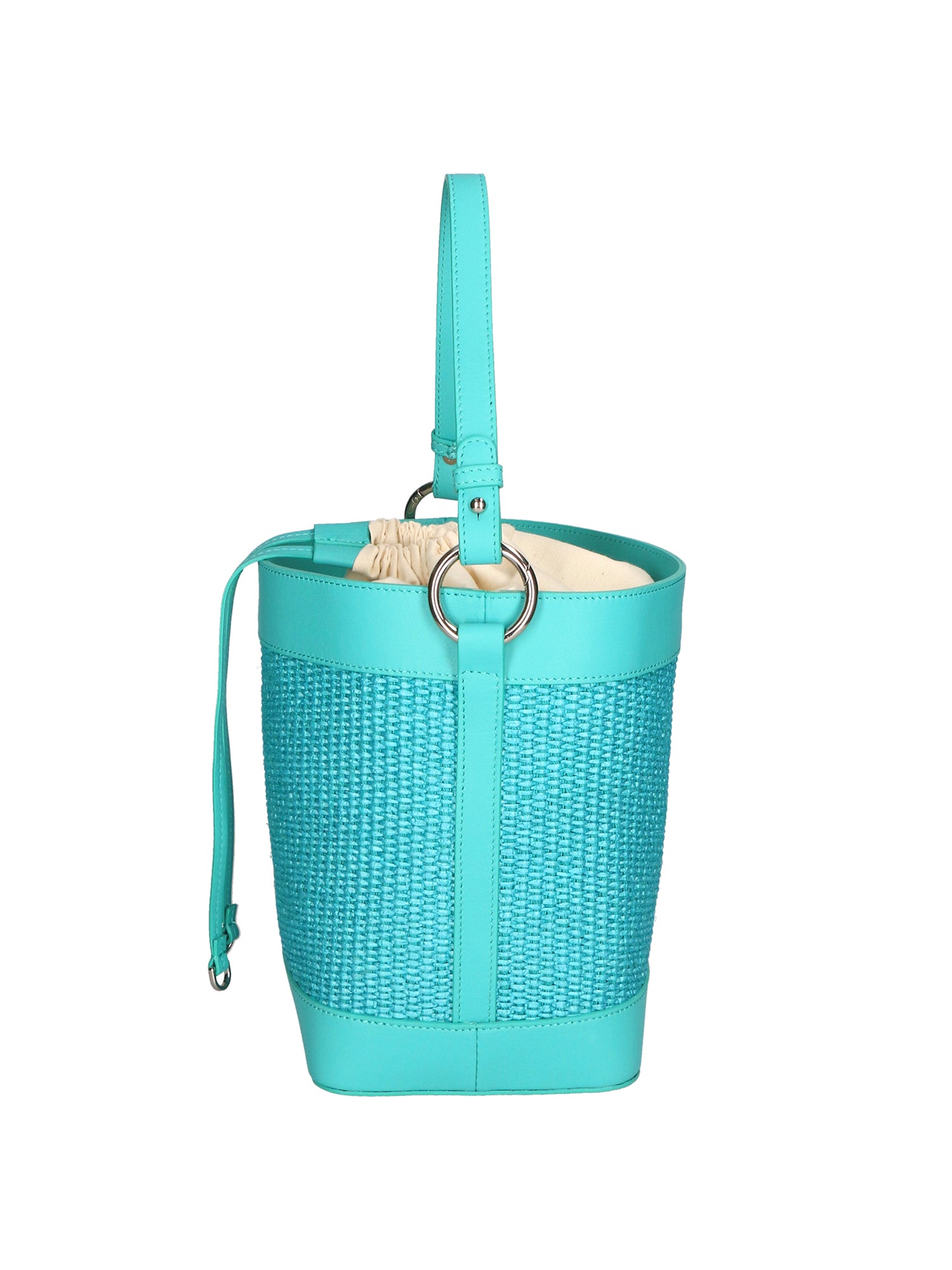 Women's bucket bag. It closes with a leather drawstring. There are one open interior pocket. There are no exterior pockets. The shoulder strap is adjustable and removable in leather. The handle is made of leather. There are one interior compartment. The exterior material is tabru straw and wild leather. The interior is lined with 70% cotton - 30% polyester. Dimensions: 24x18x15 cm. Made in Italy