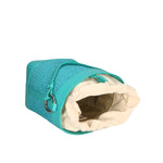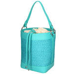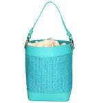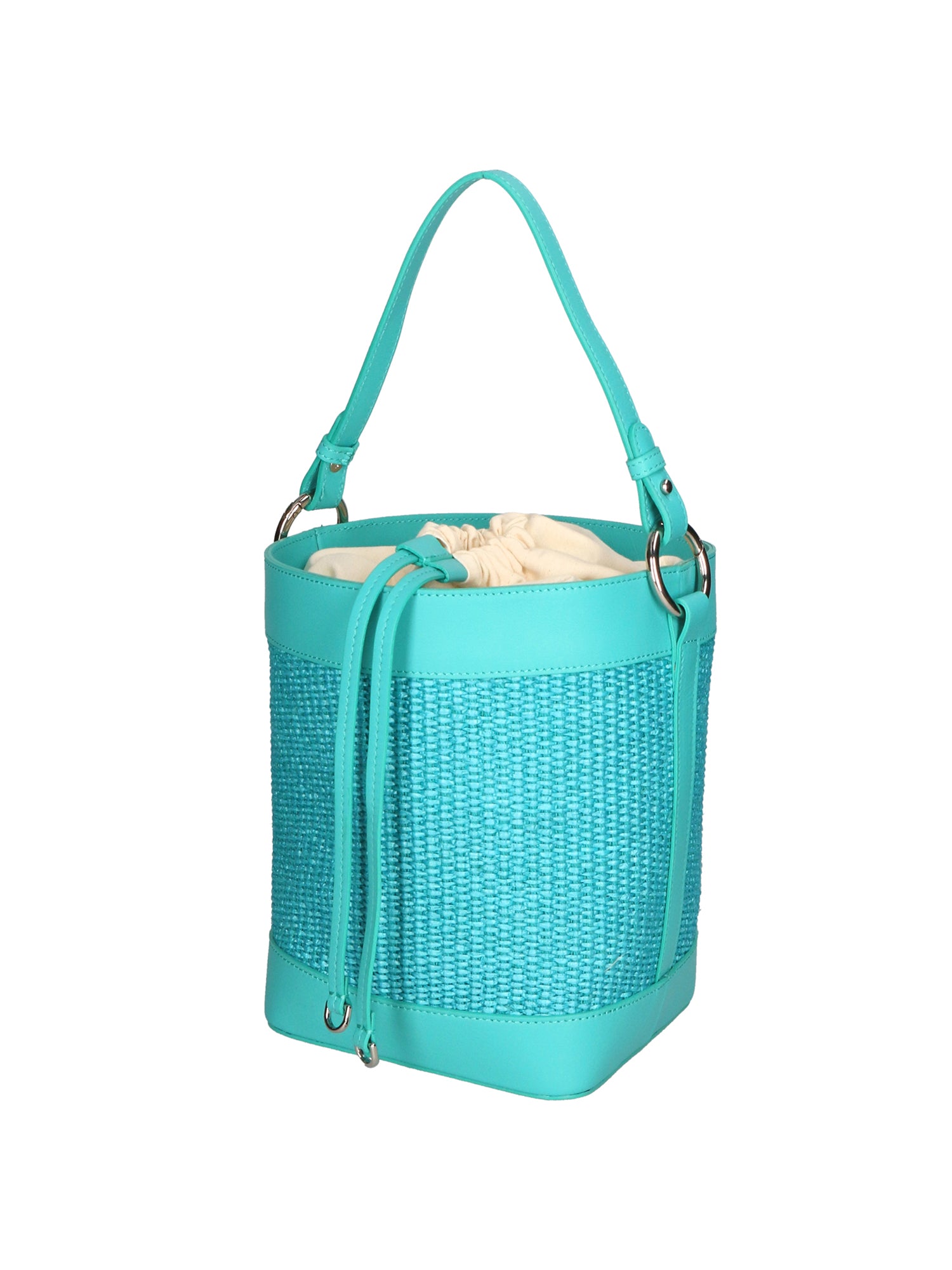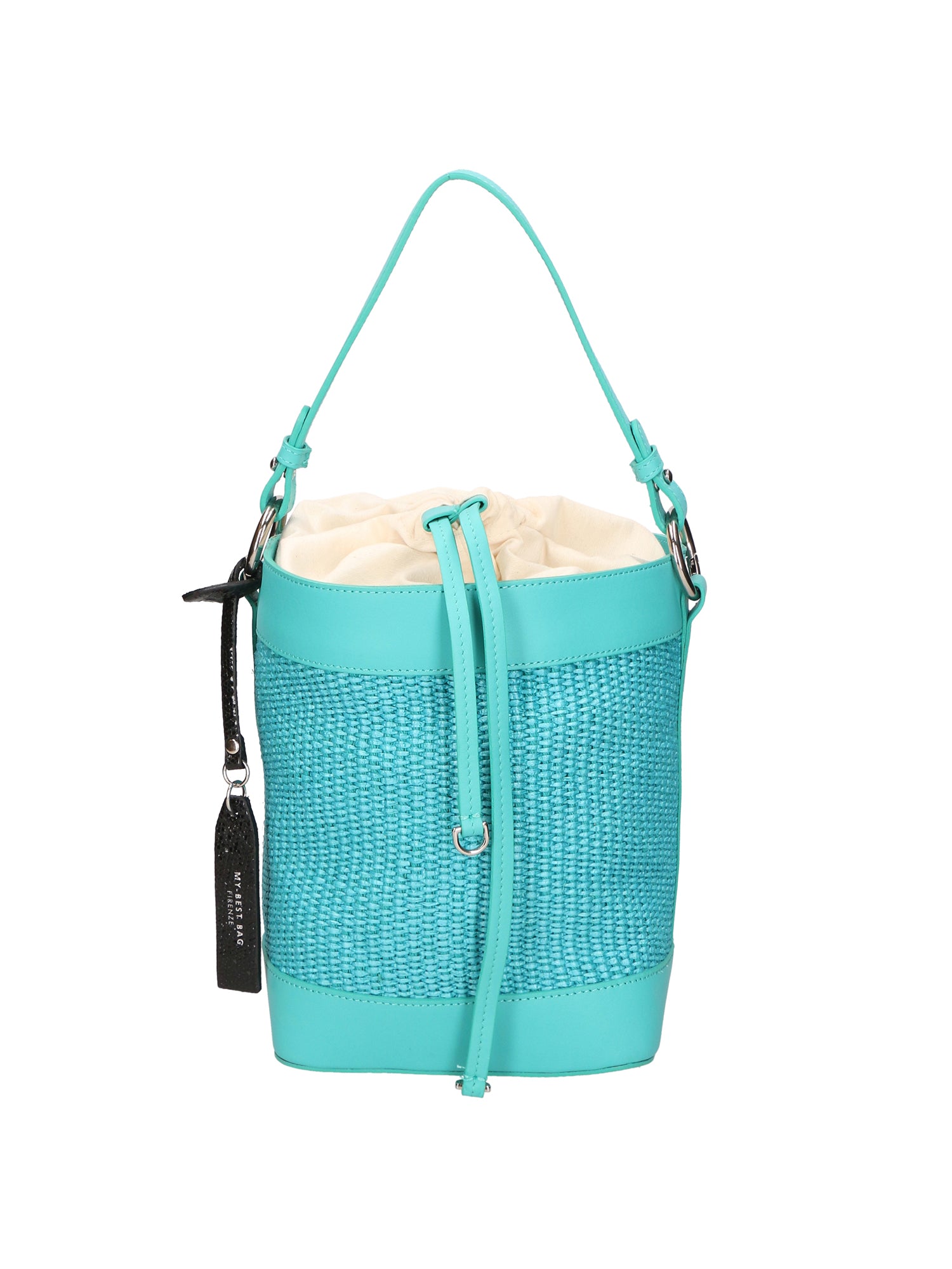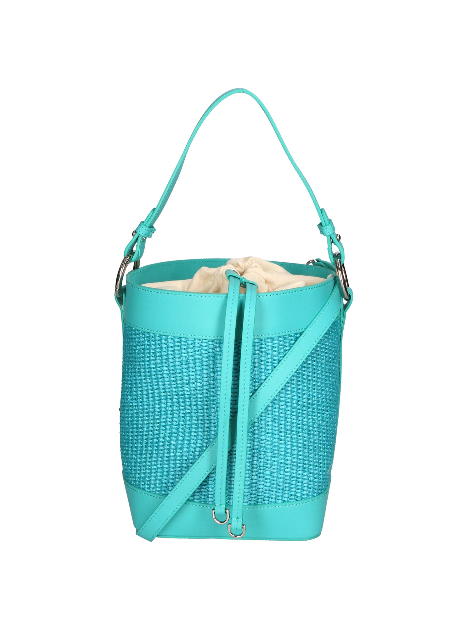 Women's bucket bag. It closes with a leather drawstring. There are one open interior pocket. There are no exterior pockets. The shoulder strap is adjustable and removable in leather. The handle is made of leather. There are one interior compartment. The exterior material is tabru straw and wild leather. The interior is lined with 70% cotton - 30% polyester. Dimensions: 24x18x15 cm. Made in Italy