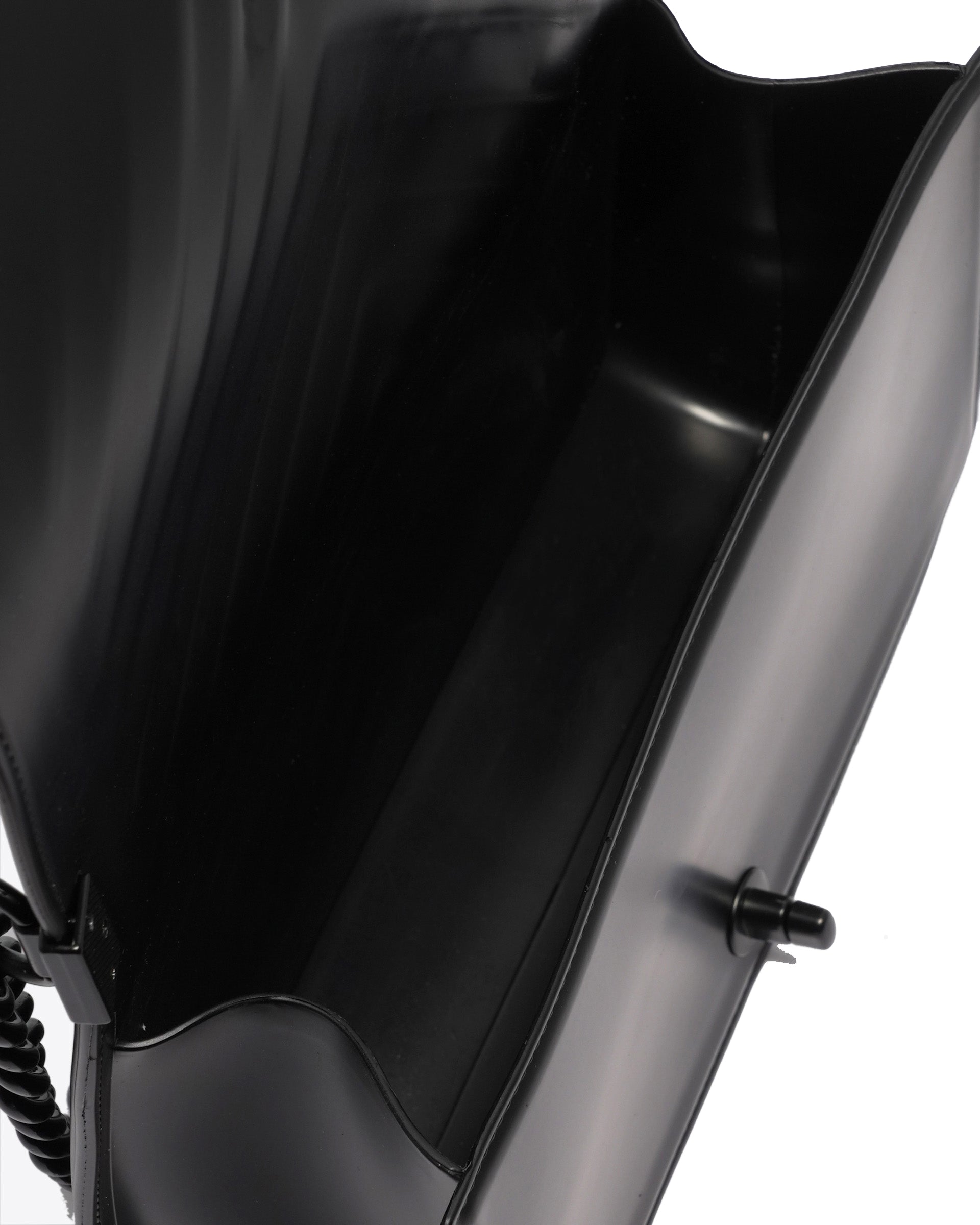 Women's handbag. It has a twist lock closure. There are no internal pockets. There are no external pockets. The shoulder strap is adjustable and removable and made of fabric. The handle is chain. There are one internal compartment. The exterior material is PVC. The interior is PVC. Dimensions: 25x15x8 cm. Fashion product