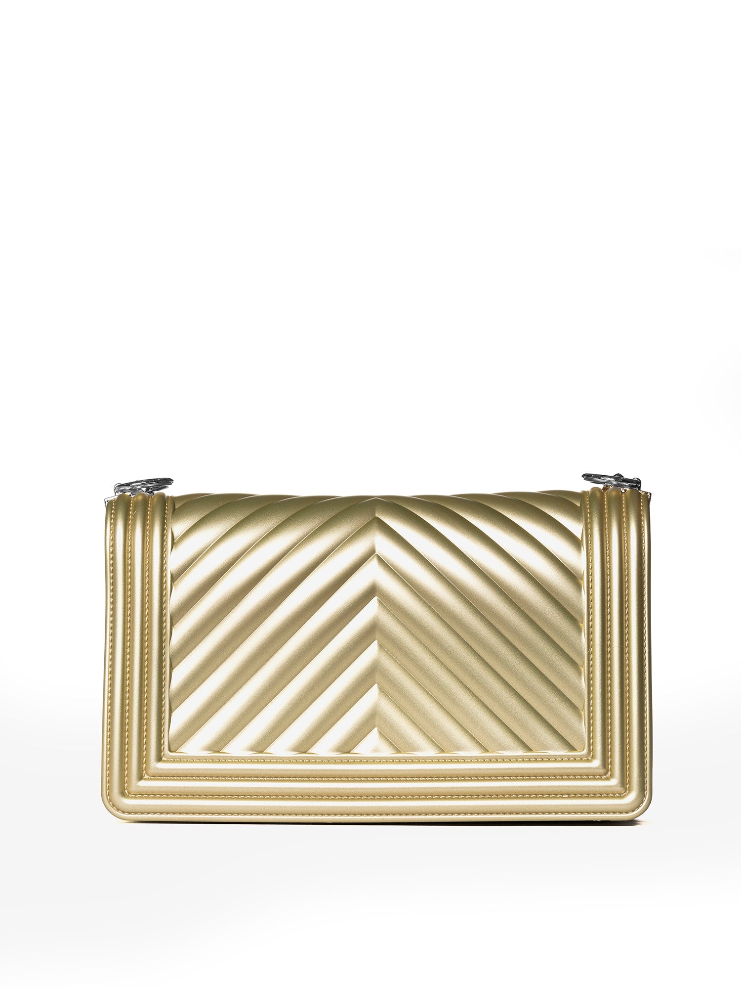 Made entirely of high- quality rubber, both inside and out, this bag offers a unique texture and surprising resistance. The elegant design is enhanced by a twist lock closure that adds a touch of sophistication.