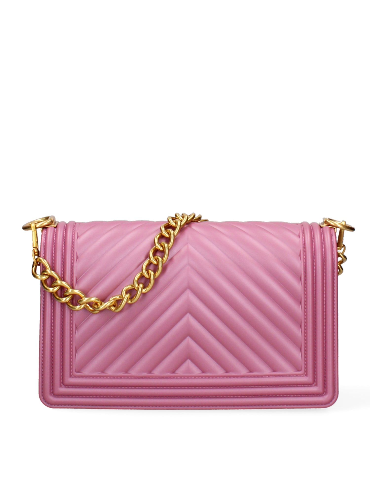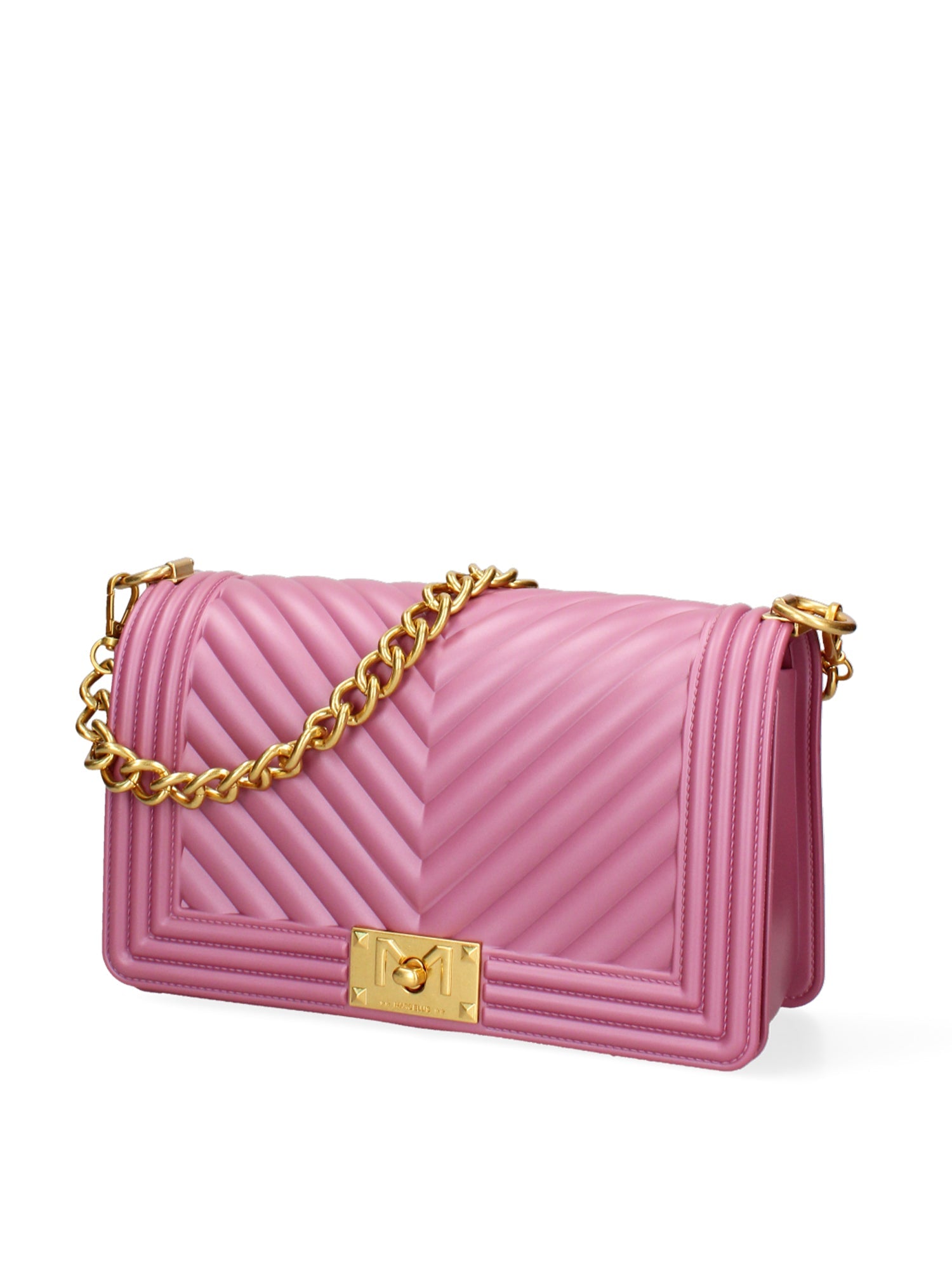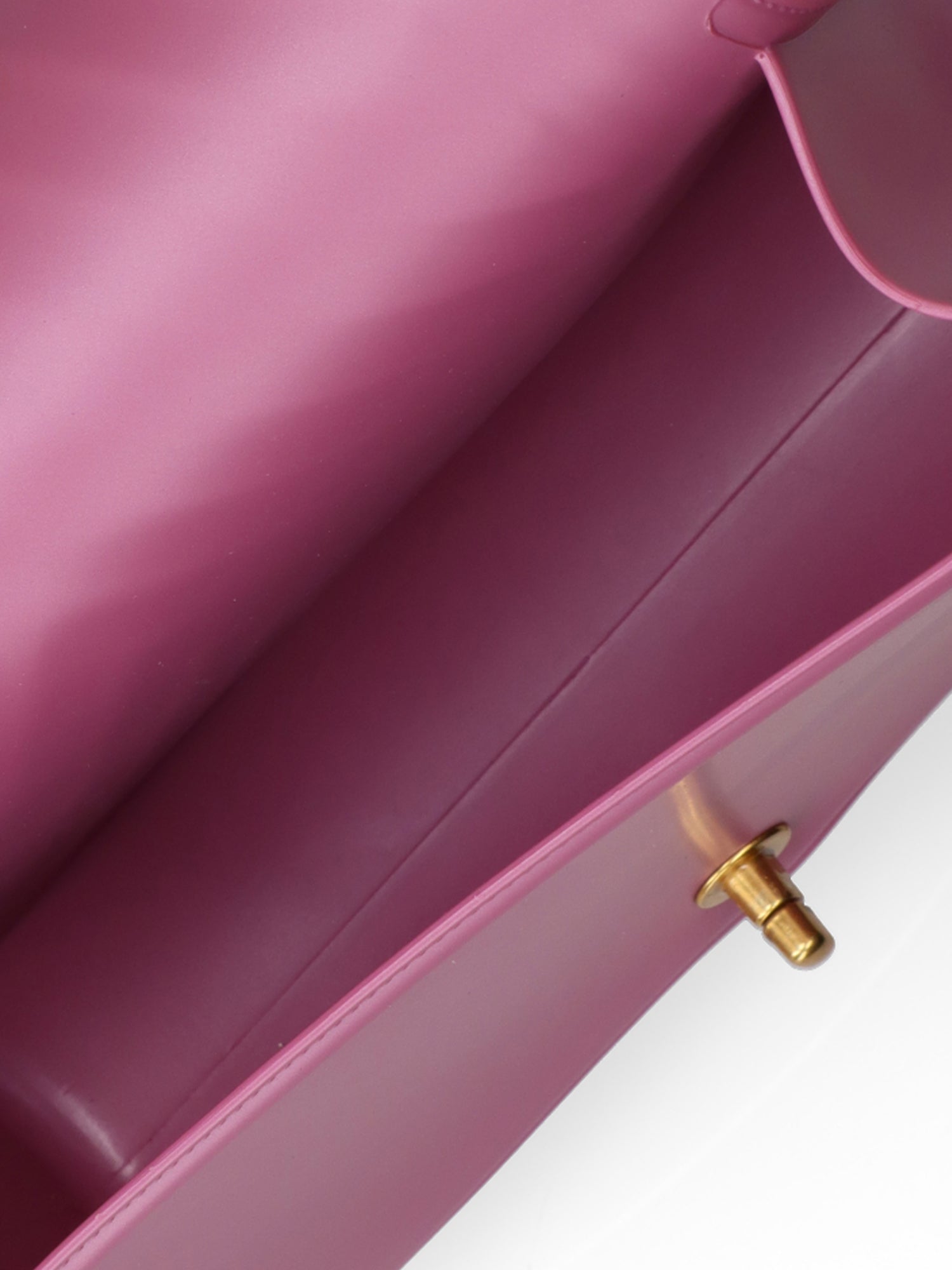 Made entirely of high- quality rubber, both inside and out, this bag offers a unique texture and surprising resistance. The elegant design is enhanced by a twist lock closure that adds a touch of sophistication.