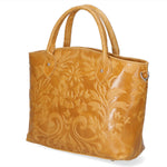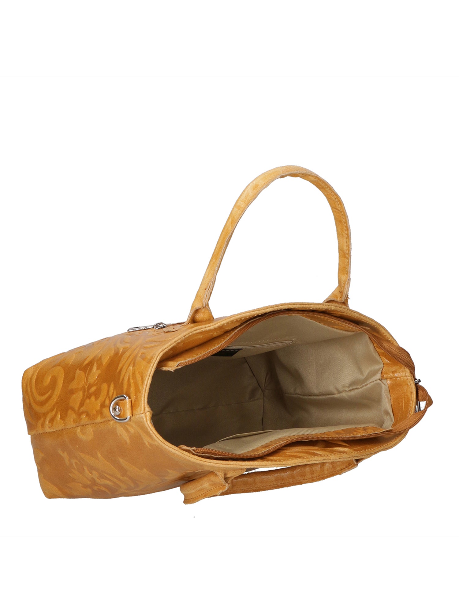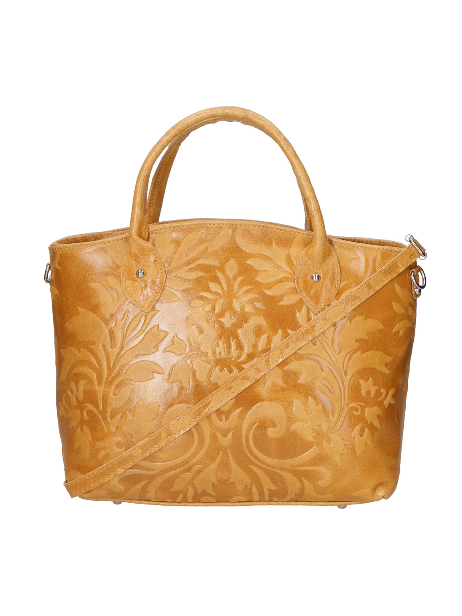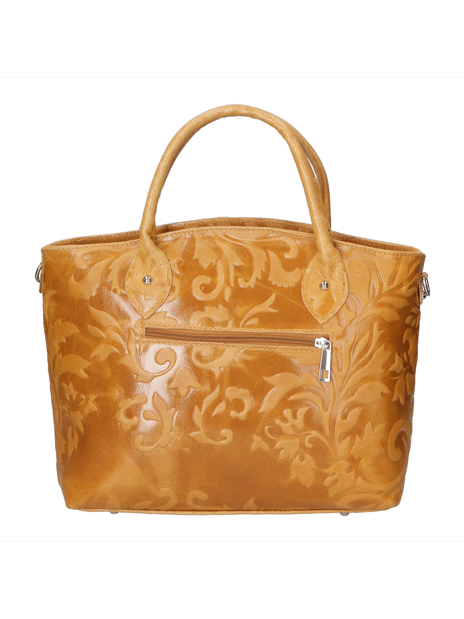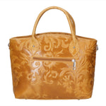 Women's single-compartment handbag with double handles, a back zip pocket, and an adjustable, removable shoulder strap. Handcrafted in Italy, made from genuine smooth printed suede with an embossed floral design. Made in Italy.