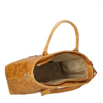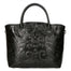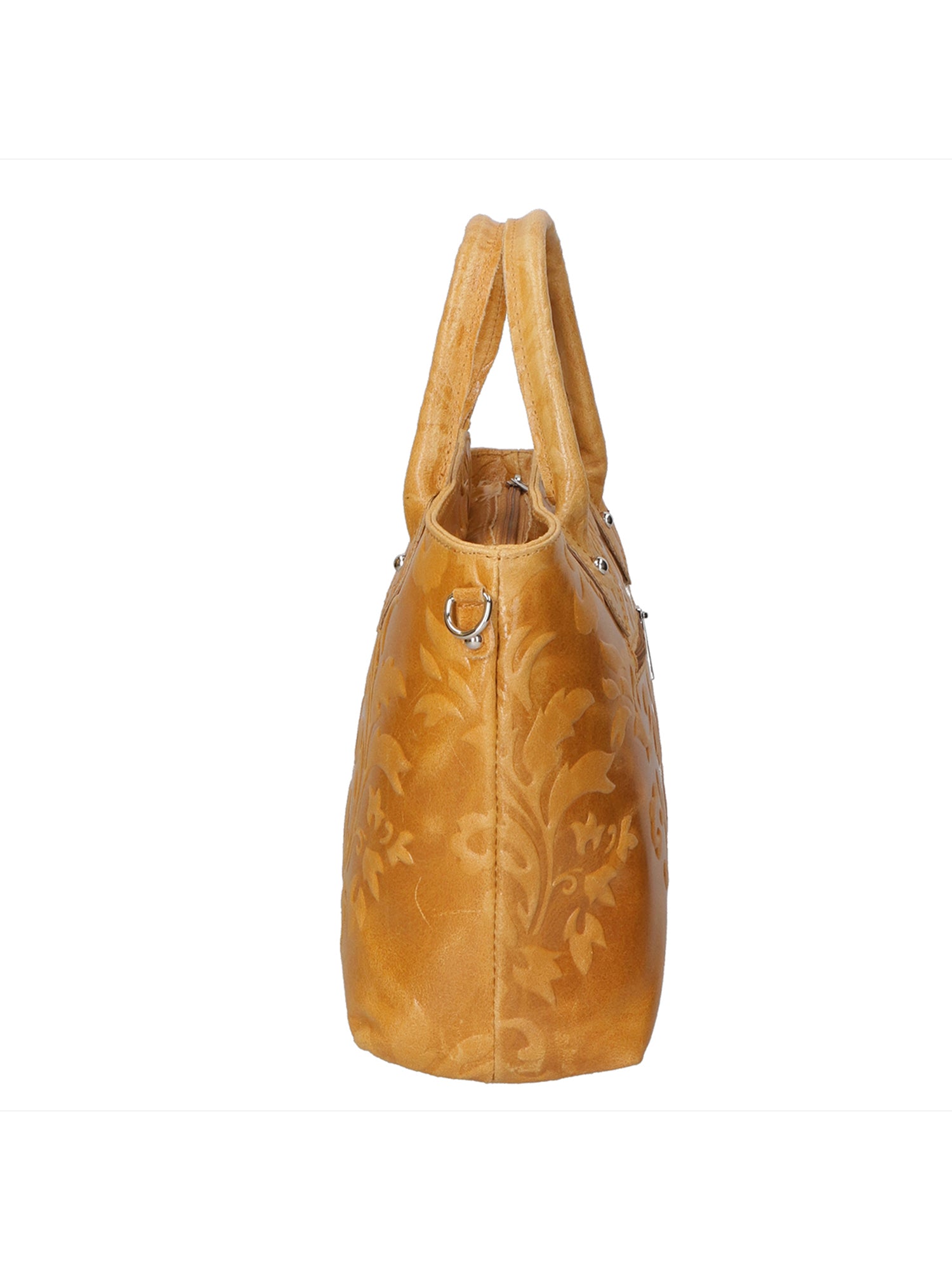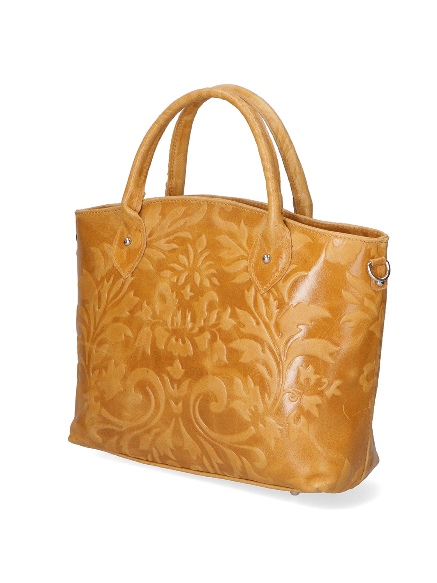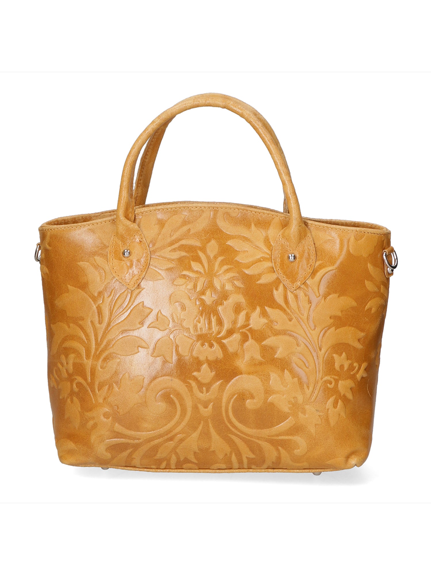Women's single-compartment handbag with double handles, a back zip pocket, and an adjustable, removable shoulder strap. Handcrafted in Italy, made from genuine smooth printed suede with an embossed floral design. Made in Italy.