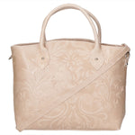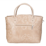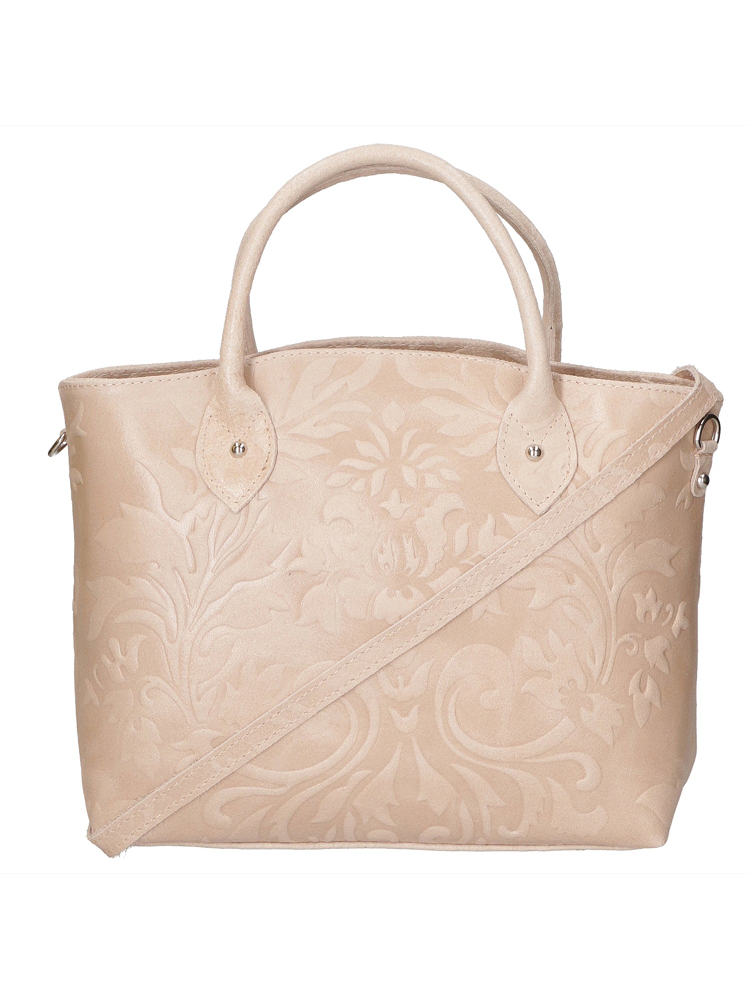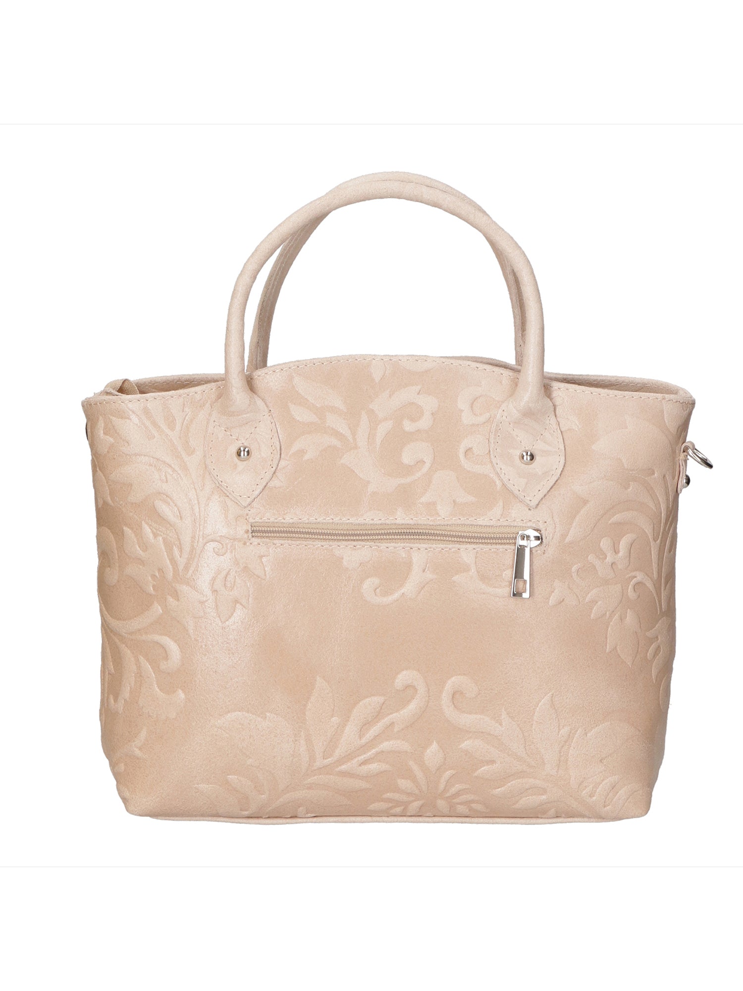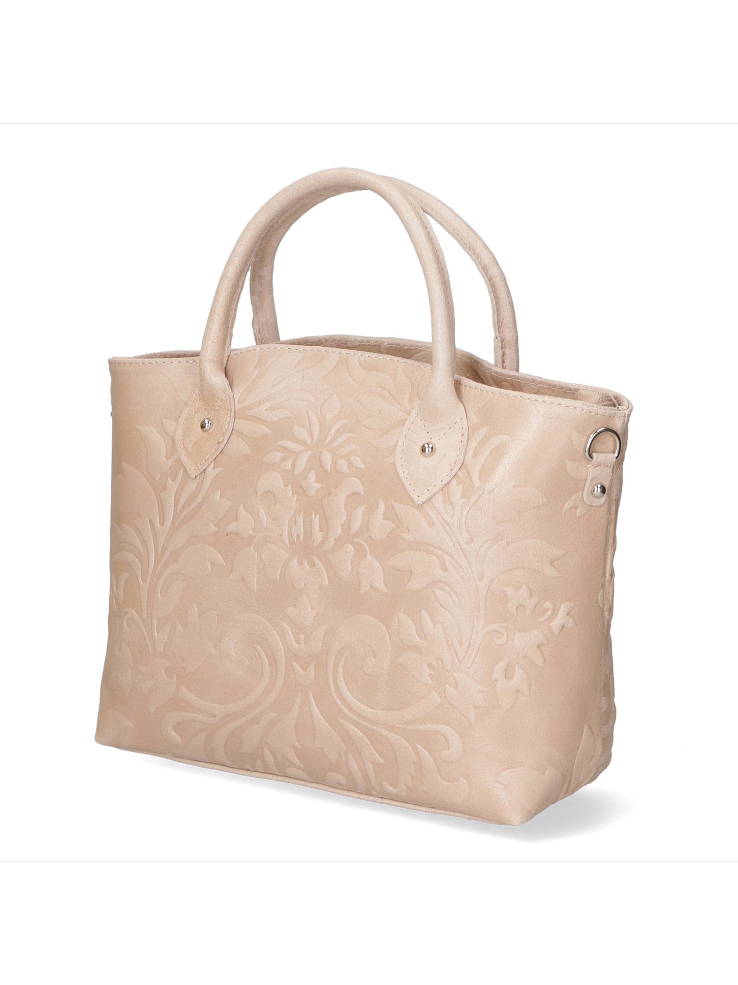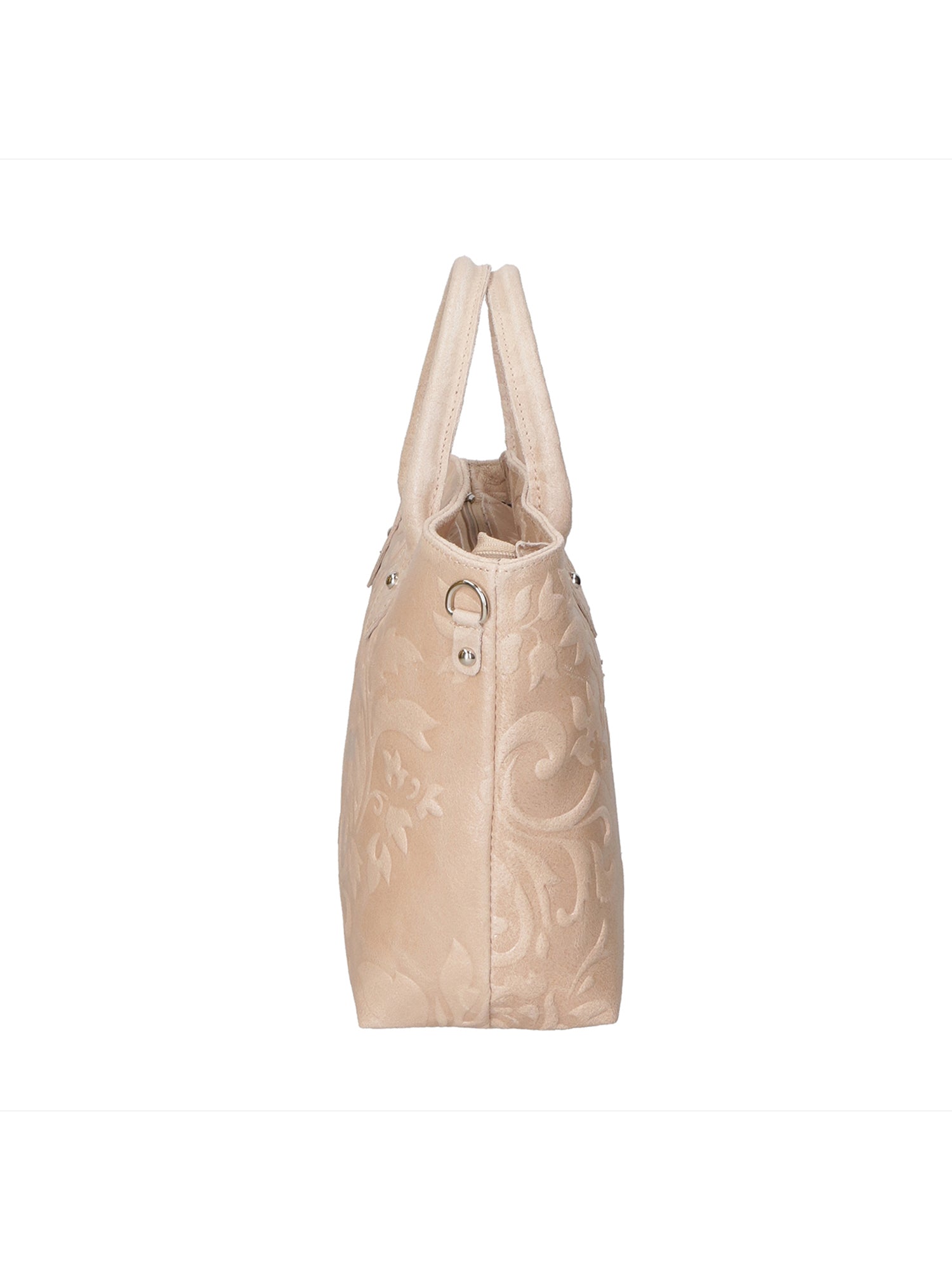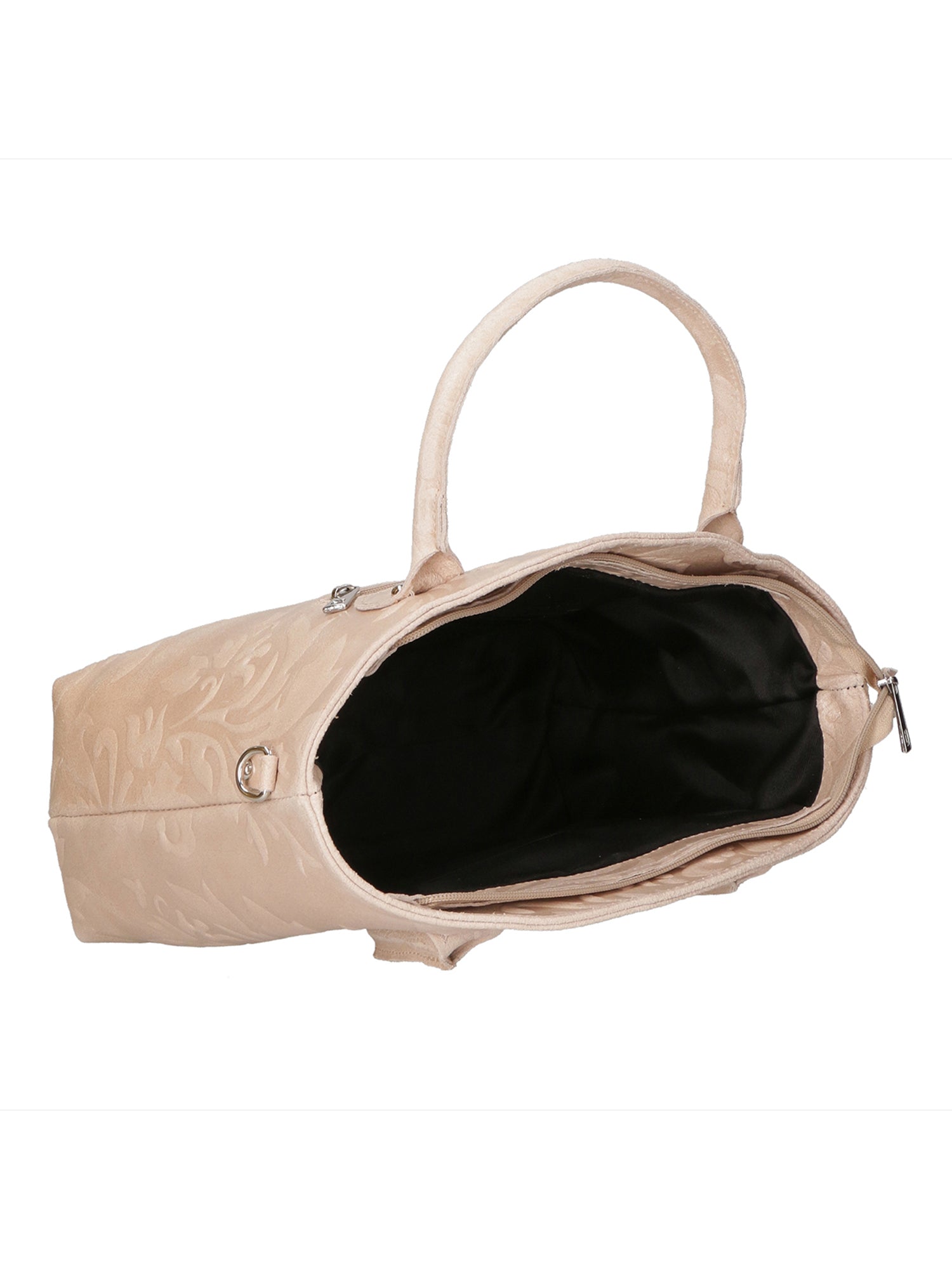 Women's single-compartment handbag with double handles, a back zip pocket, and an adjustable, removable shoulder strap. Handcrafted in Italy, made from genuine smooth printed suede with an embossed floral design. Made in Italy.