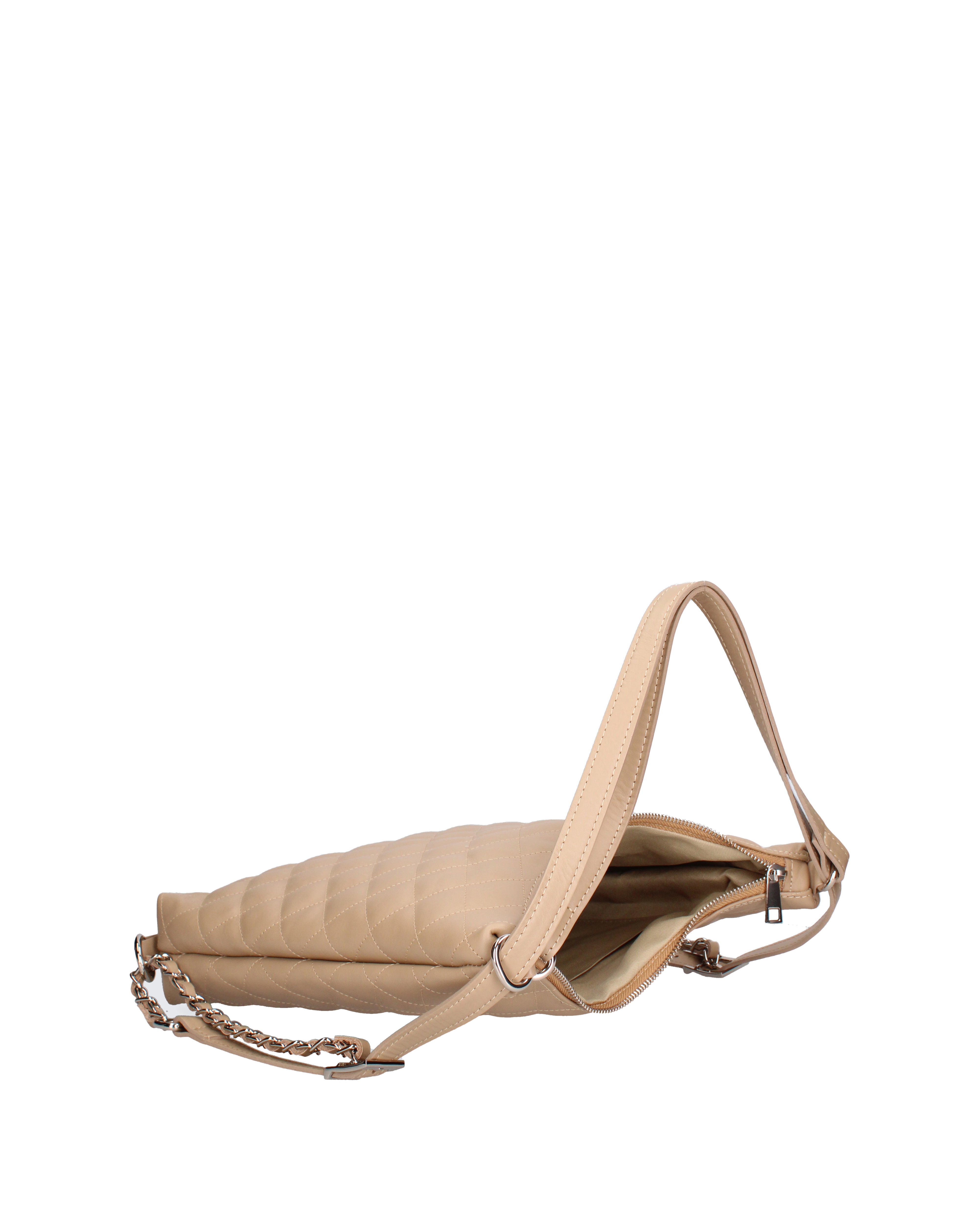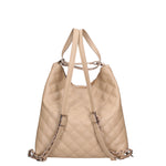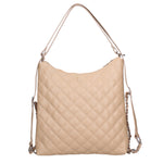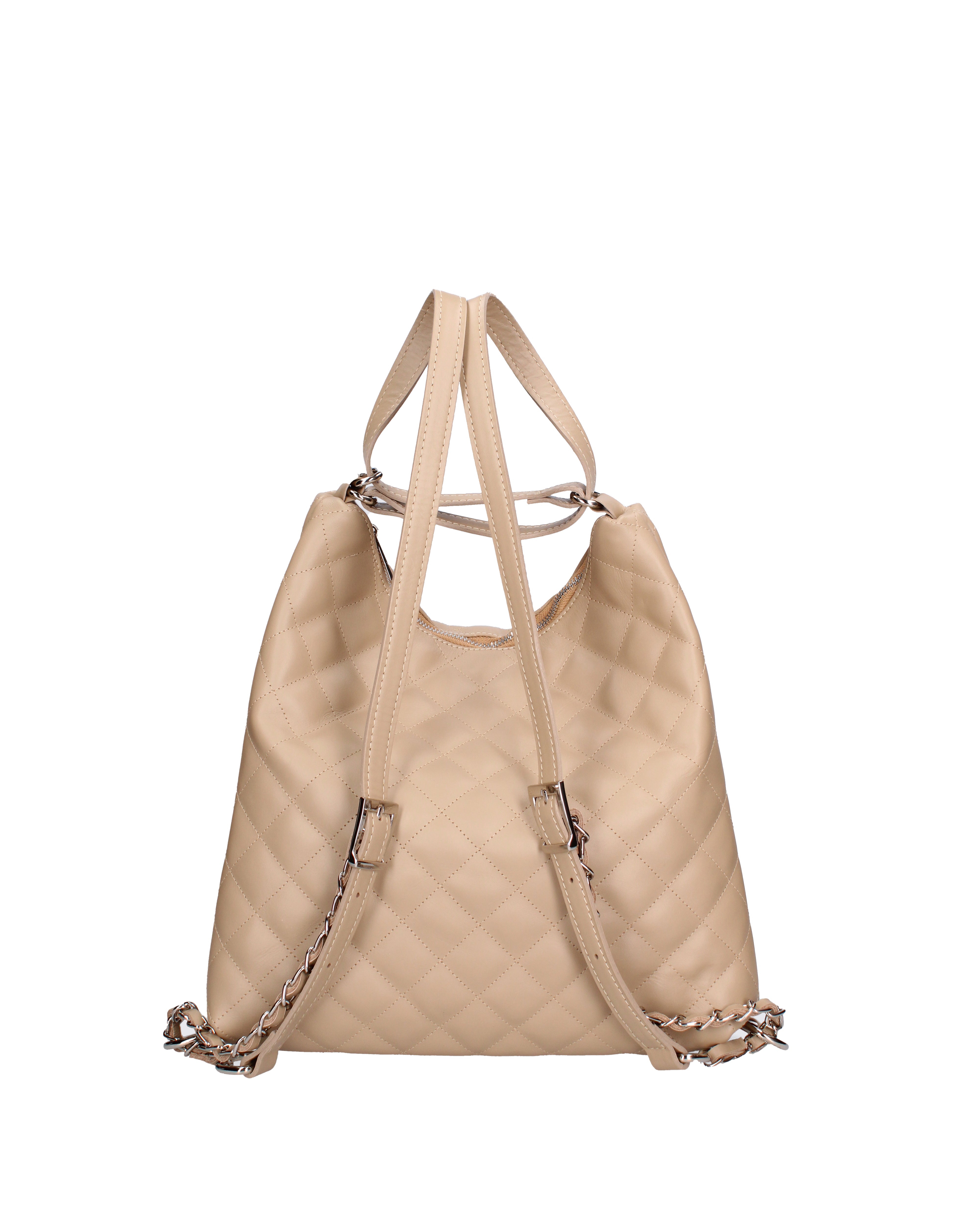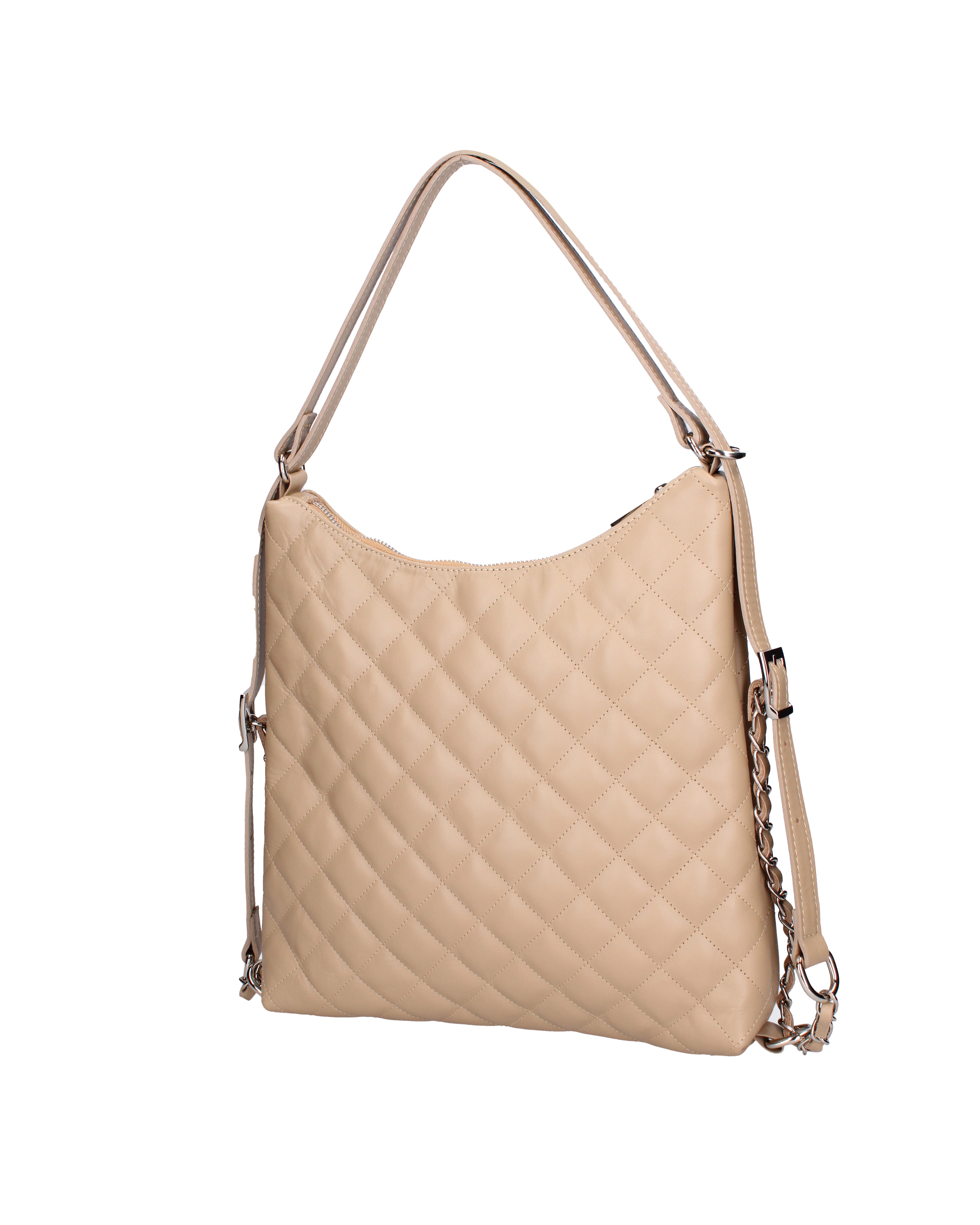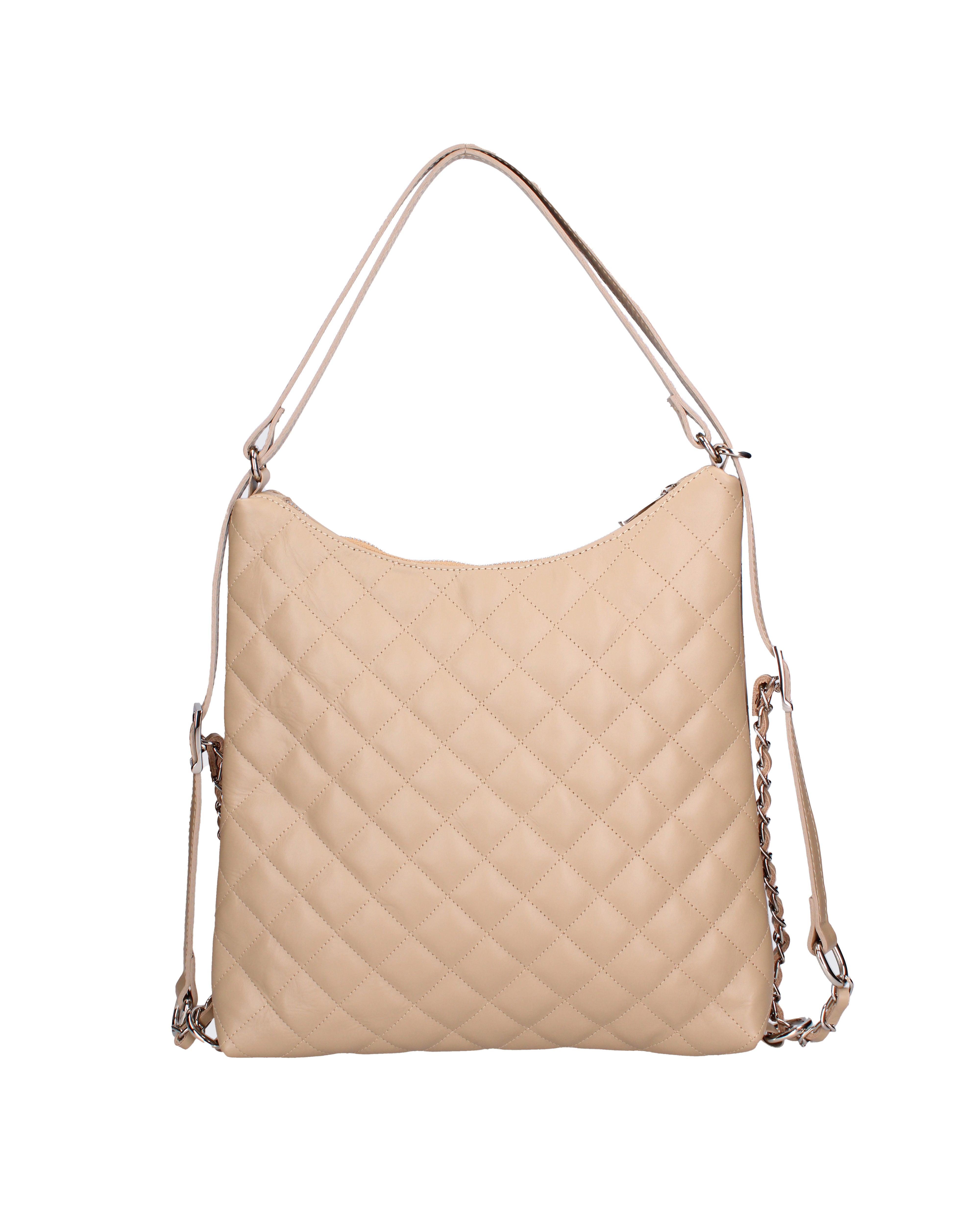 Women's convertible shoulder bag/backpack. Zip closure. One internal zip pocket and two open pockets. No external pockets. No shoulder strap. Leather handle. One internal compartment. The exterior is made of genuine quilted sauvage leather. The interior is lined with 70% cotton - 30% polyester. Dimensions: 30x31x6 cm. Made in Italy.