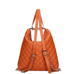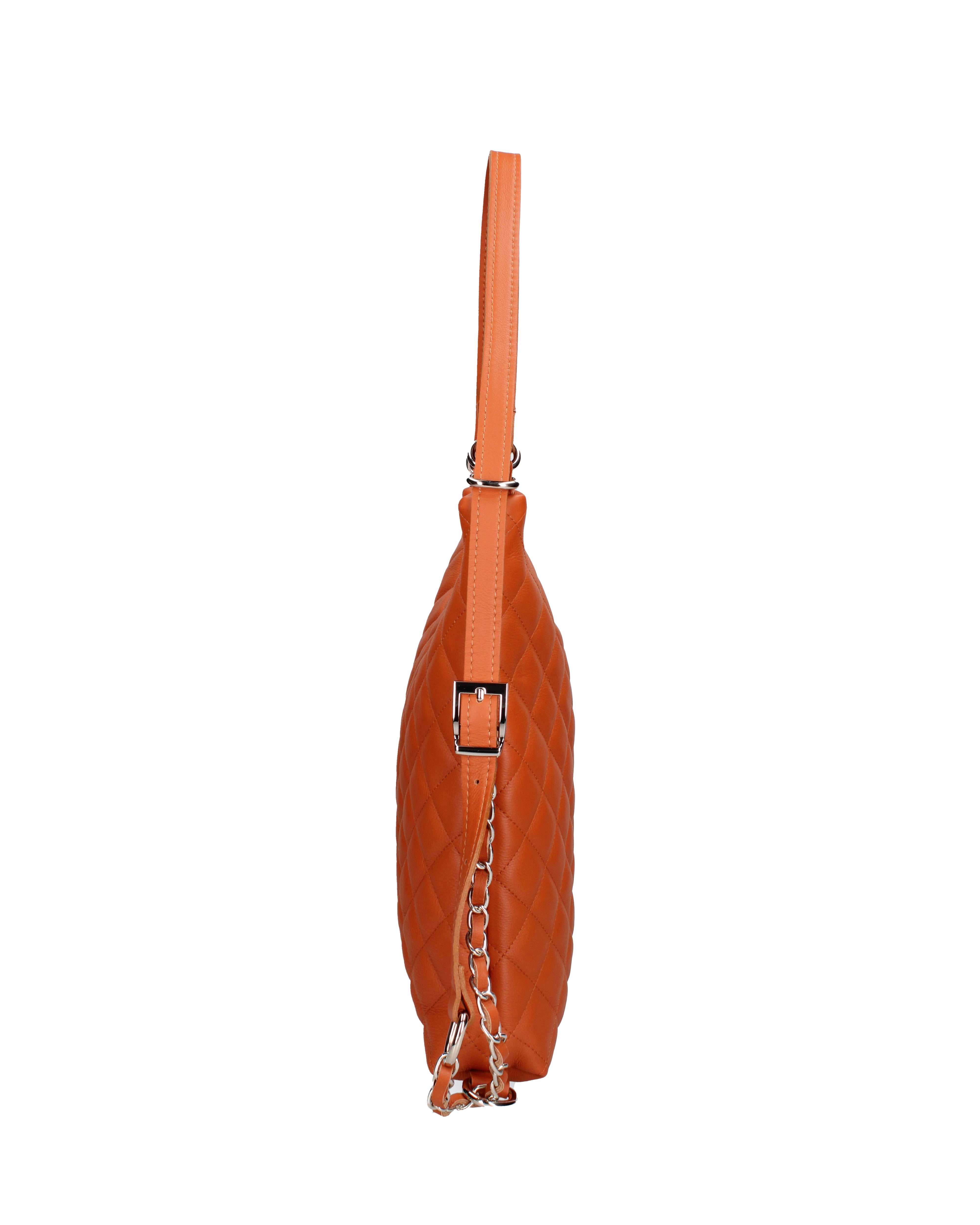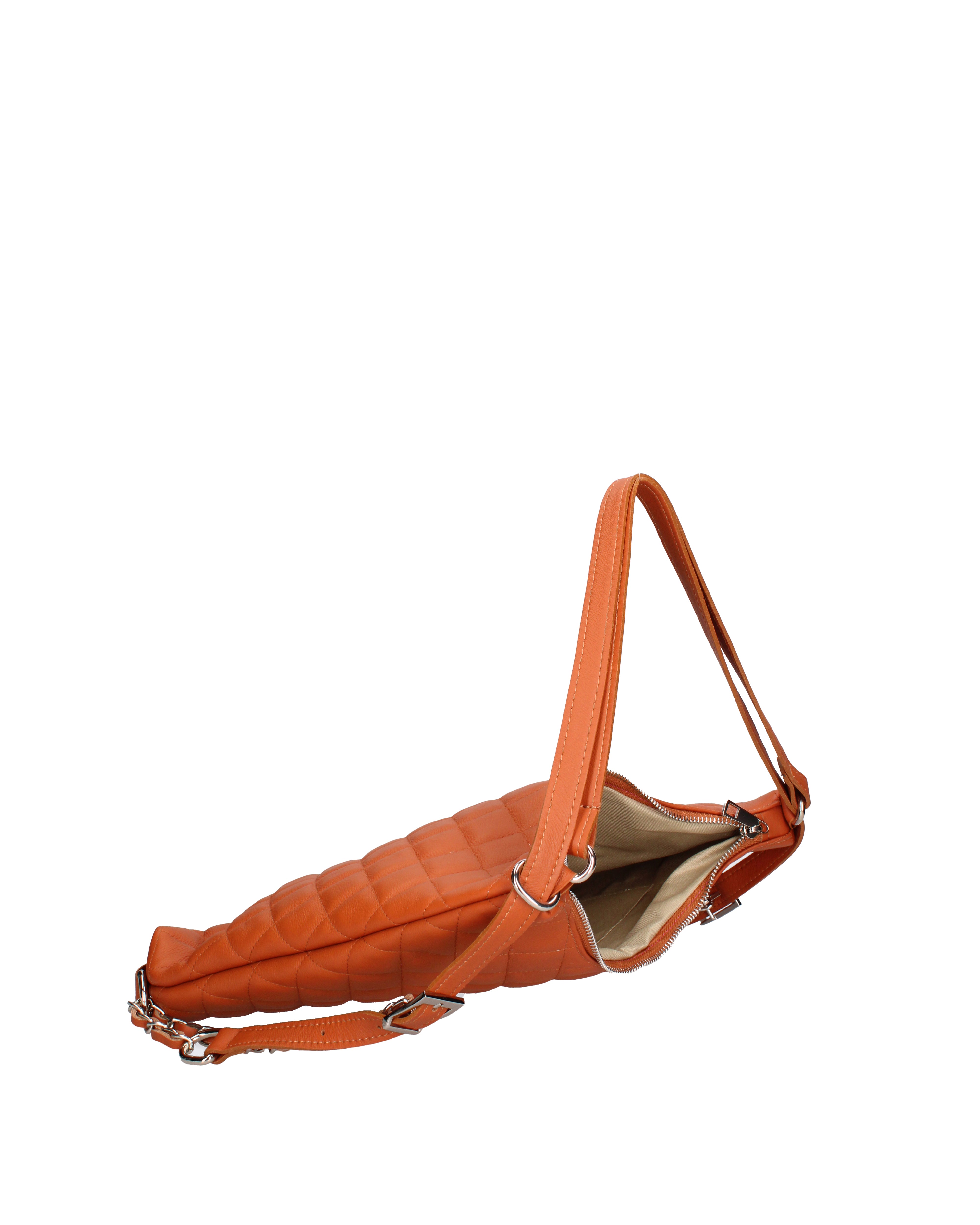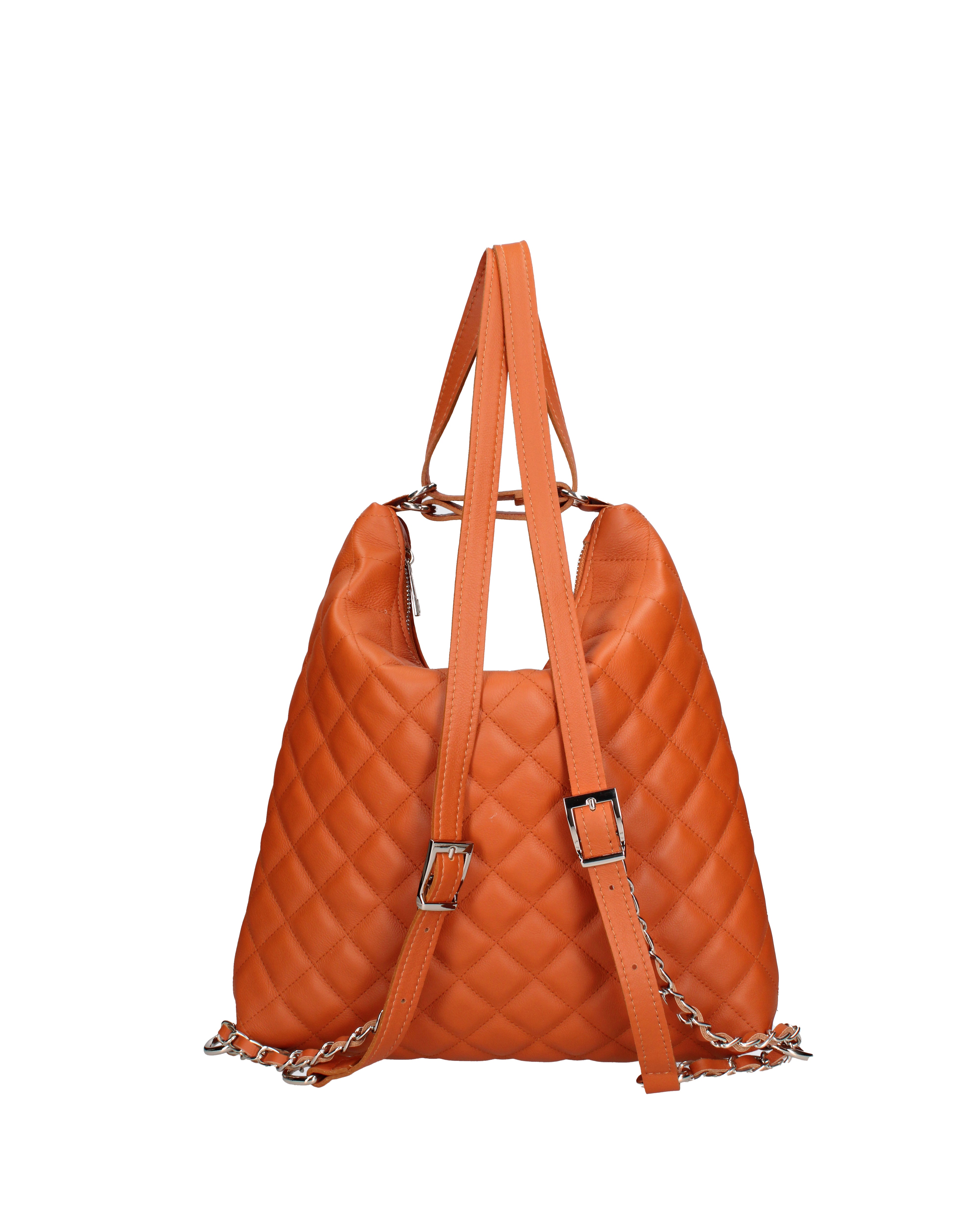 Women's convertible shoulder bag/backpack. Zip closure. One internal zip pocket and two open pockets. No external pockets. No shoulder strap. Leather handle. One internal compartment. The exterior is made of genuine quilted sauvage leather. The interior is lined with 70% cotton - 30% polyester. Dimensions: 30x31x6 cm. Made in Italy.