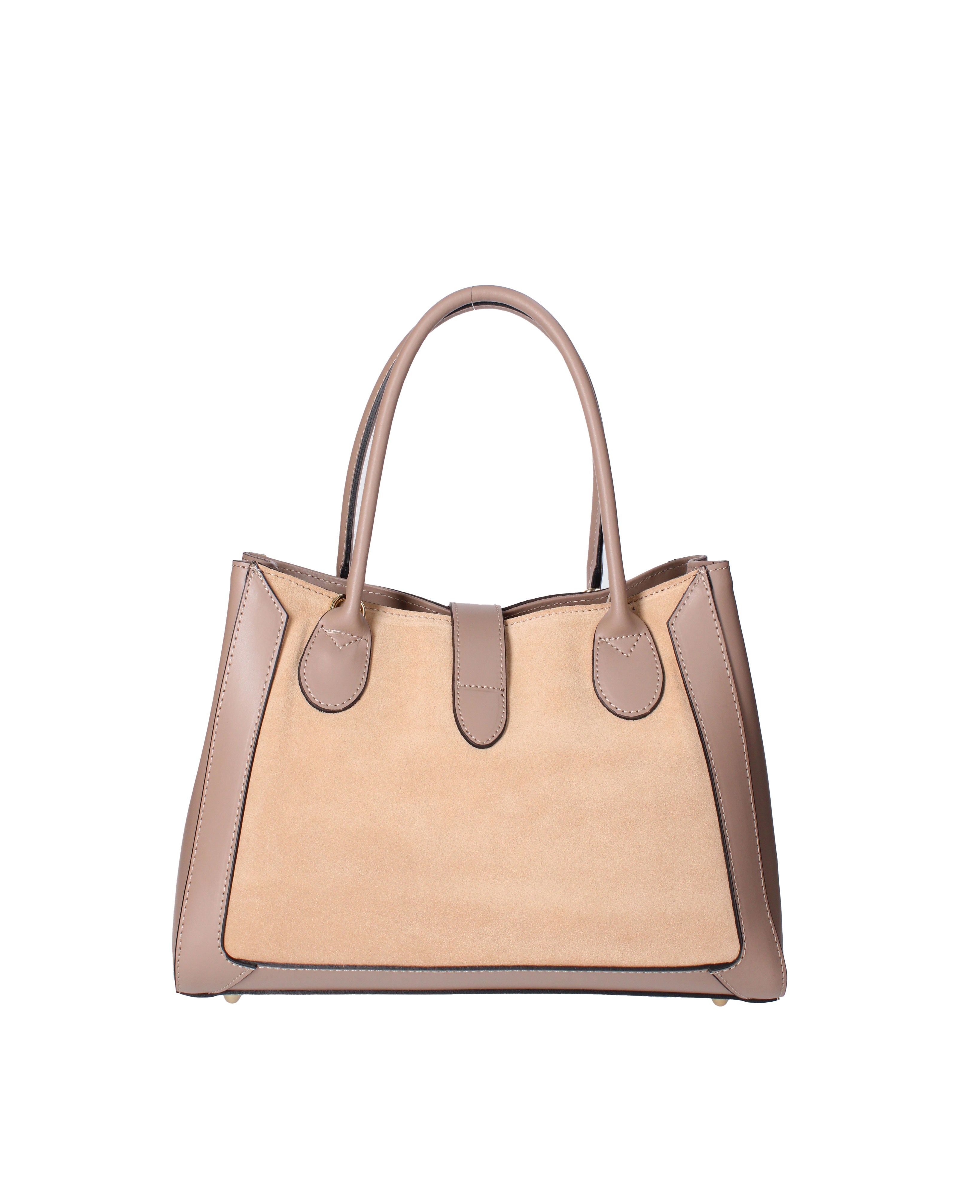 Women's handbag. Zip closure. Two internal pockets with zips and one open pocket. No external pockets. Adjustable and removable leather shoulder strap. Leather handle. Two internal compartments. The exterior is made of genuine suede and wrinkle leather. Lining: 70% cotton - 30% polyester. Dimensions: 35 x 25.5 x 15 cm. Made in Italy.