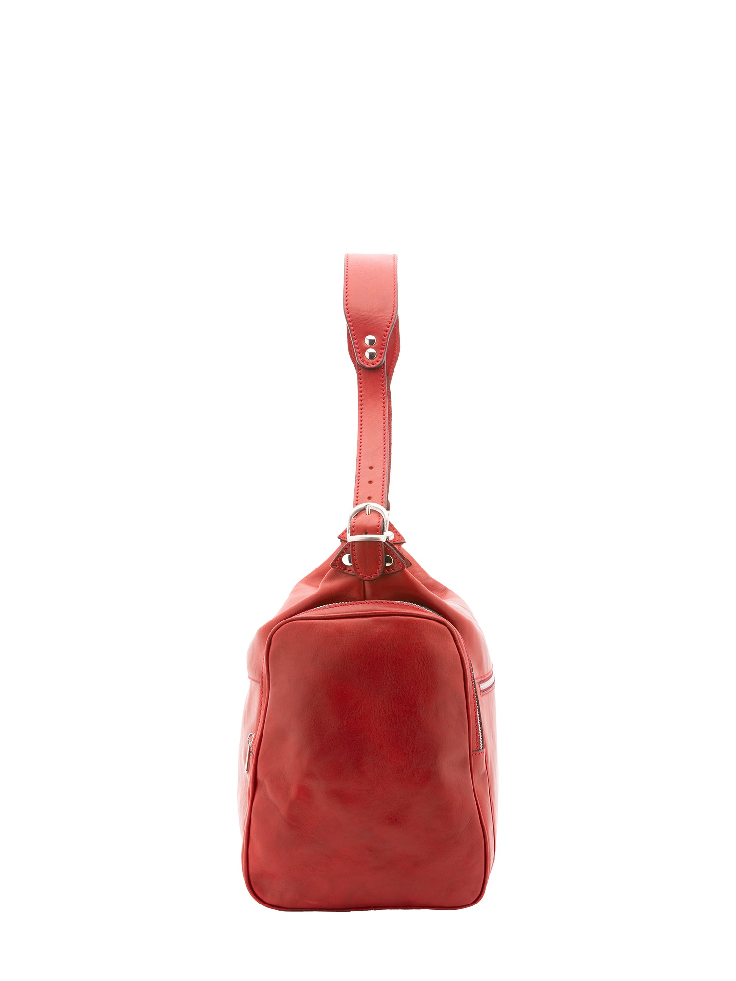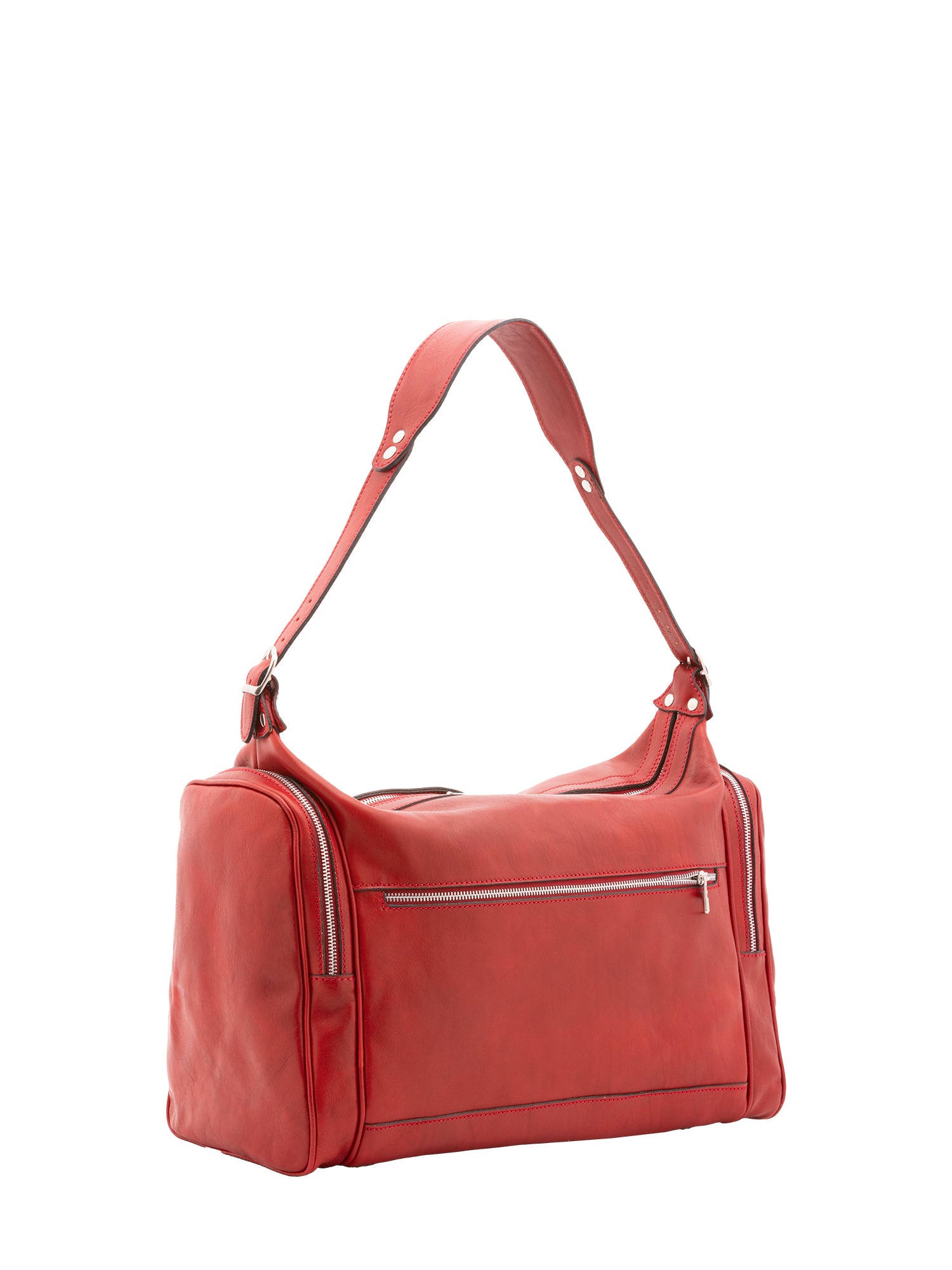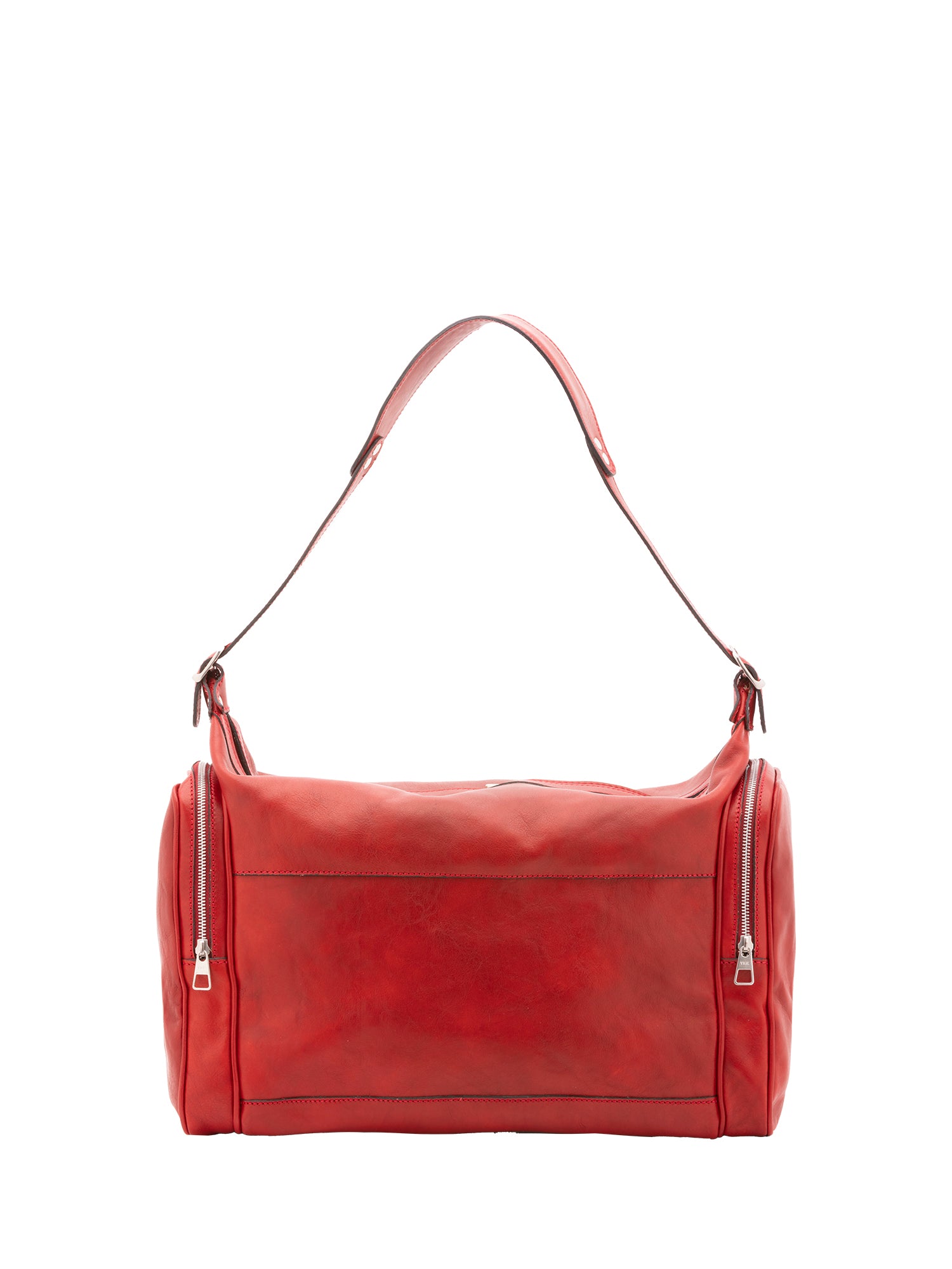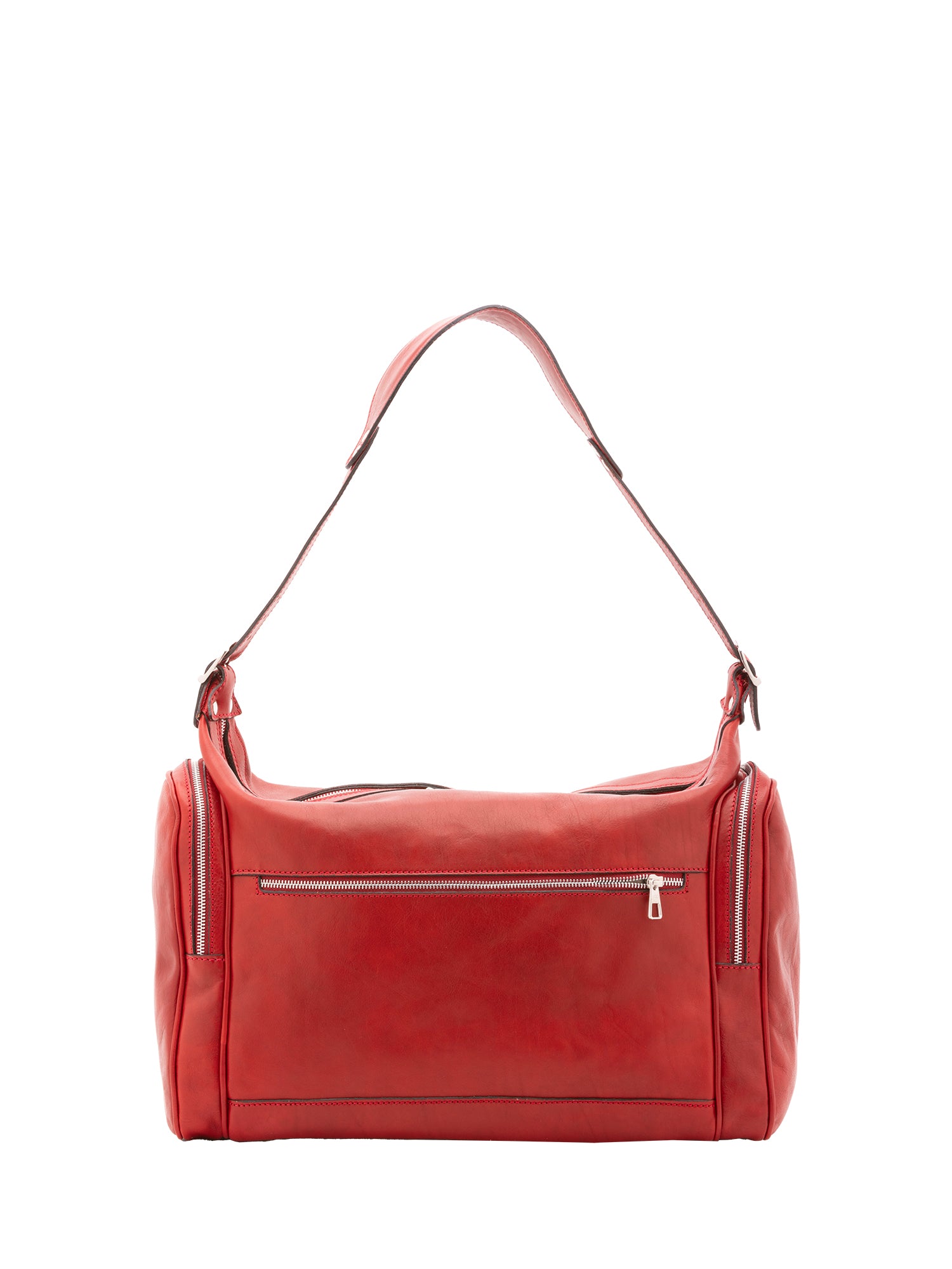Sac de voyage unisexe. La fermeture est à zip. Les poches intérieures sont une avec un zip. Les poches extérieures sont une poche avant zippée et deux poches latérales zippées. La bandoulière est réglable et amovible en cuir. La poignée est manquante. Il y a un compartiment interne. Le matériau extérieur est 100 % cuir véritable. L'intérieur est doublé en coton. Dimensions : 45x35x23 cm. Fabriqué en Italie