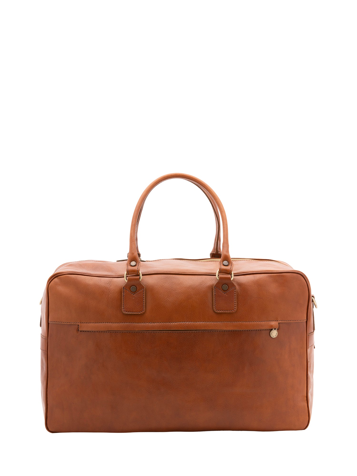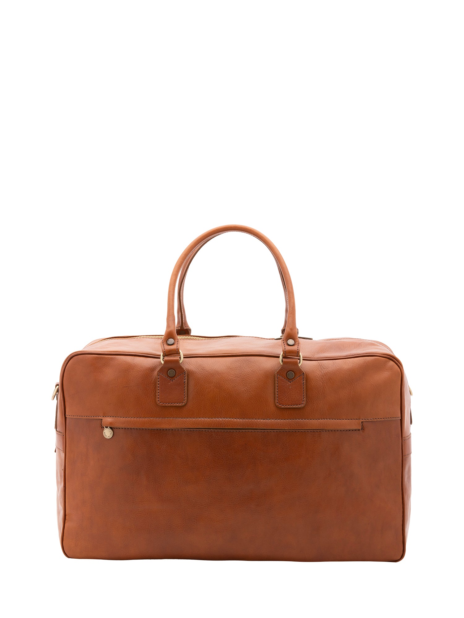 Sac de voyage unisexe. La fermeture est à zip. Les poches intérieures sont une avec un zip. Les poches extérieures sont une poche avant zippée et une poche arrière zippée. La bandoulière est réglable et amovible en cuir. La poignée est en cuir. Il y a un compartiment interne. Le matériau extérieur est 100 % cuir véritable. L'intérieur est doublé en coton. Dimensions : 53x46x23 cm. Fabriqué en Italie