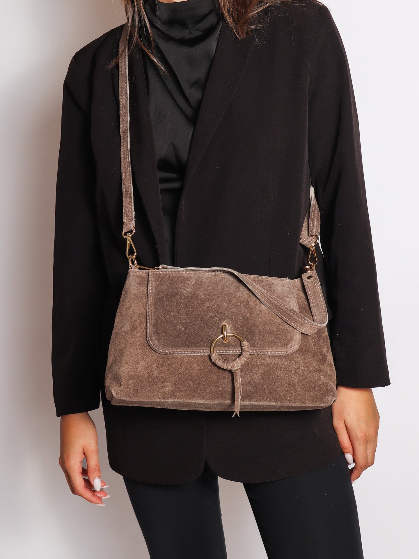 Eleva il tuo stile quotidiano con questa borsa a spalla versatile e sofisticata, un accessorio indispensabile per la donna moderna. Realizzata in pregiata pelle scamosciata, questa borsa incarna l'eleganza senza tempo e la qualità artigianale italiana.
