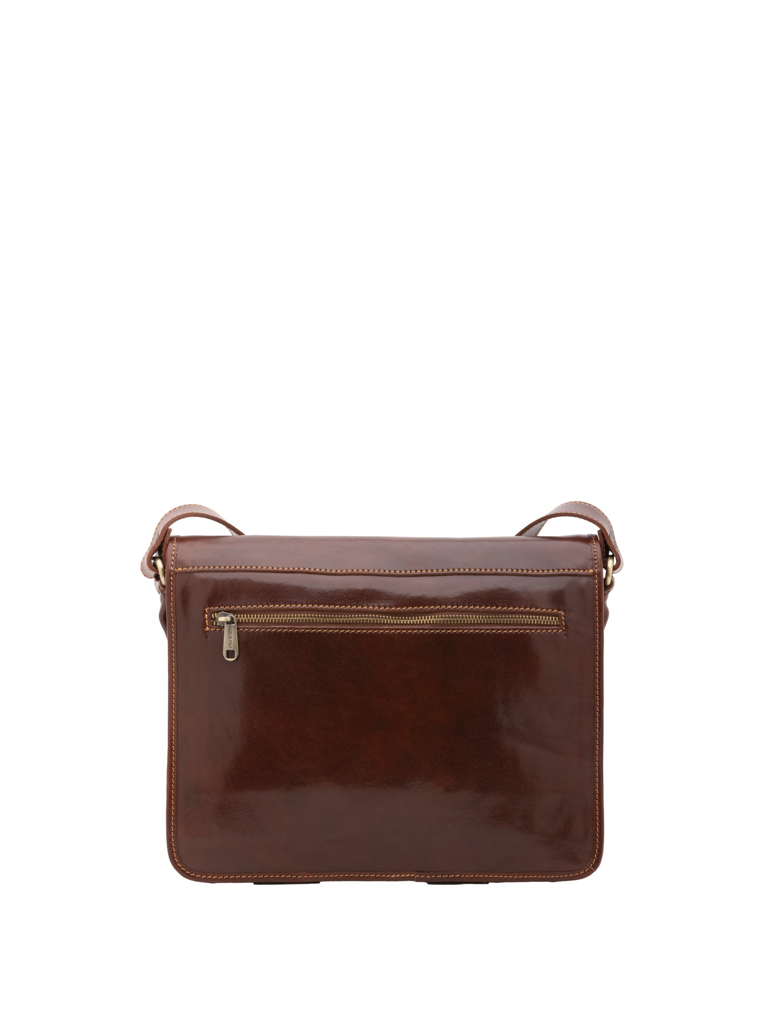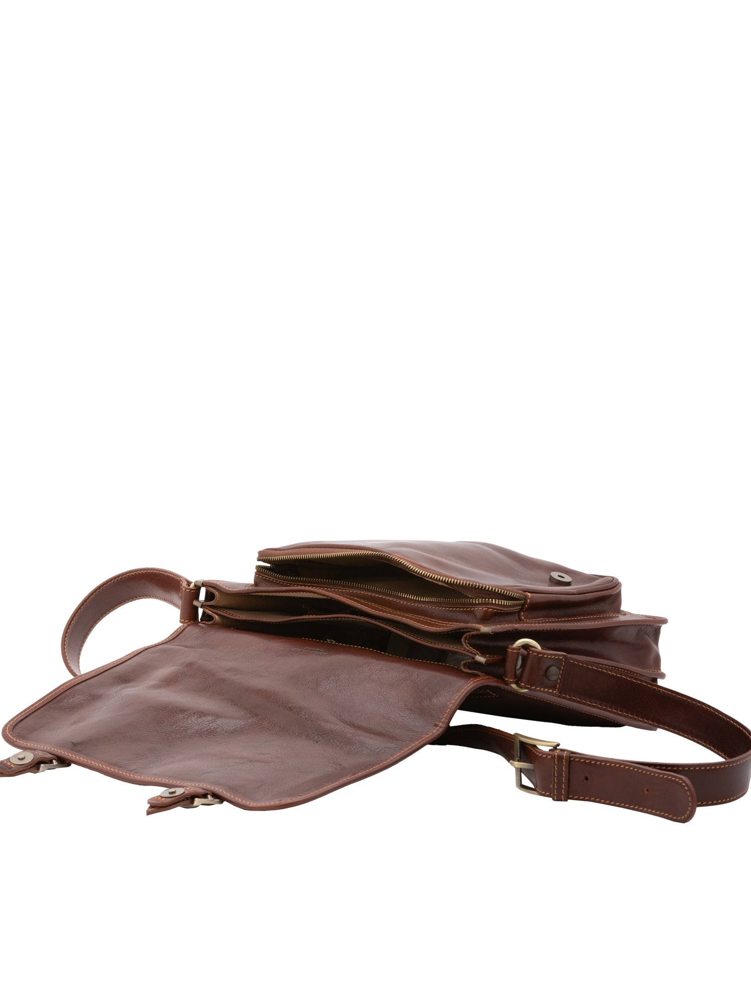Sac bandoulière pour femme. La fermeture est avec un aimant. Les poches intérieures sont une avec fermeture éclair et une ouverte. Les poches extérieures sont une poche avant zippée et une poche arrière zippée. La bandoulière est réglable en cuir. La poignée est manquante. Il y a deux compartiments internes. Le matériau extérieur est en cuir de vachette véritable. L'intérieur est doublé en coton. Dimensions : 35x27x14 cm. Fabriqué en Italie