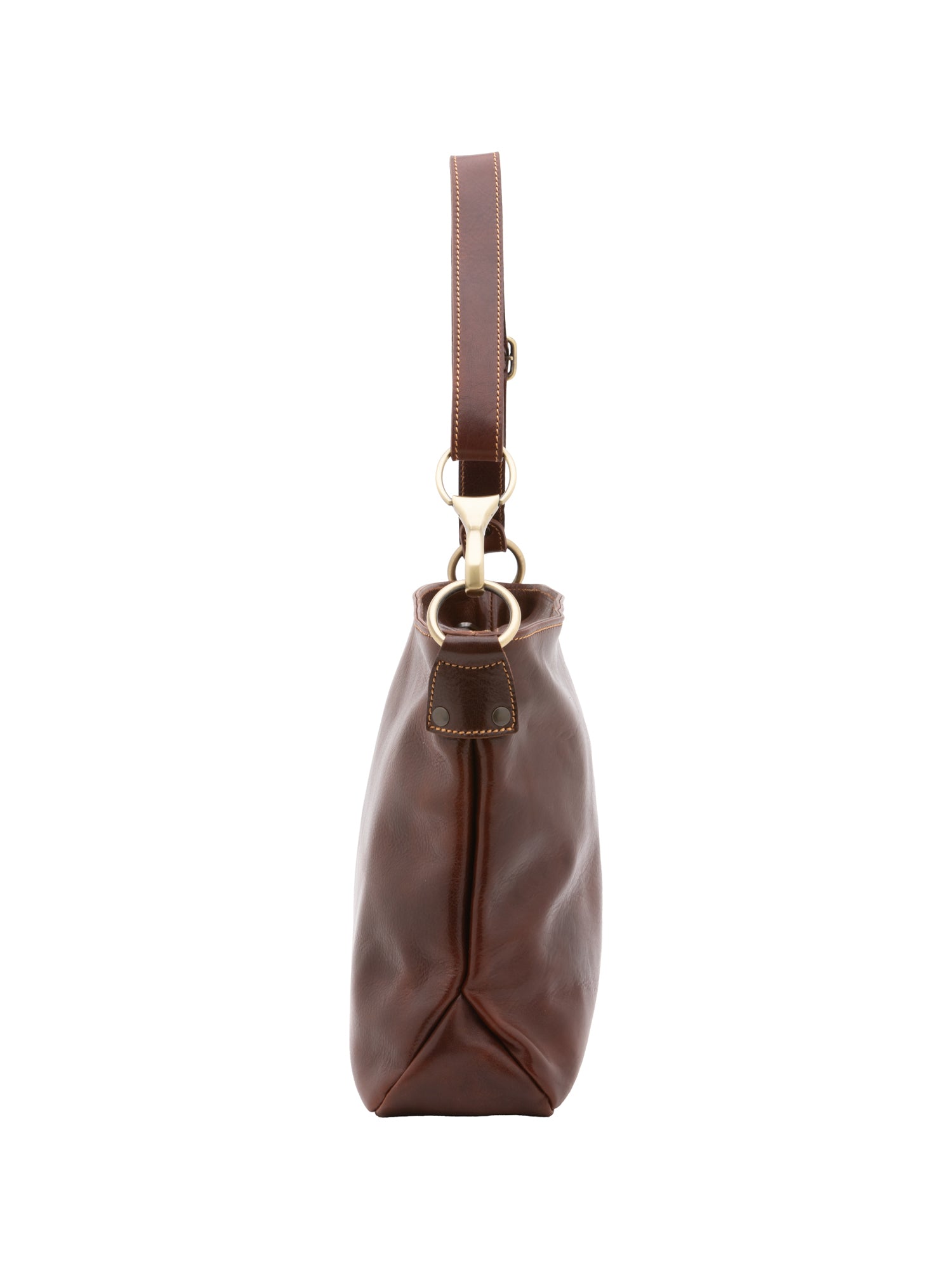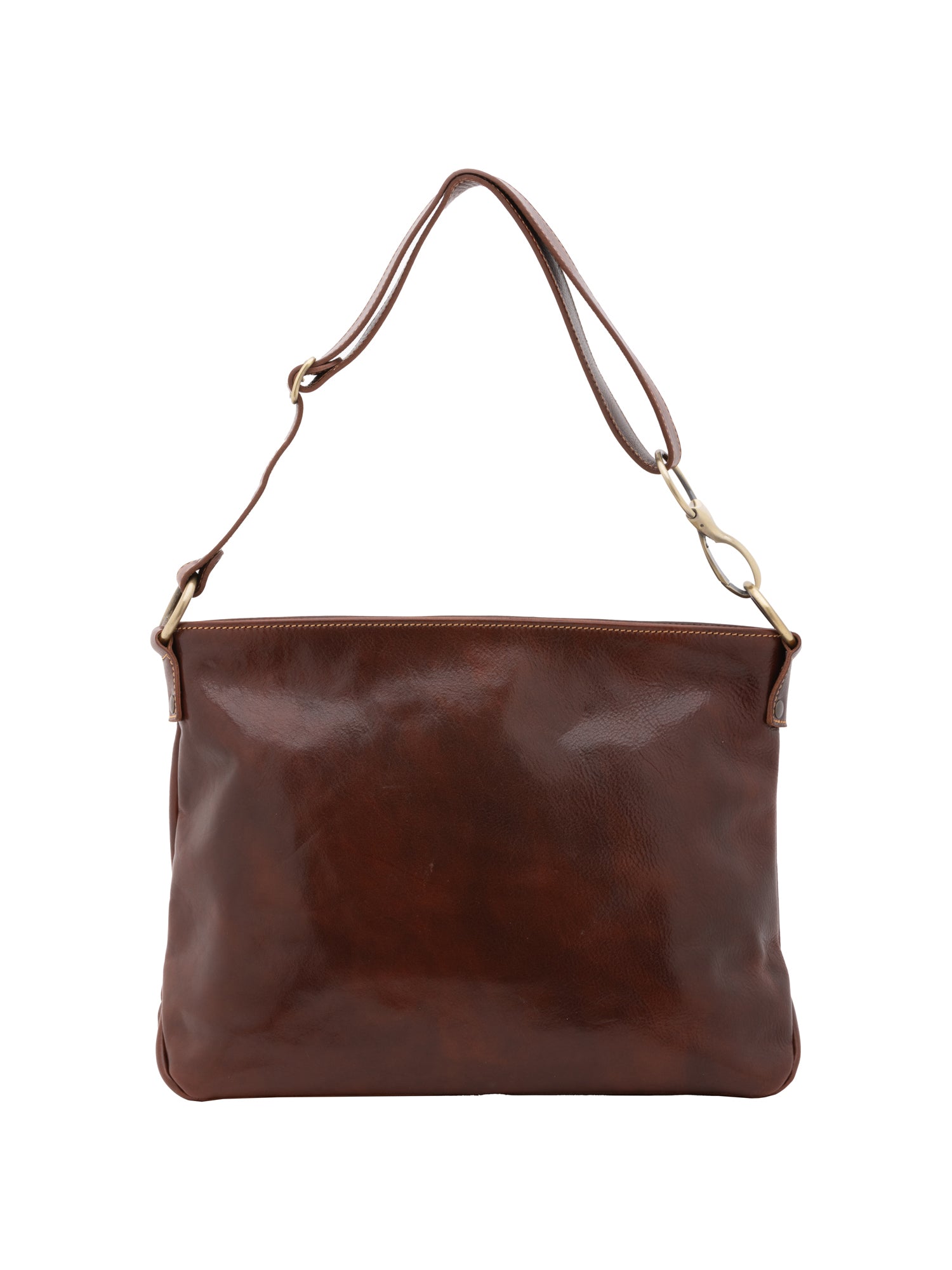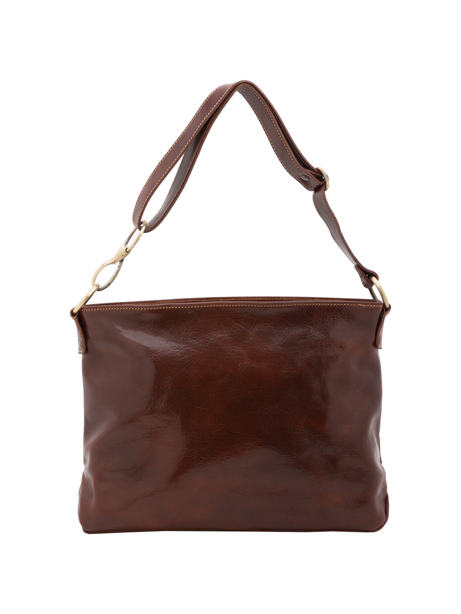 Sac bandoulière pour femme. La fermeture est à zip. Il y a deux poches intérieures avec fermetures éclair. Il n'y a pas de poches extérieures. La bandoulière est réglable en cuir. La poignée est manquante. Il y a deux compartiments internes. Le matériau extérieur est en cuir de vachette véritable. L'intérieur est doublé en coton. Dimensions : 38x29x11 cm. Fabriqué en Italie
