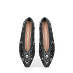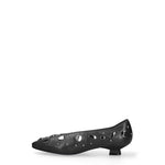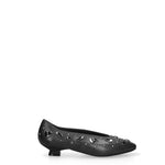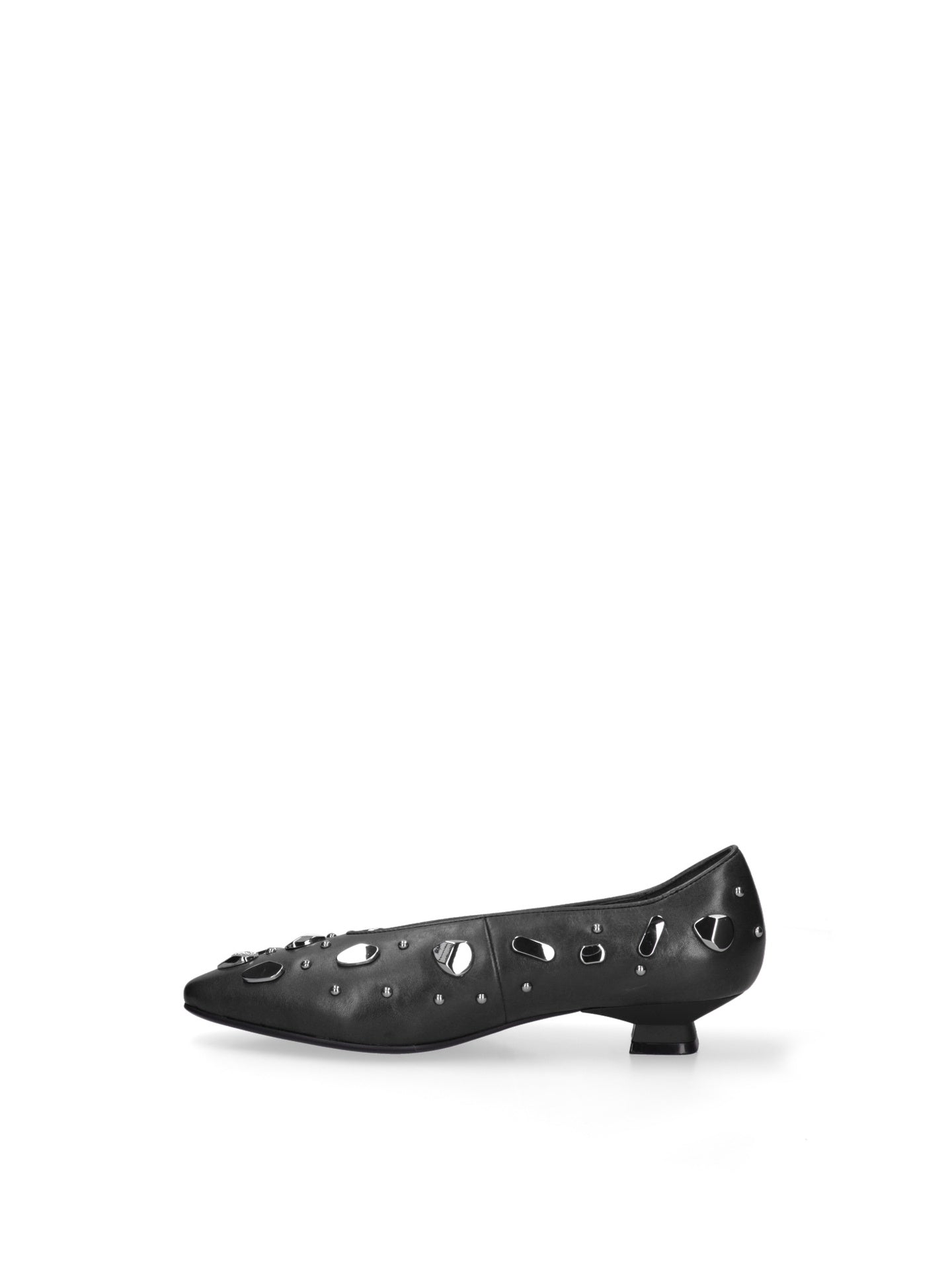 Il dettaglio distintivo risiede nell'originale lavorazione con tagli laser che creano un motivo geometrico e sensuale sulla tomaia, donando un look contemporaneo e sofisticato. La forma a punta affusolata allunga la silhouette, mentre il tacco moderato offre comfort e stabilità senza rinunciare all'eleganza.