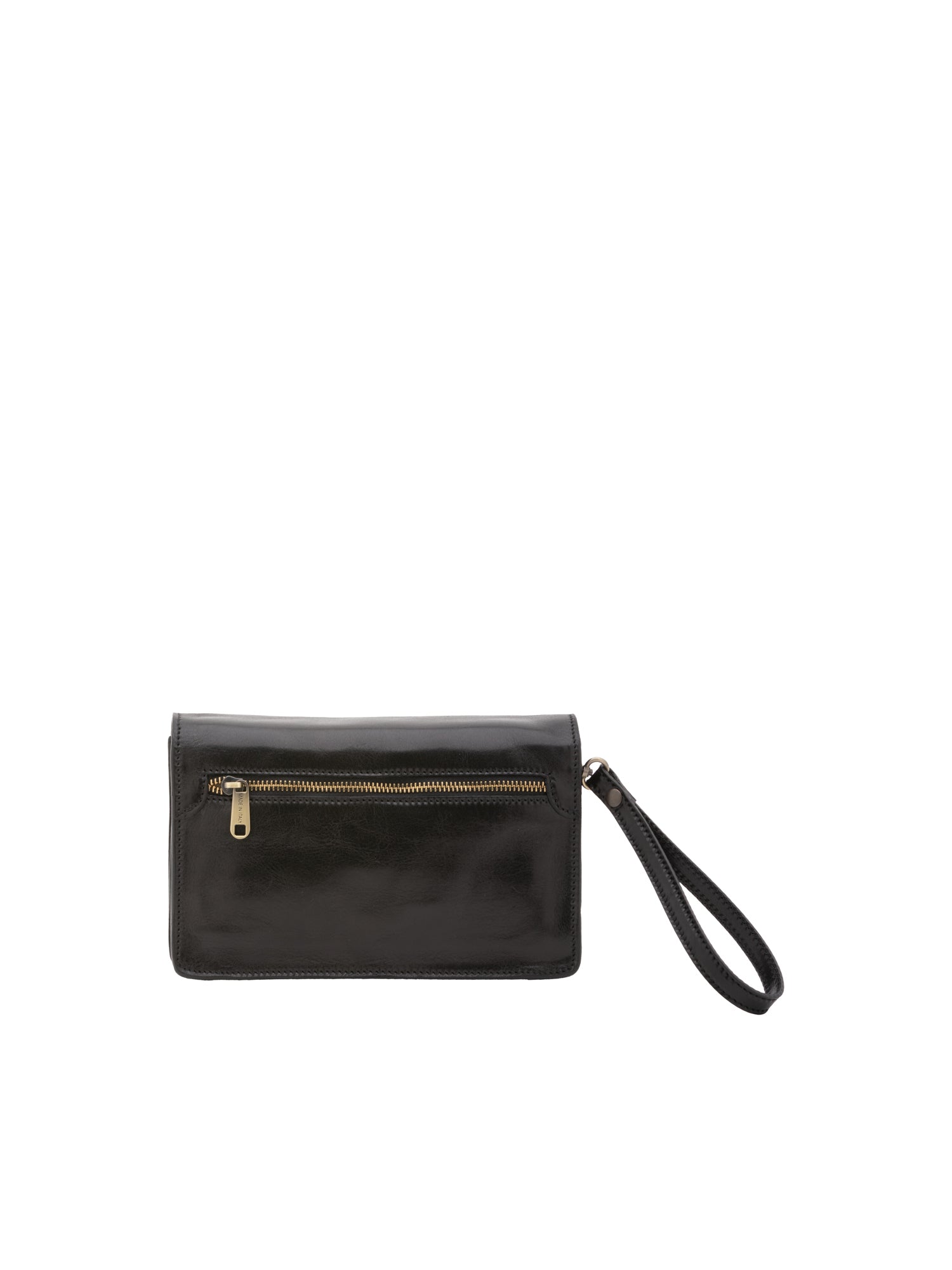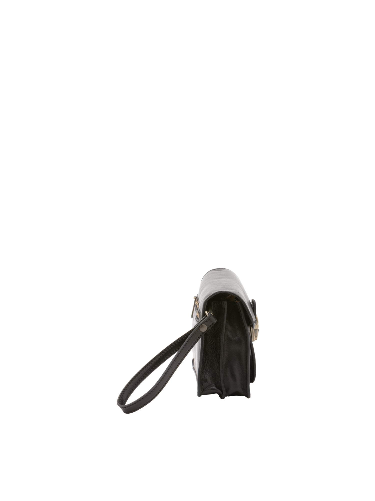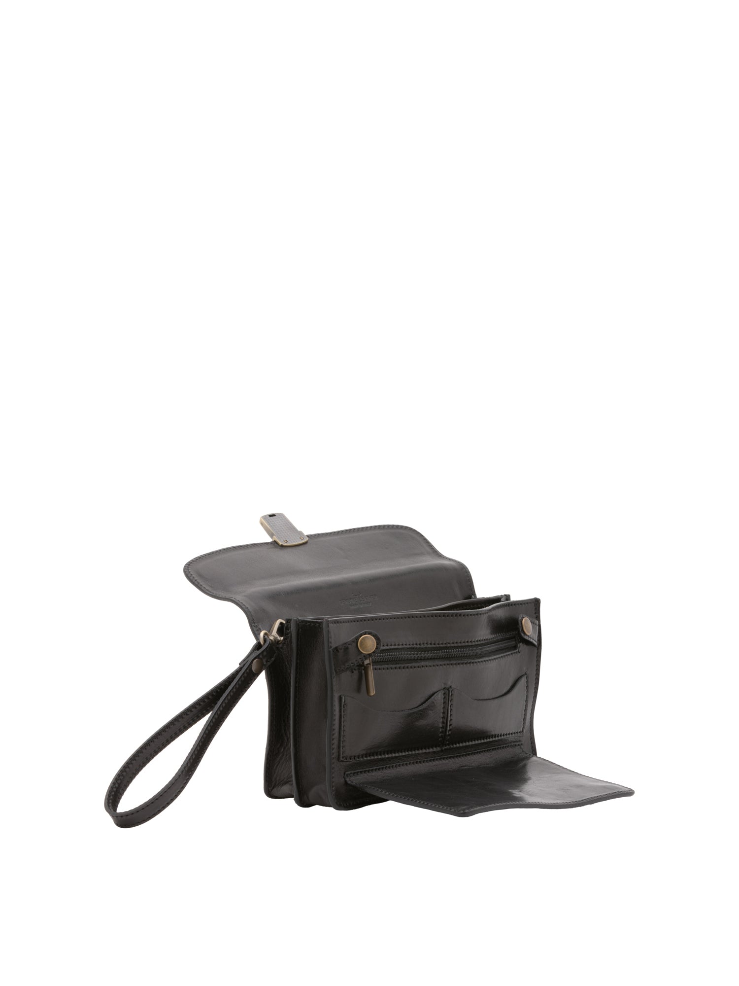 Sac à main pour homme. La fermeture est à pression. Les poches intérieures sont une avec fermeture éclair et deux ouvertes. Les poches extérieures sont une à l'arrière avec zip. La bandoulière est manquante. La poignée est en cuir. Il y a deux compartiments internes. Le matériau extérieur est en cuir de vachette véritable. L'intérieur est doublé en coton. Dimensions : 24x17x8 cm. Fabriqué en Italie