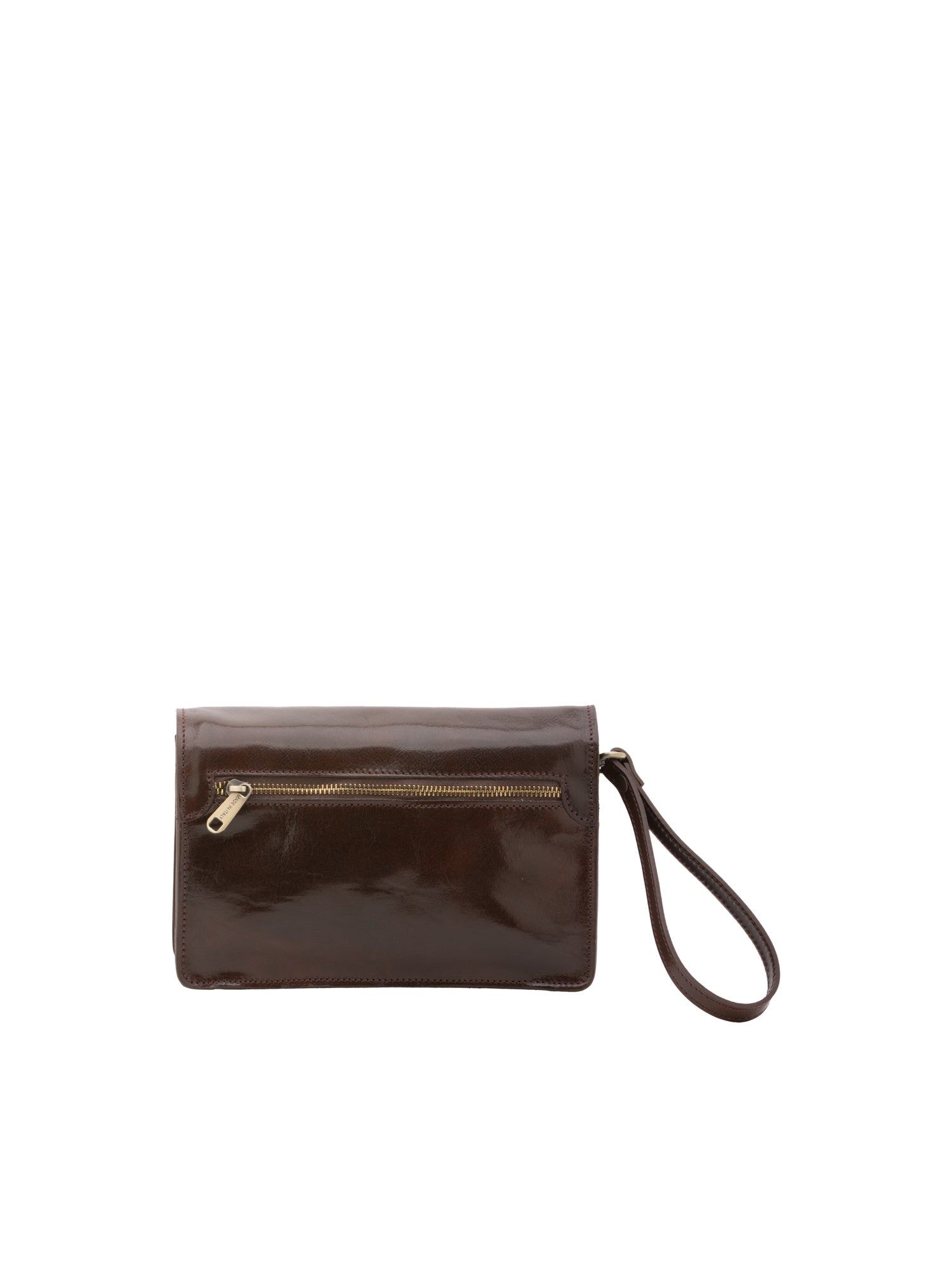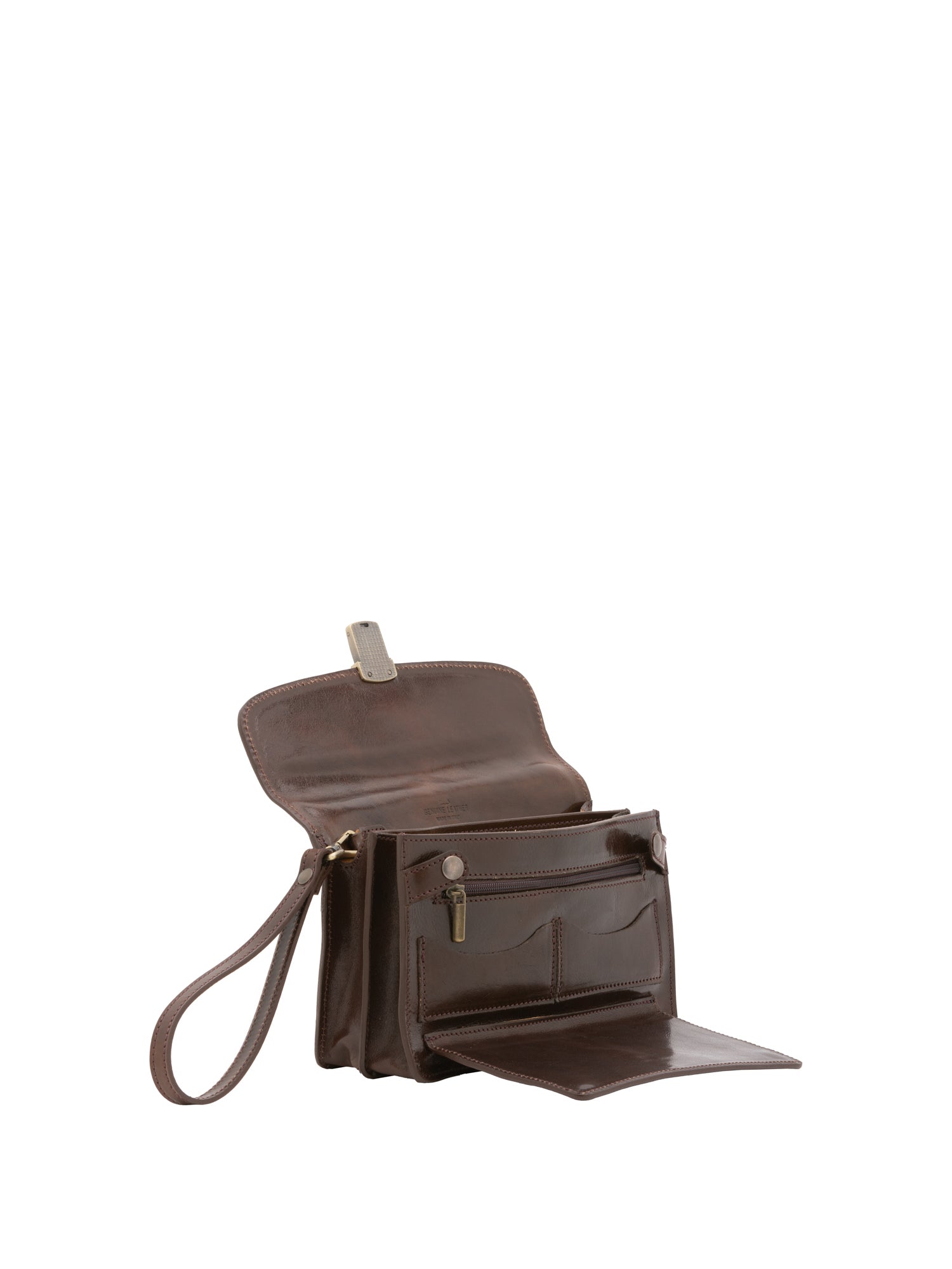 Sac à main pour homme. La fermeture est à pression. Les poches intérieures sont une avec fermeture éclair et deux ouvertes. Les poches extérieures sont une à l'arrière avec zip. La bandoulière est manquante. La poignée est en cuir. Il y a deux compartiments internes. Le matériau extérieur est en cuir de vachette véritable. L'intérieur est doublé en coton. Dimensions : 24x17x8 cm. Fabriqué en Italie